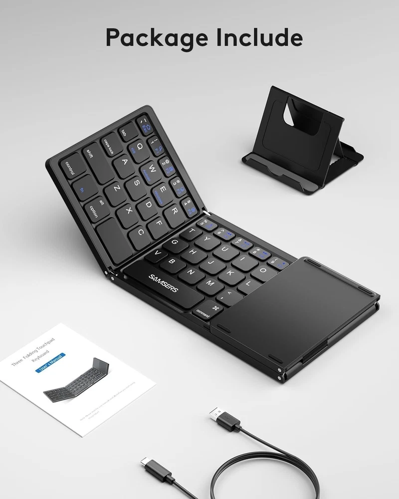 【Folding Bluetooth Keyboard & Phone Stand Holder】Extremely thin design of the portable folding keyboard allows you to fold it up and put it in your pocket or bag without taking up too much space. The phone stand holder, best companion for folding keyboard, gives you perfect screen angle. Near-standard size design provides accurate, fast typing, just like the desktop keyboard you are used to. Quiet keys allow you to focus on your work. Perfect gift for travel and business trips! 【Sensitive Touchpad Foldable Keyboard】Upgrade sensitive touchpad supports multi-touch, so you can control the device without using mouse. More convenient and efficient! (NOTE: IOS 13.4 and below or Android 3.0 and below are not supported!!!) Built-in rechargeable battery can last for 48 hours or 560 hours after 2-3 hours of charging. One full charge last enough for your short business trip or vacation! 【Exquisite & Lightweight Portable Keyboard】Dark Black matte exterior, made of ABS+PC material, lightweight but sturdy, without fear of daily wear and scratches. The elegant matte design, excellent touch and clean look make it a perfect match for your tablet, phone and laptop. Only 5.53-ounce, palm-sized keyboard can be folded up and carried around. Provide you with maximum convenience with minimal weight and size. It must be a good choice for editors! 【Stable Connection & Wide Compatibility】Samsers Bluetooth keyboard supports seamless connectivity to all your Bluetooth devices (iOS, Android and Windows). Maintain a stable connection and provide fast response to the device within 10 m. Simply turn on the keyboard and automatically connect to the last connected device. With a Samsers keyboard, you can record all your ideas at any time! (NOTE: this bluetooth keyboard is not compatible with various computer sticks) 【Satisfaction Service】Samsers provides you with Email Response & Technical Support. If you have any questions, please don't hesitate to contact us!~