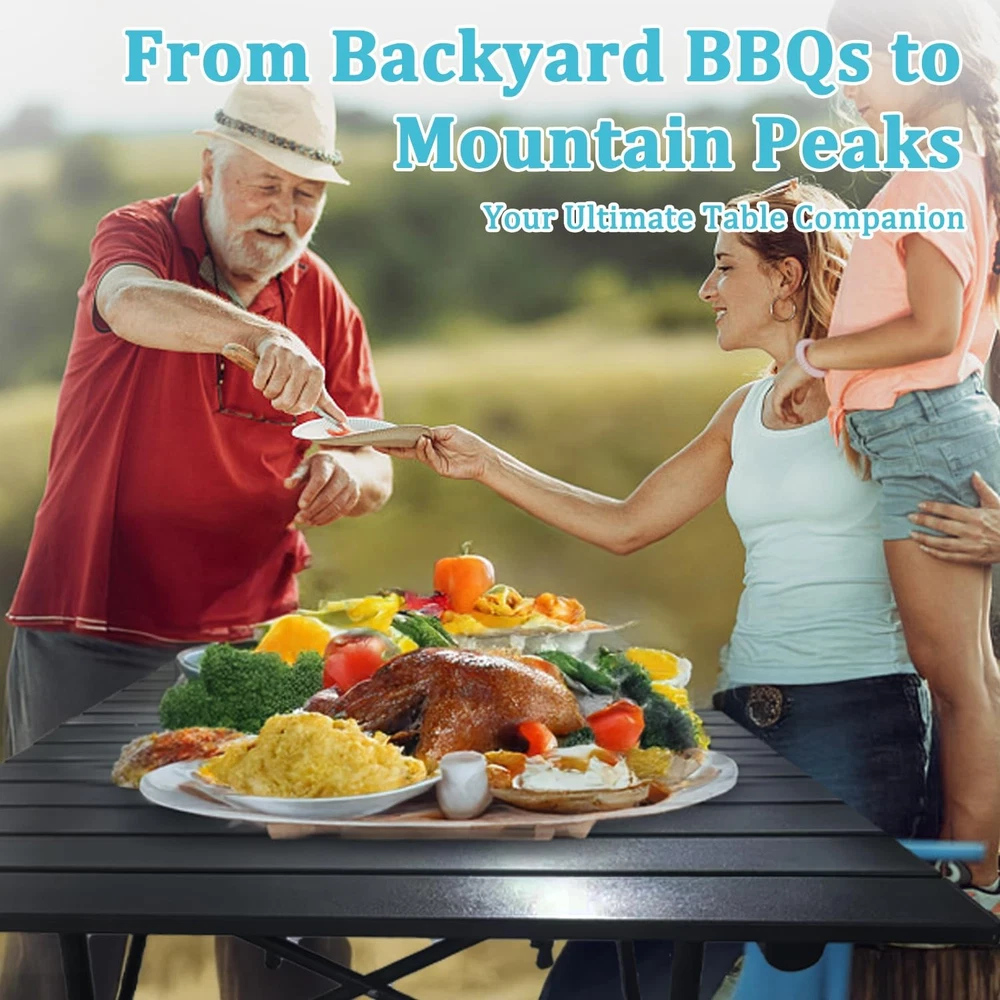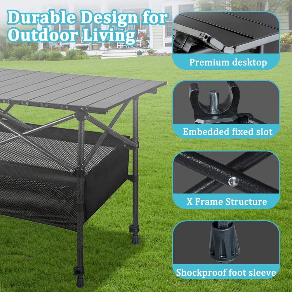 This folding camping features adjustable legs. Its sturdy and stable design ensures reliable performance on most outdoor surfaces. For extremely uneven terrain, using simple supports or leveling tools can help enhance stability.  Yes, the table is designed with a smooth yet slightly textured surface. This thoughtful design minimizes the risk of items sliding off while ensuring an easy-to-clean surface after use. It’s perfect for dining, working, or any outdoor activity. Absolutely! The folding table is lightweight and engineered for a quick and effortless setup by one person. Its intuitive folding mechanism allows you to deploy and pack it up within seconds, making it a hassle-free choice for any outing. 【QUICK ASSEMBLY】With a hassle-free setup, this foldable camping table allows you to open the legs and secure the top to the sturdy steel frame in under a minute. Perfect for on-the-go outdoor enthusiasts who value efficiency 【ADJUSTABLE HEIGHTS FOR VERSATILE USE】The table features two adjustable height settings, making it adaptable to various needs. Whether for a seated meal or standing workstation, its flexibility suits any scenario 【HIGH LOAD-BEARING CAPACITY】Engineered with premium aluminum, this table is designed for picnic and barbecue use. Its sturdy frame supports up to 250 lbs, providing a reliable surface for food, drinks, and grilling essentials while ensuring long-lasting performance in outdoor environments 【ENHANCED STORAGE FOR ULTIMATE CONVENIENCE】Designed with a spacious storage basket underneath, this table offers additional storage for your outdoor essentials. Easily detachable, the basket adds versatility and keeps your picnic or camping area organized 【HIGH-QUALITY TABLETOP】 Whether you're savoring a family meal at a picnic, grilling up your favorite dishes at a barbecue, or hosting a game night outdoors, this scratch-resistant and easy-to-clean surface ensures every gathering feels effortless and enjoyable