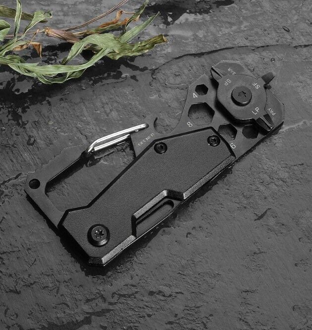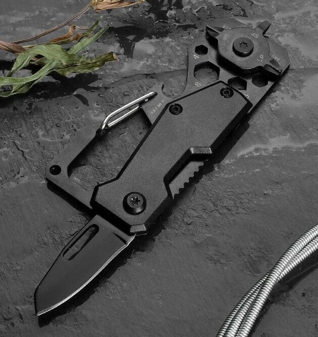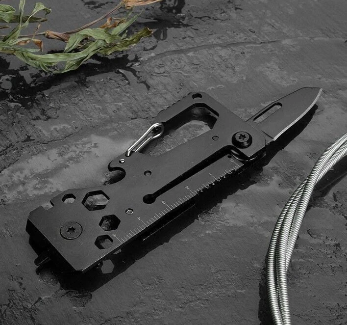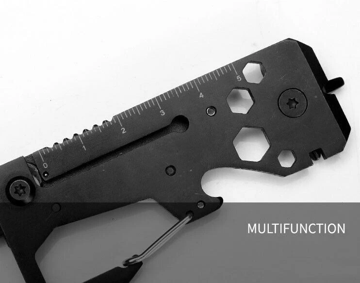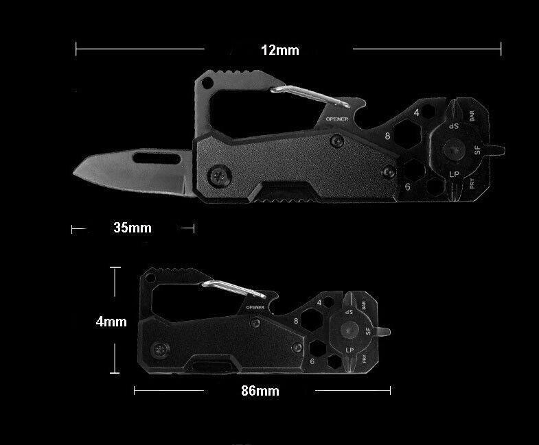 Details: Made of the Stainless Steel + Aluminum Alloy. Foldable design. keychian carabiner, easy to carry. It is a great multi EDC tool, bottle opener, cutter, etc. Condition: New Material: Stainless Steel + Aluminum Alloy Color: Black Open Length: 120mm Close Length: 86mm Width: 40mm Weigth: 50g Package: 1pcs Multi EDC Tool. For Outdoor Hunting, Camping, Fishing, Hiking for Men & Women, for Everyday Carry, Best Gifts