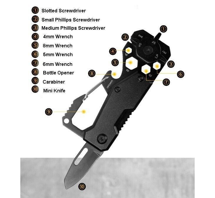Material: Stainless Steel Features: Lightweight gtin13: Does not apply Color: Black Type: Multi-Tool UPC: Does not apply Brand: Unbranded Tools Included: Bottle Opener, Knife, Medium Screwdriver, Wrench Country/Region of Manufacture: China Number of Tools: 10 Blade Length: 35mm Blade Material: Stainless Steel Closed Length: 86mm