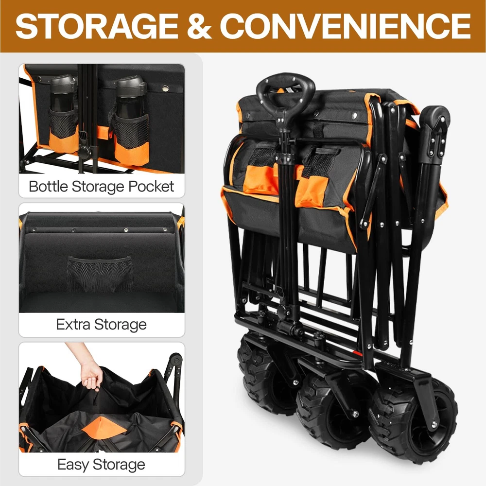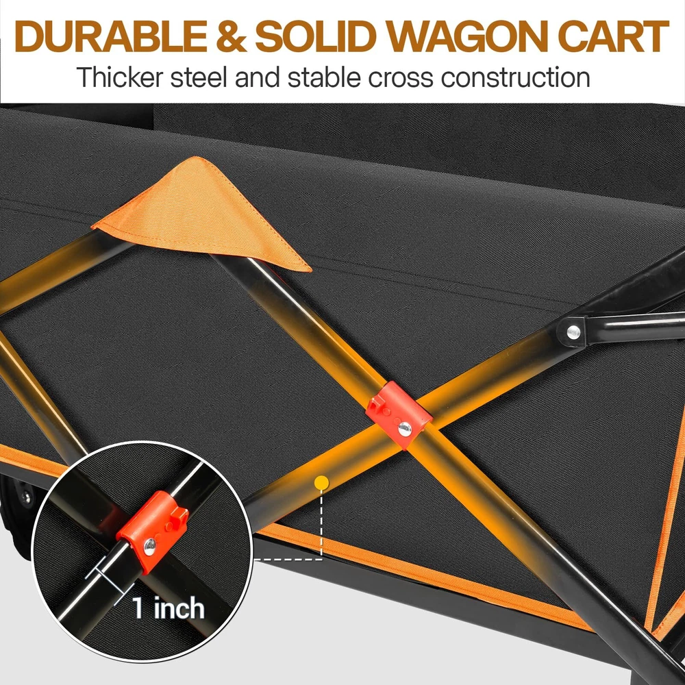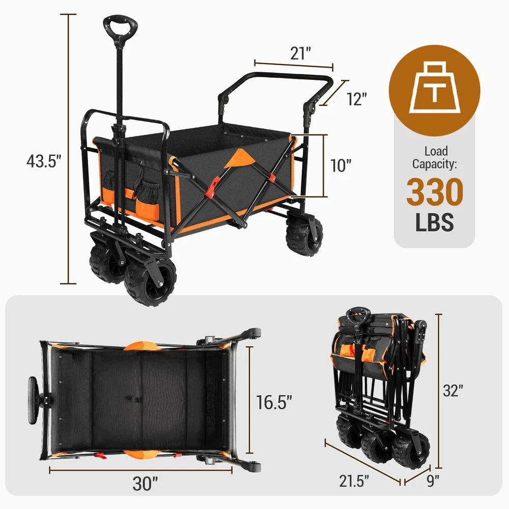 Rear Push Handle Design: This wagon cart has extra collapsible rear handle design, mainly for carrying heavier things, push the rear handle will become more easily and won't get tired for a long time. The large capacity can store more things, very practical. ideal for going to the beach, sporting events, picnics, walking the dog, moving, or even just going to the market for groceries or other shopping trips. Durable Wheels: Its four 7 inch PU tires are made of premium and durable rubber material, has better elasticity, abrasion resistance and puncture resistance. 360° smooth rotation Low noise tires with brake pad in the back can flexible and easy to control the direction. The big wheels for all terrain, can drive on the lawn, gravel, beach, etc. Excellent Quality: This whole foldable wagon cart made of heavy duty steel and features a welded integrated frame, more solid. Its cross design makes the whole construction more stable, and with rust-resistant coating for added durability. Care for Every Details: The front handle can flexible 90 ° adjustable and highly retractable, and the rear handle can be adjusted to the most suitable angle, it also can be folded up to save space when not in use. There are also 2 mesh pockets for conveniently storing bottles. Very practical. Specification & After Sales: This collapsible push wagon cart's bed size is L30''×W16.5'' ×H10''. Load capacity 330 Lbs. products come with a 1-year manufacturer's warranty for quality defects so you can purchase with confidence. If any problem, please feel free to contact us.