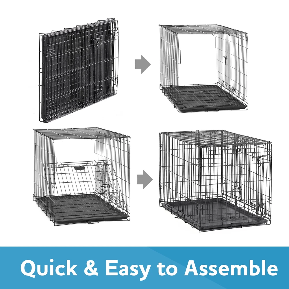 Keep your pet secure with the Double-Door Folding Dog Crate with Divider. It features a heavy-duty, non-corrosive steel frame and a 22-inch double door with locking latches to prevent your animal from escaping. The open wire construction offers visibility and ventilation for your furry friend while the removable floor provides a smooth surface for your dog to enjoy food, water, toys, and treats on while inside. When not in use, it folds flat for compact storage and transport. This kennel can accommodate dogs up to 25 pounds and is suitable for house training and creating a comfortable, den-like space for your dog. Keep your dog safe while away with the Double-Door Folding Dog Crate with Divider.Help your pets live theOur products are specially crafted with one goal in mind, seeing your pet at its very best. With a variety of offerings designed to keep animals healthy, happy and energized, stands out as the brand that truly puts your pet first. Key Features: Strong and durable heavy-gauge steel frame Ideal for house training and creating comfortable containment Suitable for breeds up to 25 lbs Includes a divider for housing 2 smaller dogs Folds flat for easy transport and storage Quick and easy to assemble Removable tray Front and side access doors with dual-sliding latches Provides clear visibility and ventilation