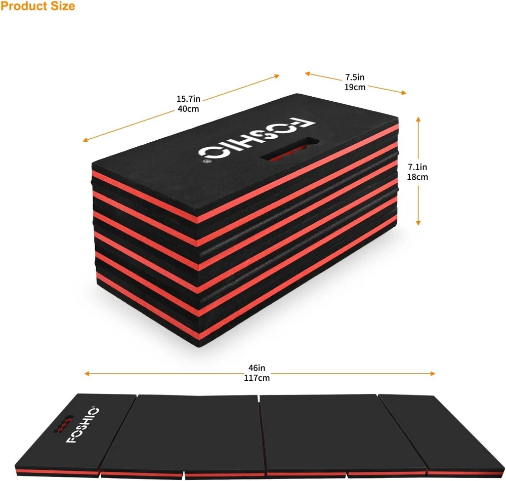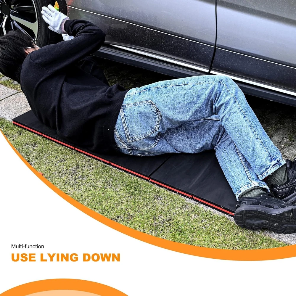 Foldable EVA Mat, Folding Thick Mat with Carrying Handles Mechanic Mat for Working Under Car, Kneeling Mat for Garage, Picnicking, Gardening, Foam Sleeping Mat for Camping, Home Gym Multiple Purposes: This pad can be used for a variety of purposes such as working in the workshop/garage, gardening, cleaning, flooring work, outdoor activities, and is perfect for a mechanic or anyone who knees something to kneel/stand on. Comfortable Folding Mat: Folded up completely it makes a comfortable low stool to sit on. Folded in half it is a great knee saver. Even completely unfolded it is a good knee pad and definitely beats laying on bare concrete. Durable and Thick Mat: The folding mat is made from the nice EVA foam and you can wipe clean with a damp cloth no stain and no marks. The cover has a grippy texture, so you do not slide on it easily, you can even put it on top of a gravel driveway and not puncture it. Carrying Handle: The carrying handle cutout is pretty nicely done, so versatile you can use it for multiple purposes, very comfortable and light to carry around. Easy to Store: You can folds up the thick foam mat neatly and in a few seconds. The folding mat can be conveniently dropped in your trunk or garage. It’s easy to store and always has such quick and easy access to it.
