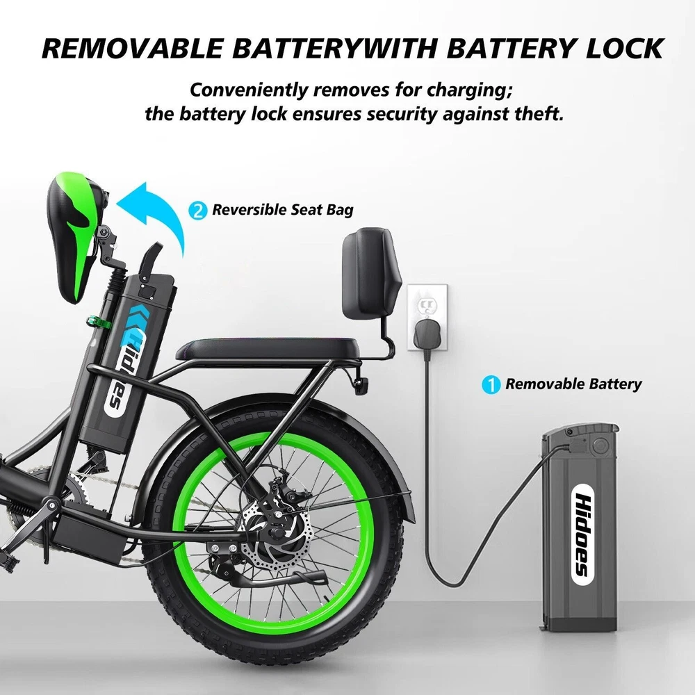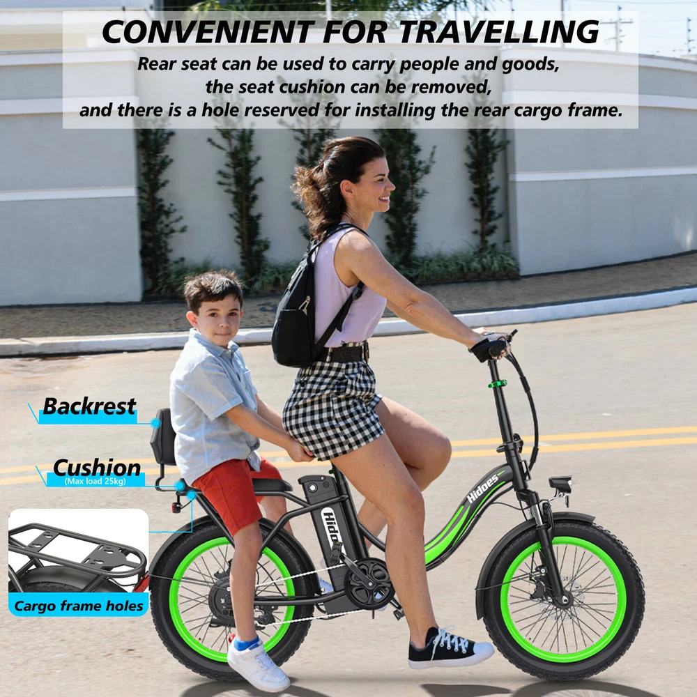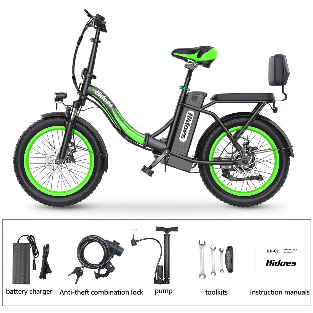 Hidoes 1200W 48V Fat Tire Electric Bike Adults Motor Bikes Bicycle Motorcycles 1069.0 USD Free shipping Hidoes B10 Electric Bike 1000W 48V/13Ah Max Speed 28 MPH Adults Mountain E-Bike 999.0 USD Free shipping Electric Bike E-Bike 1200W 48V 18.2AH Adult Bicycles 26" Fat Tire Mountain Ebike 1299.0 USD Free shipping SAFE & SECURE SHOPPING 100% SATISFACTION GUARANTEED FAST SHIPPING Foldable Electric Bike Adults 21 Miles Long Range Fast Commuter City E-Bike 750W Product Description Foldable Electric Bike Adults 21 Miles Long Range Fast Commuter City E-Bike 750W 20" Fat Tire Folding Electric Bike 750W EBike 48V 13Ah Removable Battery Adults 无标题文档 Model Hidoes C1 Battery 48V/13Ah Power 750 Display Screen Black and white LCD display Max Speed 25-40KM/H Range 25-35KM Max Load 150KG Tire Size 20inch (20"x4.0"Fat Tire) Tyre Type Off-road Air tires Charging time 5~7 hours Frame Material Aluminum alloy Net Weight 30KG Gross Weight 38KG Package Size 142*24*75CM Break Front and rear disc brake Light Front LED headlights and taillights Adapter Input 100-240V~50/60Hz 2.5A, Output 54.6V 2.0A Maximum load and speed may vary depending on rider weight, riding style, temperature and terrain. The item is UL 2849 certified with a link to the UL Product iQ