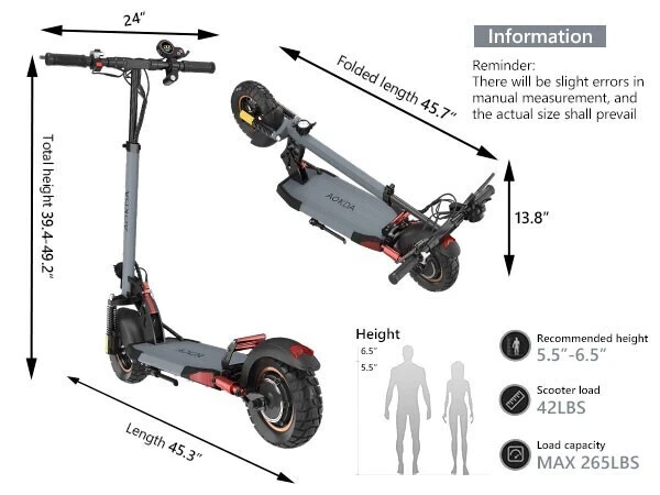 🛴New Way to Across the City Freely - The AOKDA electric scooter for adults which is powered by 48V/12.5Ah battery, makes it easier for you to complete daily travel. One charge is enough for you to ride for 20 miles under specific conditions. Max load 265 lbs. 🛴Let You Ride As You Want, Easy to Drive - Our e-scooter has three different riding modes (Eco: 15Mph, D: 22Mph, S: 28Mph), you can choose the most suitable mode for you according to your needs, and the strong 800W brushless motor allows you ride speed up to 28Mph. 🛴Comfortable Riding Experiences, Enjoy Every Trip - Our electric scooter for adult adopts front and rear wheel suspension system and 10-inch pneumatic tires, which means you can enjoy a smoother and more comfortable riding experience, even on rough roads. 🛴Make Riding More Safety - Our e-scooter for adult is not only equipped with super bright headlight & taillight, but also has a side ambient light, which improves the safety of night riding and allows you to travel with peace of mind at any time. The perfect front & rear dual brakes and electronic braking system allow you to stop whenever you want. 🛴Easy to Fold & Carry - You can fold the electric scooter for adults with two-steps only in a few seconds for carrying and storage. The unfolded size: 45.28"L x 23.62"W x 47.24"H. The folded size is 45.28"L x 8.66"W x 17.72"H, easy to put in your garage or office. 🛴Buy with Confidence - We have always focused on the quality and technical improvement of electric scooters. Our adult electric scooter is designed to be the most sturdy and powerful electric scooter which will quickly become your favorite commuting or outdoor travel companion. We offer 180-days warranty for different parts, contact us to get fast and professional service. 🛴【Important Note】- The max speed and max range per full charged vary based on several factors, including: rider weight, riding surface, incline, ambient temperature, battery level, riding style (stop/start vs cruising), etc. Q&A: How fast can the electric scooter go? Top Speed: 28MPH / 45KMPH (the speed greatly depends on the rider weight, road condition, riding mode...etc) How long do the electric scooter last? Well, with proper care and maintenance, this e-scooter can last anywhere more than 5 years or even longer. What are the benefits of this off road electric scooter? This off road electric scooters with high power motor, fast, portable, and with detachable seat. Not only good for off road riding, but also good for urban commuting. It also save you money on gas because they can be charged quickly. Do this electric scooter work in the rain? Well, it support IP6 waterproof. It's OK to work in small rain, but not recommend in heavy rain. And the pedal of the e scooter cannot be submerged in water. Or the battery and controller will be damaged. iENYRID ADULT ELECTRIC SCOOTER 2400 Dual Motor LONG RANGE 60KM HIGH SPEED 37MPH 1099.0 USD Free shipping AOKDA A1 800W Electric Scooter Up to Speed 28Mph 10in Folding Commuter E-Scooter 455.0 USD Free shipping Adult E-Scooter,Electric Scooter 800W 28MPH,30KM Range eScooter,Free Shipping US 464.25 USD 619.0 USD Free shipping 25% off Electric Scooter Adult Folding E-Scooter 2OOO Dual Motor Off Road Waterproof US 1059.0 USD 25.0 USD with Seat Electric Scooter, Commuter Foldable E-Scooter 28 mph,Free Shipping USA 619.0 USD Free shipping 800W Motor Electric Scooter Teens 28Mph 48V 10in Folding Fast Speed E-Scooter US 619.0 USD Free shipping Electric Scooter Adult 800W 28MPH,30KM Range 10'' Folding eScooter,PRO E-Scooter 464.25 USD 619.0 USD Free shipping 25% off Adult Folding Electric Scooter 900W Peak Motors Speed 28MPH Safe Urban Commuter 589.0 USD Free shipping 800W Electric Scooter Adult with Seat Folding E-scooter Urban Commuter 28MPH LED 514.01 USD 658.99 USD 50.0 USD 22% off ES10 Folding Electric Scooter 2000W 48V 20Ah 31Mph Dual Motor 10in Off-Road Tire 859.0 USD Free shipping 48V 800W Folding Electric Scooter 28MPH Urban Commuter Adult E-Scooter With Seat 539.99 USD 50.0 USD Adult Folding Electric Scooter 2OOO 34Mph Dual Motor 10'' Off-Road Tire eScooter 869.25 USD 1159.0 USD Free shipping 25% off 800W Electric Scooter for Adults 22-31 Miles Range 10" Tires Folding E Scooter 538.98 USD Free shipping iENYRID Electric Scooter Adult Folding E-Scooter 8OOW Motor Off Road Waterproof 512.99 USD 539.99 USD Free shipping 5% off iENYRID Electric Scooter Adult Folding E-Scooter 800W Motor Off Road Waterproof 512.99 USD 539.99 USD Free shipping 5% off 800W Motor Folding Commuter Electric Scooter w/Seat 28MPH for Adults & Teens US 538.99 USD 50.0 USD Electric Scooter Dual Suspension &Brakes Adult Folding E-Scooter 800 Motor 28MPH 464.25 USD 619.0 USD Free shipping 25% off 28MPH E-Scooter Fast Powerful Urban Commuter Long Range 2 Wheel Electric Scooter 593.1 USD 659.0 USD Free shipping 10% off