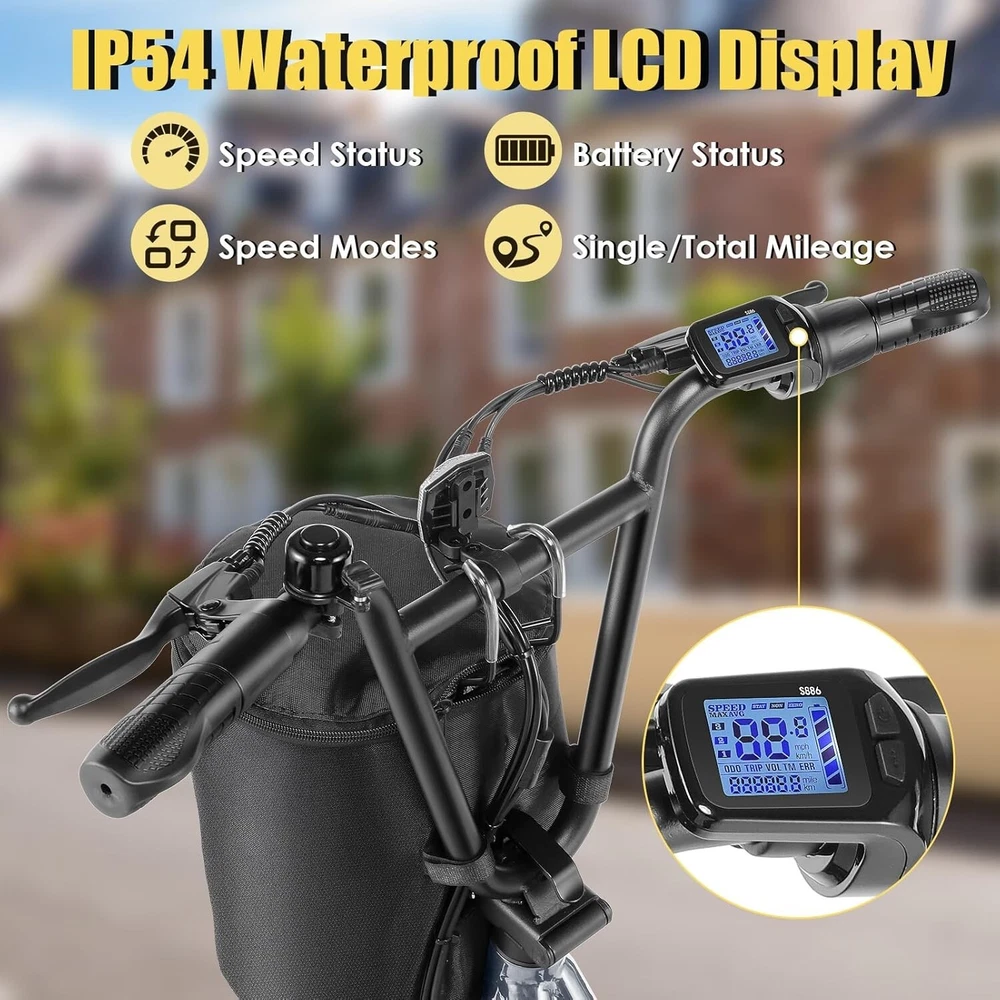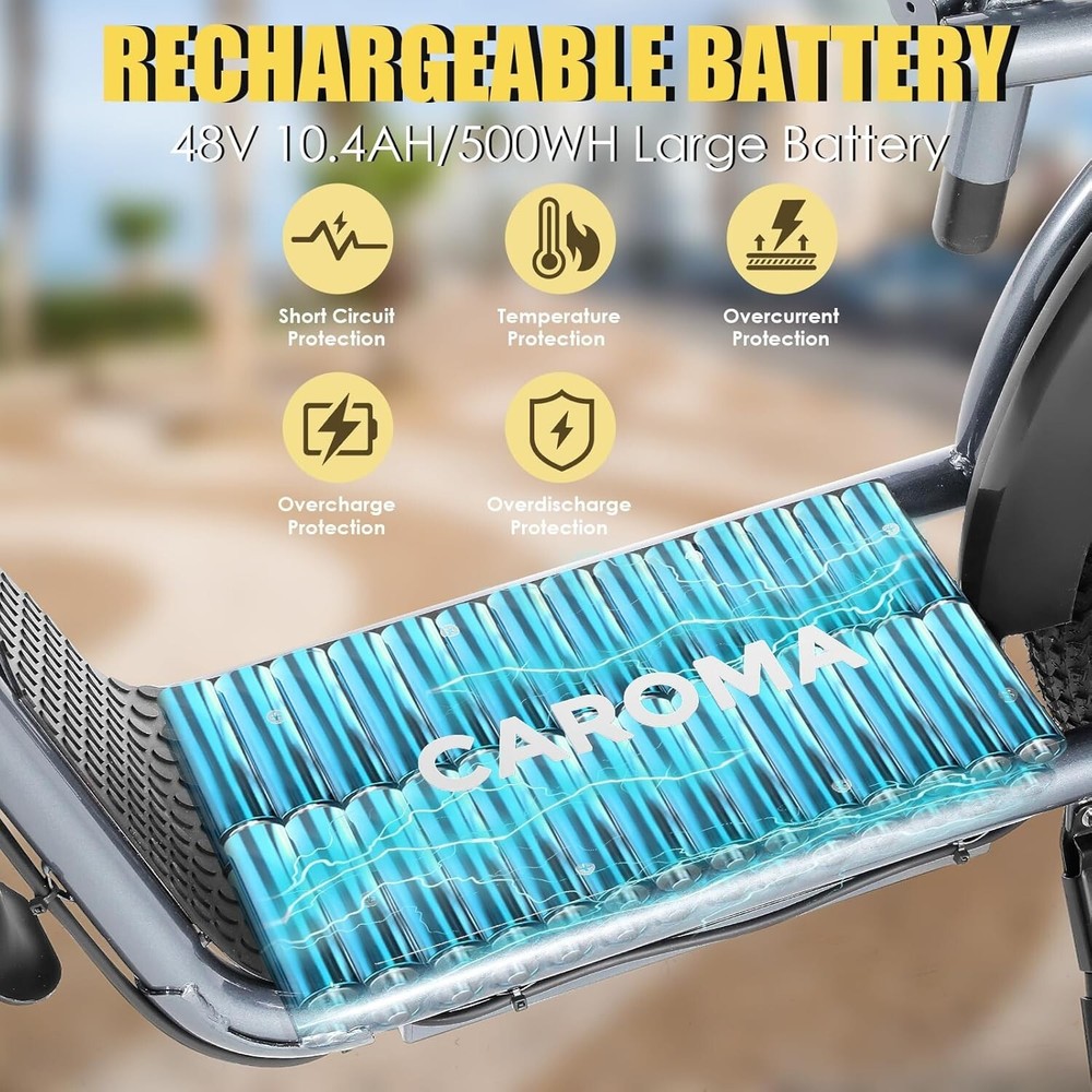 Product Description About this item 【20"X3" Fat Tire】Puncture-proof 20"*3" oversized fat tires can provide superior grip, stability and comfort on various terrains. Whether on sand, mountain roads, snowy roads or various terrains, Caroma electric scooters can bring you a comfortable riding experience. 【Upgraded Brushless Hub Motor】The upgraded 500W(Peak 819W) brushless hub motor has stronger climbing ability. In pure electric mode, it can reach speeds of up to 20MPH(32KM/H) and easily conquer slopes of up to 15 degrees. For all your riding needs. 【Long-lasting Battery Life】High-capacity lithium battery (48V/10.4Ah) certified by UL 2272, which can travel up to 30 miles (48KM) per full charge. Equipped with safe and reliable fast charging technology, it only takes 5-6 hours to fully charge, making it ideal for short trips, picnics, and shopping. 【Off-road Suspension System】The electric scooter is equipped with 2 front fork spring shock absorbers, 2 seat shock-absorbing springs and 2 puncture-resistant 20"X3" fat tires, which can effectively absorb ground impact while riding and provide better control. Combined with front and rear mechanical disc brakes and an EABS system, you can enjoy a comfortable ride and powerful braking, even on steep slopes, rough terrain, or other extreme terrain.