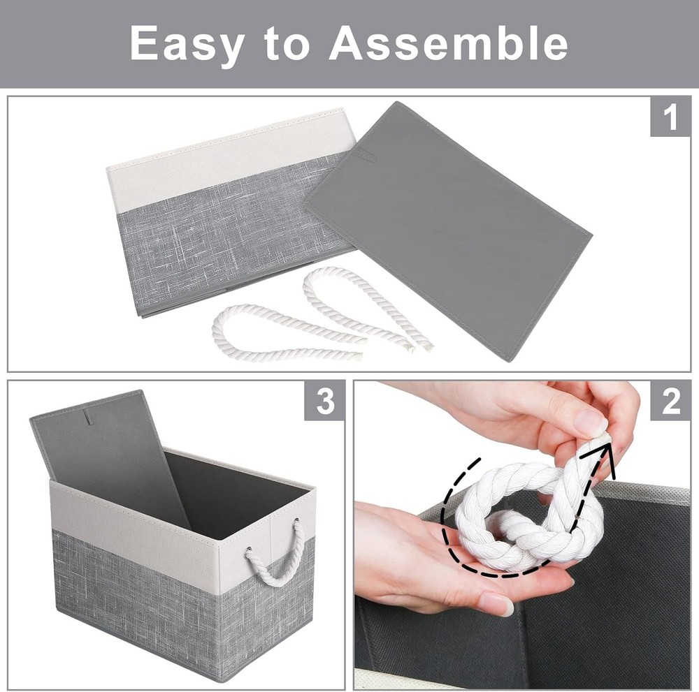 Fab totes Storage Bins [3-Pack], Foldable 3Pack, White & Grey Product Features Premium Fabric: The storage bins are made of stiff cardboard on the bottom and all sides walls so that the organization bins stand on their own, even when empty; sturdy materials ensure that these storage containers are strong and long-lasting Spacious Capacity: Fabtotes storage basket measures 15" x 10" x 9.5"; this large size enables you to store a wide variety of items to keep your home tidy and organized Reinforced Handle: The bins for organization come with two sturdy rope handles made of soft rope to easily pull or lift the bin.; the organizer bin is stitched with a metal ring where the handle is connected to ensure durability and tear resistance Collapsible Design: The fabric storage cubes can be folded flat when not in use to save space or transport; fabric baskets are easy to clean, simply dust with a soft dry cloth Multi-Purpose: The basket organizer is a perfect option for organizing toys, magazines & books, CDs, clothes & towels; the collapsible storage cubes can be easily stored in closets, drawers, shelves, etc