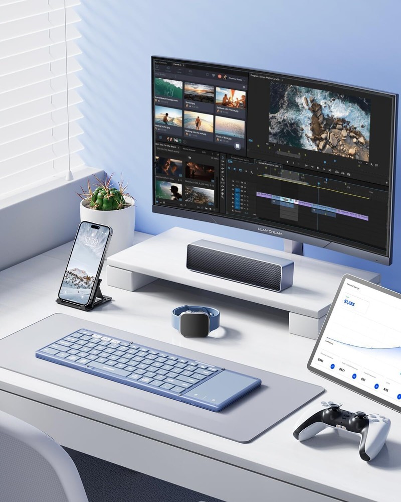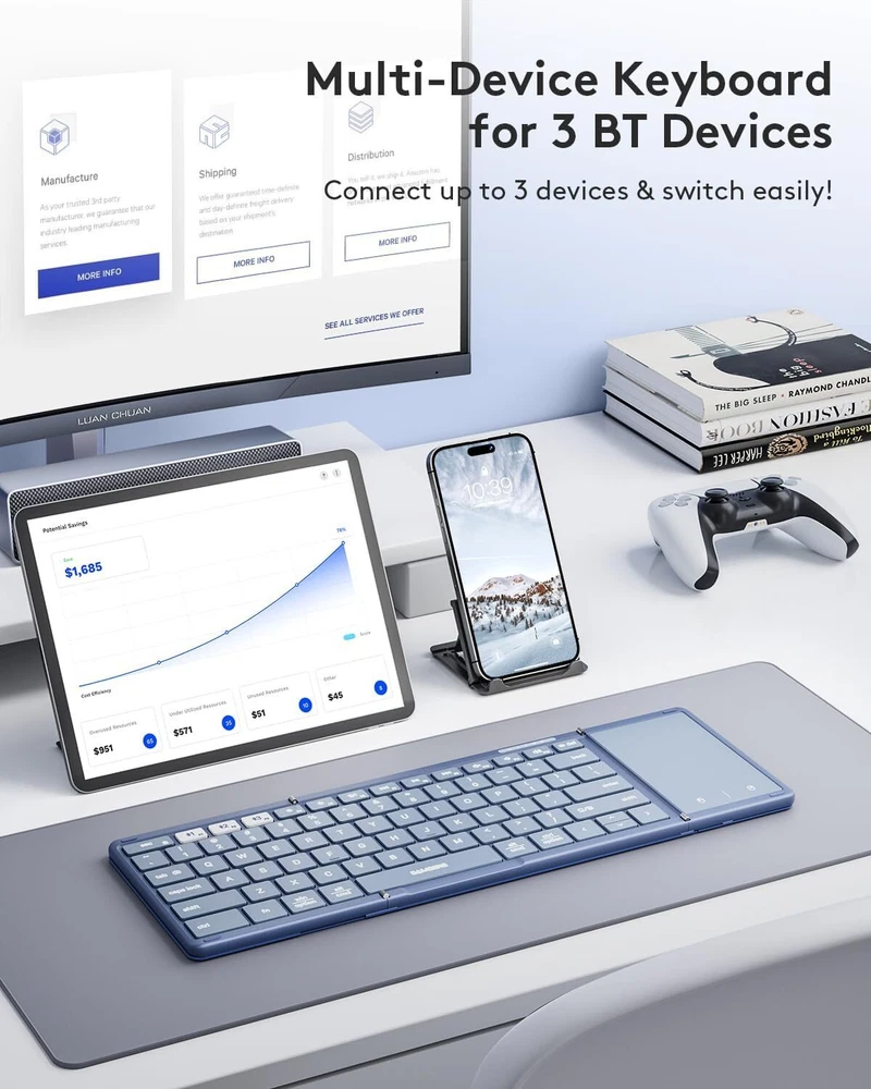 Product Description Foldable Bluetooth Keyboard with Touchpad, Full-Size Wireless Folding Keyboard with PU Leather, Portable Travel Keyboard for iOS Android Windows Mac OS, Support 3 Devices (BT5.1 x 3), Blue 【Full-size Folding Wireless Keyboard】 foldable keyboard is designed with standard size (unfolded size: 13.5 x 4.5 inch) and 0.63 inch standard keys, more in line with finger size and typing habits. Innovative seamless metal hinge, allow you to adapt to its layout anytime and anywhere. Quiet scissor-switch keys and non-slip PU leather at the bottom, so that you can fully concentrate on your work! 【Connect up to 3 Devices】 multi-device Bluetooth keyboard supports 3 devices to connect at the same time, seamless switching without delay (Bluetooth 5.1 x 3). Compatible with Windows, Mac OS, iOS or Android. You can type, switch, and keep typing on your iPad, phone, tablet, or laptop! 【Multi-touch Trackpad Foldable Keyboard】Upgraded larger sensitive touchpad supports multi-touch and mouse function, allowing you to control your device without a mouse. Built-in rechargeable battery can last up to 70 hours or standby 120 days after a 2-3 hour charge. One full charge is enough time for your short business trip or vacation! (Note: Type-C charging cable included) 【Delicate Portable Keyboard】Blue PU leather appearance, made of ABS+PU material, lightweight but stable, no need to worry about daily wear or scratches. Elegant layout design, excellent tactile feel and simple appearance make it a perfect match for your tablet, phone and laptop. The Great gift for travel and business trips! 【Little Things & Big Convenience】 portable folding keyboard, only 9.3 ounces. Palm-sized keyboard can be folded up magnetically and put in your briefcase without taking up much space. Maximum convenience for you with minimum weight and size! Comes with a phone stand and a velvet storage bag, the perfect companion for a folding keyboard. Not just a keyboard, but a travel solution! About Us We are a reputable seller with many years of experience selling on eBay. Our goal is to provide high-quality products and excellent customer service. Shipping Items will be shipped within 1-3 business days when we received payment. (Orders are not processed on weekends & holidays) Tracking information will be sent once item is shipped. Delivery time depends on destination and other factors Item is shipped to ebay address. Leaving correct address can minimize delay. For international shipping and shipping to Guam, Hawaii and Alaska, Please contact us before placing the order. International buyers please note: Import duties, taxes and charges are not included in the item price or shipping charges. These charges are buyer’s responsibility. We will try our best to reduce the risk of the custom duties. Local pick-up is unavailable at the moment. Contact Us We reply any email messages within 1 business / working days(off-duty at weekend). If you do not get a response from us, then please check your junk or spam mailbox. Our Business hours: Mon-Fri 9:00-18:00, UTC/GMT +8 hours. Please contact us either by clicking "contact seller" in the "purchase history" section or simply click "ask a question" at the bottom of this page. If you are unsatisfied with our item or service, please contact us before leaving any feedback. We are committed to resolve all issues in a friendly and satisfactory manner.
