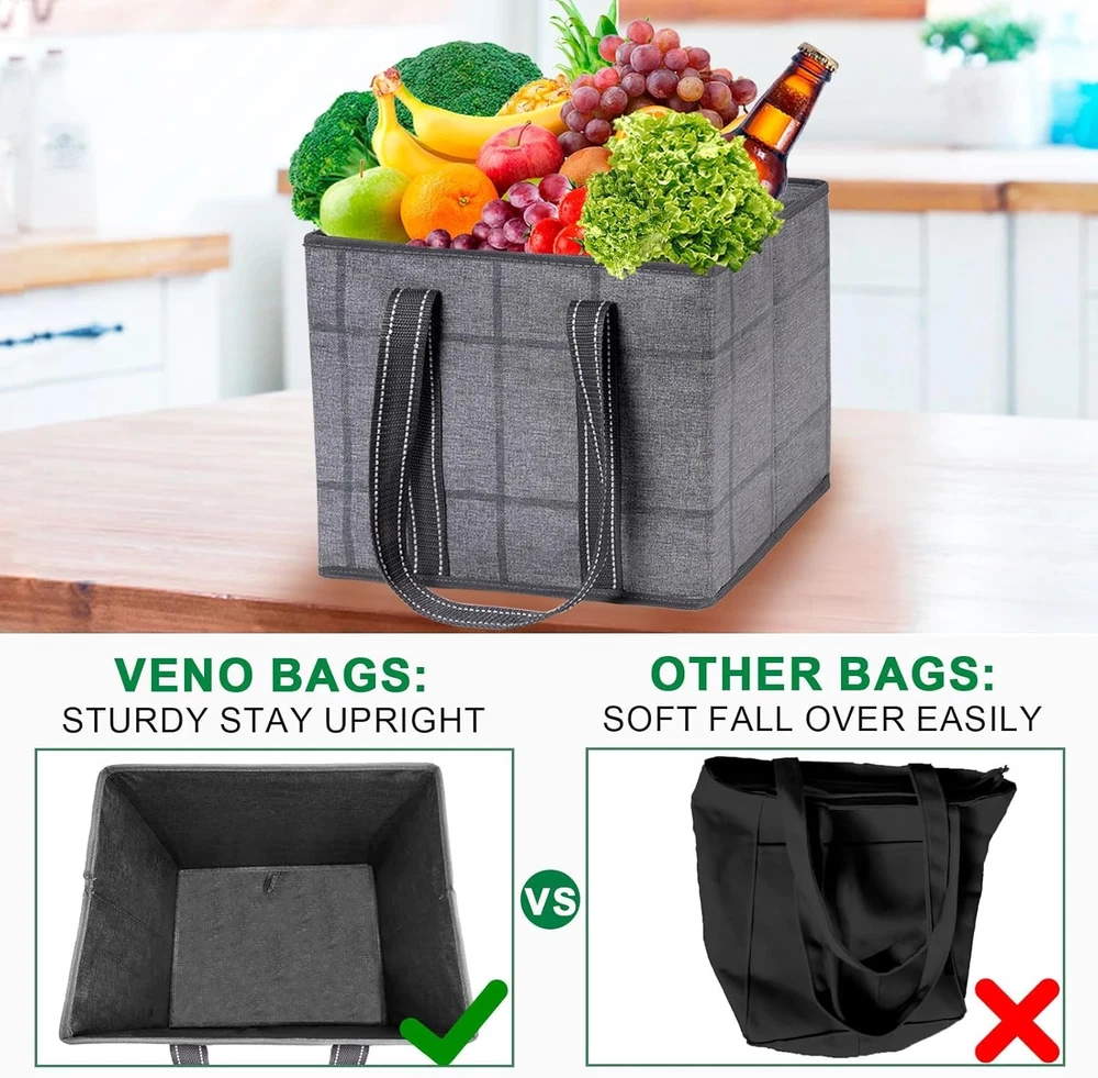 Stands Upright & Stays Open with Hard Bottom – Avoid worrying about your floppy grocery shopping bag falling over in the trunk or struggling to keep it open. Shop easily with a sturdy box-shaped bag by VENO which contains a hard bottom and prevents your bags or groceries from falling over, rolling around, or getting smashed in your car trunk, shopping cart, or at checkout. Reach in whenever you need, easily and quickly load and unload, and keep items put with its amazing standing ability. Organize As You Shop – Shop easier by placing 3 bags in your shopping cart and organize purchases as you go. Separate your delicate bread or eggs and fresh fruits and veggies from your frozen meats and heavy drinks. Take advantage of the versatility and place them in your car trunk as organizers for miscellaneous items or use as laundry baskets, storage bins, utility bags, food delivery bags, or even Christmas gifts! Dimensions - 13” W x 11” H x 10” D. Spill-Proof & Easy to Clean – You don’t have to be concerned about getting your grocery bag dirty or stained with our water-resistant and durable 220 GSM PP-woven material which is extremely easy to maintain. Simply use a sanitizing wipe or damp cloth to clean both the interior and exterior and follow by air-drying. Take and use our large bag to transport goodies for outdoor activities and some fun in the sun at the beach, picnic, or camping trip! Rigid & Sturdy Structure – Don’t worry about your bag ripping from bulky items or sharp objects. Enjoy hassle-free shopping with our heavy-duty and reusable grocery tote bag which contains rigid hardboard sides for puncture-resistance and maintaining its sturdy box structure. Carry by the long and strong poly webbing handles sewn to the bottom webbing edges for maximum durability. Hold up to 40 pounds with uncompromised quality designed to hold plenty, but not be overloaded at checkout! Collapsible For Easy Storage – Collapse and fold flat into a small size to save space and store compactly in your car trunk, back seat pocket, kitchen drawer, or cabinet. You don’t have to worry about VENO bags taking up and crowding space. Eliminate the need for disposable plastic bags with stylish, reusable, and sustainable bags by VENO. Product Description Choose sustainable shopping with VENO reusable grocery bags! Great Alternative to Disposable Bags: Go Green With VENO! With a set of 3 VENO bags, you can replace 15 disposable bags each trip, significantly reducing plastic waste. Stable Design for Effortless Loading Hardboard Bottom and Sides The removable hard bottom panel and rigid hardboard structure maintain the bag's shape, providing stability and keeping items organized and secure when filled. This sturdy design enables the bag to stand upright, even when empty, making loading and unloading much more efficient. Durable and Spacious Alternative Great Alternative to Disposable Bags! VENO offers an impressive capacity, making them an excellent alternative to plastic bags. A single 3-pack of our bags can replace up to 15 plastic bags, reducing waste. Designed for durability and convenience, these bags are perfect for all your shopping needs, helping you go green effortlessly. Water-resistant and easy to clean Water-resistant material allows for easy cleaning, great for relaxed days at the beach! A Bag for Every Lifestyle! Multi-Use Reusable Bags: Infinite Possibilities These reusable bags are ideal for carrying groceries, organizing home essentials, car trunk organization, and enjoying outdoor activities. Versatile and sustainable, simplifying your life while aiding the environment. VENO Products Add to Cart Add to Cart Add to Cart Add to Cart Add to Cart Add to Cart Customer Reviews 4.8 out of 5 stars 3,962 4.8 out of 5 stars 3,962 4.8 out of 5 stars 3,962 4.7 out of 5 stars 1,972 4.7 out of 5 stars 6,433 4.6 out of 5 stars 340 Price $22.99 $ 22 . 99 $21.99 $ 21 . 99 $21.99 $ 21 . 99 $21.99 $ 21 . 99 $21.99 $ 21 . 99 $22.99 $ 22 . 99 Size (Inches) 13W x 11H x 10D 16W x 12H x 10D 13W x 11H x 10D 15.8W x 13H x 8.7D 15W x 14H x 10D 15W x 14H x 10D Safely Hold 40 lbs 40 lbs 33 lbs 50 lbs 45 lbs 45 lbs Capacity 6 Gallons/23 Liters 8.3 Gallons/31.4 Liters 6 Gallons/23 Liters 7.8 Gallons/29 Liters 8.8 Gallons/33 Liters 8.8 Gallons/33 Liters Collapsible ✔ ✔ ✔ ✔ ✔ ✔ Hard Bottom ✔ ✔ ✔ ✔ ✔ ✔ Cardboard Inserted Sides ✔ ✔ ✔ ✘ ✘ ✘ Insulation ✘ ✘ ✘ ✔ ✘ ✘ Extra Side Handles ✘ ✔ ✘ ✘ ✘ ✘ Material PP-Woven(heavy duty and stiff) PP-Woven(heavy duty and stiff) Non-Woven (flexible and soft) PP-Woven(heavy duty and stiff) PP-Woven(heavy duty and stiff) PP-Woven(heavy duty and stiff) Best For Shopping, Organizer, Picnic Shopping, Organizer, Picnic Shopping, Organizer, Picnic Shopping, Food Delivery,Picnic Grocery, Beach, Office, School Grocery, Beach, Office, School