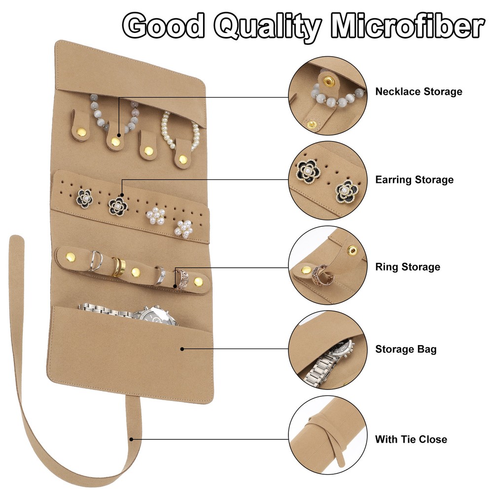 Foldable Khaki Travel Jewelry Organizer Roll with Tie