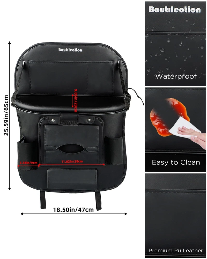 PU Car Organizer Backseat Holder, with Foldable Tray, Storage Box, Kids Organizer (1) - Buy Now with Fast Shipping! PU Car Organizer Backseat Holder, with Foldable Tray, Storage Box, Kids Organizer (1) Product Details Specific Uses For Product: Automobiles Material: Leather Special Feature: Crack Resistant, Leak Resistant, Abrasion Resistant, Foldable, Stain Resistant Color: black Brand: Boutilection Finish Type: Polished Product Dimensions: 0.2"D x 18.5"W x 25.6"H Shape: Rectangular Unit Count: 1.0 Count Number of Items: 1 Specific Uses For Product: Automobiles Material: Leather Special Feature: Crack Resistant, Leak Resistant, Abrasion Resistant, Foldable, Stain Resistant Color: black Brand: Boutilection Finish Type: Polished Product Dimensions: 0.2"D x 18.5"W x 25.6"H Shape: Rectangular Unit Count: 1.0 Count Number of Items: 1 Manufacturer: Boutique Trade Item Weight: 1.9 pounds Country of Origin: China Item model number: L48W34 Finish: Polished Special Features: Crack Resistant, Leak Resistant, Abrasion Resistant, Foldable, Stain Resistant Included Components: 1 Pack of Seatback Organizers Batteries Included?: No Batteries Required?: No Date First Available: August 6, 2024 Key Features ✅ Upgrade your car seat with this sturdy and durable car seat organizer. It provides ample storage space for all your essentials, including tablets, bottles, and snacks, keeping your car neat and tidy. ✅ Quality feeling. It is made of leather instead of cheap materials, and has a sturdy construction, ensuring durability and reliability. ✅ Say goodbye to messy car drives with these reinforced kick mats. They easily attach to the back of your car seats, keeping them clean and protecting them from spills and stains. They are eco-friendly and easy to clean, ensuring a neat and tidy car interior. ✅ Keep your kids entertained during long drives with the adjustable tablet holder and toys pockets. It's easy to install and foldable, making it perfect for family trips and long drives. ✅ Expand your space with this car seatback organizer. It features multiple pockets , cup holders, and multifunctional container that can be used as a storage or a garbage can, providing ample room for all your belongings and keeping them within reach. Product Description
