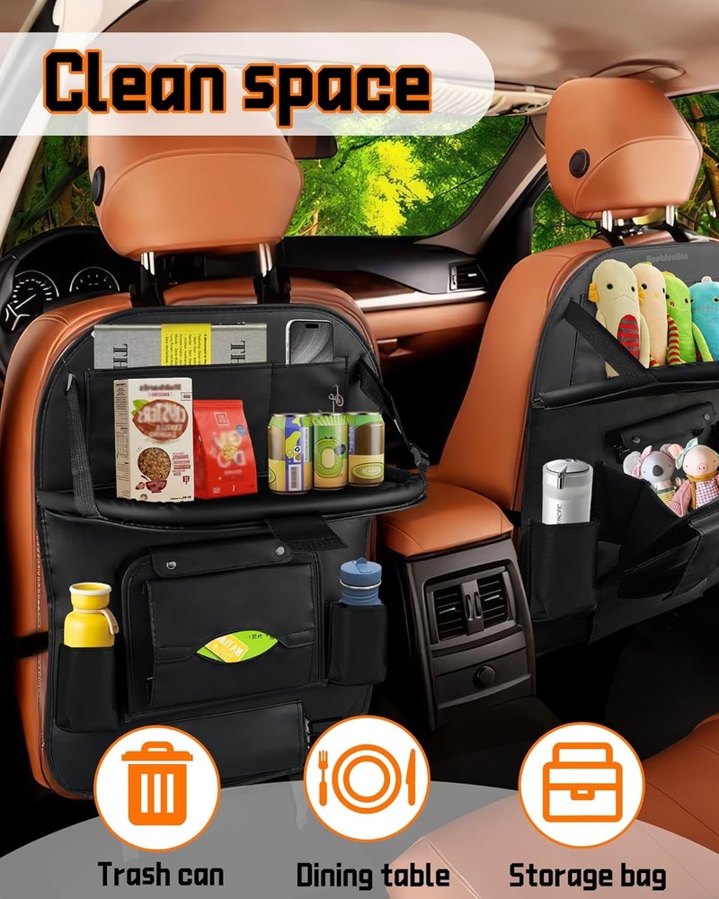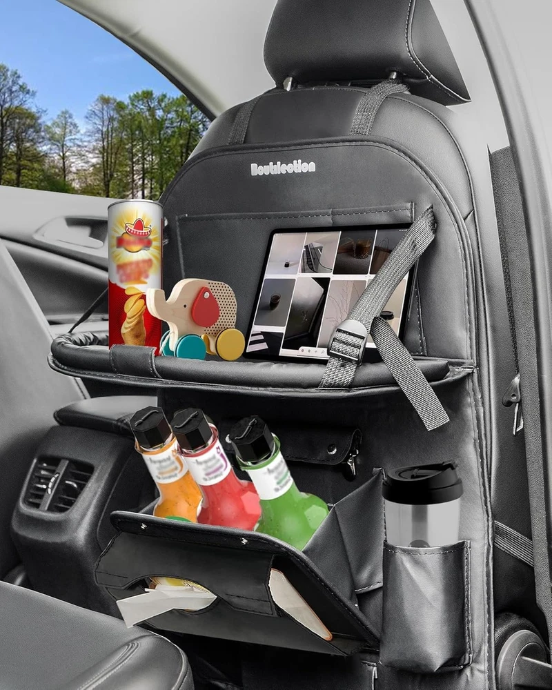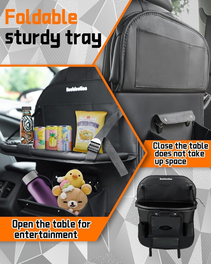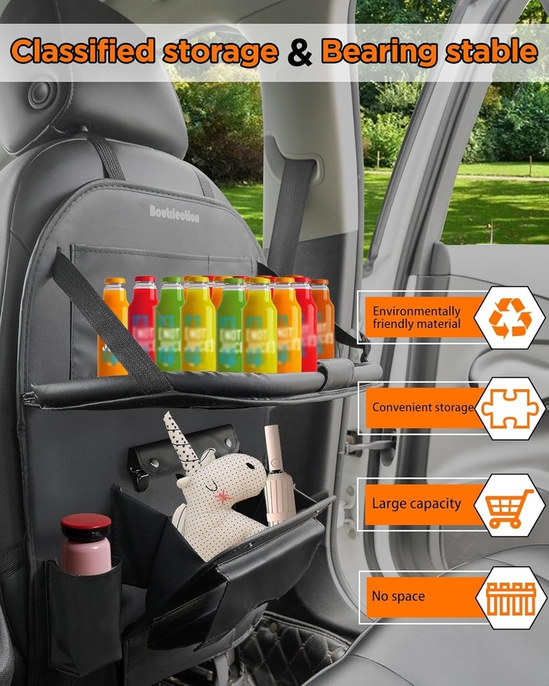 PU Car Organizer Backseat Holder, with Foldable Tray, Storage Box, Kids black Product Details Specific Uses For Product: Automobiles Material: Leather Special Feature: Crack Resistant, Leak Resistant, Abrasion Resistant, Foldable, Stain Resistant Color: black Brand: Boutilection Finish Type: Polished Product Dimensions: 0.2"D x 18.5"W x 25.6"H Shape: Rectangular Unit Count: 2.0 Count Number of Items: 2 Manufacturer: Boutique Trade Item Weight: 1.9 pounds Country of Origin: China Item model number: L48W34 Finish: Polished Special Features: Crack Resistant, Leak Resistant, Abrasion Resistant, Foldable, Stain Resistant Included Components: 2 Packs of Seatback Organizers Batteries Included?: No Batteries Required?: No Specific Uses For Product: Automobiles Material: Leather Special Feature: Crack Resistant, Leak Resistant, Abrasion Resistant, Foldable, Stain Resistant Color: black Brand: Boutilection Finish Type: Polished Product Dimensions: 0.2"D x 18.5"W x 25.6"H Shape: Rectangular Unit Count: 2.0 Count Number of Items: 2 Mounting TypeItem Weight: Hanging Mount1.9 Pounds Upgrade your car seat with this sturdy and durable car seat organizer. It provides ample storage space for all your essentials, including tablets, bottles, and snacks, keeping your car neat and tidy. Quality feeling. It is made of leather instead of cheap materials, and has a sturdy construction, ensuring durability and reliability. Say goodbye to messy car drives with these reinforced kick mats. They easily attach to the back of your car seats, keeping them clean and protecting them from spills and stains. They are eco-friendly and easy to clean, ensuring a neat and tidy car interior. Keep your kids entertained during long drives with the adjustable tablet holder and toys pockets. It's easy to install and foldable, making it perfect for family trips and long drives. Expand your space with this car seatback organizer. It features multiple pockets , cup holders, and multifunctional container that can be used as a storage or a garbage can, providing ample room for all your belongings and keeping them within reach.