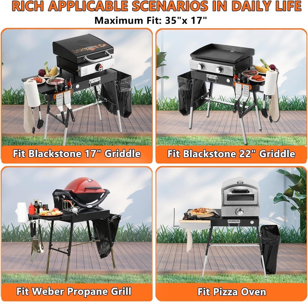 Foldable Portable Grill Table Fits 17" Or 22" Blackstone Griddle Stand, Ninja Grill Stand: Adjustable Leg with Trash Holder Perfect Blackstone Stand Accessories for Outdoor Cooking Camping Item Description About this item Unique Design: This grill table has made a unique design and substantiate in the actual use, storage and convenient travel, pay attention to every detail and experience, so that you can be handy in cooking. Universal Portable Grill Table/Cart/Stand: The tabletop size at W35" X 17"Max (Front to Back) - 595 sq. inch. You have 3 adjustable leg heights - 19.6", 22.8" and 30.1". So you can choose a suitable sitting position or standing position, you can even use it as a picnic table for children or adults. It a great partner with Blackstone 17"/22" Griddle, Ninja grill, Weber grill, ooni pizza ovens, Table Top Grill and more. Folding Table for Outdoor Grill: Designed with the full convenience of the field environment in mind, no need for any additional installation tools, 20s unfolding allows you to quickly get into the fun of bbq, storage and folding can be taken away as easy as luggage, space neutral, can be put it in the backseat of any vehicle or boot Whether you are plan a camping trip, have a picnic in the park or just want to save space in the backyard, this foldable grill table will easy to meet your needs. Upgraded Features and Great Present: If your man loves to cook outside, then he is going to love you if you get him one of these. A place to prep, magnetic utensil apparatus, trash bag holder, Height adjustable table legs, spice basket,hooks,as well as paper towel dispenser. Sturdy, easy to assemble, clean lines, looks great between the grill and griddle. It's the present that keeps him happy and out of your kitchen. Solid As A Beast: This Grill Stand is made by steel welding process and it's built to last. This Grill table Accessories can holds up to 200 pounds easily and let yours Grill sitting on top sturdily without any shake or shimmy during cooking. Suitable for: those who have grill size under 22" and pizza oven under 12", including those who have purchased Blackstone Griddle 17/22", Weber Q1000 /Q1200/Q2000 Liquid Propane Grill, Aidpiza Outdoor Pizza Oven 8"/10"/12" Wood PelletPizza ovens, ooni Fyra 8"/10"/12" Wood Pellet Pizza Oven. › See more product details Payment We accept payment only through PAYPAL Shipping We ship products worldwide through standard express courier service, it will reach within 7 to 10 days to abroad buyers, we ship the product after recieved clear payment and give full information about shipment to the buyer Return We accept product return within 7 to 21 days from delivery date but product should be in original position and not in damaged condition,the return shipping charges will be buyer responsibility