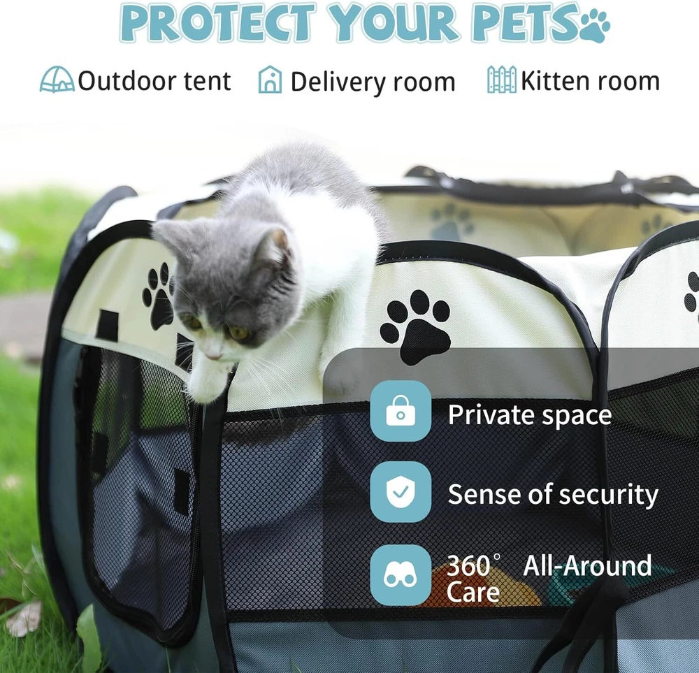 Product Description 😺Safe & Reliable: The cat playpen is made by oxford fabric, light and durable. Through the black mesh on the top and the other 8 sides, you can see each other easily, which will put both your mind at peace. The airy ample space can also prevent you pets from feeling stifling or oppressed. A perfect place for your pets to deliver, recover or rest. 🐶Pop-up & Portable: Our pet tent can be rapidly unfold or fold without any assembly of metal parts. For easier carriage and storage, you can fold it up when unused. Quickly make a lounge for your tired pets after indoors/outdoors games. Besides small cats, small dogs, kittens and puppies, our cat playpen is also suitable for rabbits, ferrets and guinea pigs. 😽Multipurpose & DIY: The skylight and the sidedoor would be a convenient way for you to interact with your pet or arrange interior space. You can put diaper pads inside the cat pen under newborn pets for efficient clean-up. As they grow up, this pet playpen can also be helpful for their potty training with a cat litter box in it. 🐶Suitable Size & Space: Our folding pet tent size is 29"*29"*17", which means it won't take up much space and easy for storage. Moreover, the interior space is big enough for your pets. For instance, a Devon Rex and her kittens has only taken half space of cat playpen. There is enough space for kittens' daily activities or cat furnitures(cat litter box, scratching post, cat bowl...) 😸Release Nature: Pets are born curious and engergetic. Instead of confining them in cages, it's better to prepare a safe and comfortable lounge for them after their playtime. There is enough space in the tent to put a cat scratch pad or molar rod for growing kittens or puppies. They can entertain themselves long enough there. The video showcases the product in use. The video guides you through product setup. The video compares multiple products. The video shows the product being unpacked. H&E Cat Playpen. Multipurpose and Portable Pet Playpen. Our Cat Playpen can be used in a variety of scenarios. We also use it ourselves and always take this playpen with us when we go out. We started using it because our Jinni(Devon Rex) was accidentally pregnant. As it was her first birth, we filmed her and the kittens. The video showcases the product in use. The video guides you through product setup. The video compares multiple products. The video shows the product being unpacked. A safe delivery room Jinni was very satisfied with the new house and quickly adapted to it, even without our company. A space of appropriate size and good air permeability usually brings enough sense of security. We often keep an eye on Jinni. Through the playpen, it's convenient. The video showcases the product in use. The video guides you through product setup. The video compares multiple products. The video shows the product being unpacked. A safe Nursery Room for mom and her kittens Jinni is a mom officially! Her kittens are healthy and cute! The playpen becomes their Nursery Room and protects the kittens safely. The video showcases the product in use. The video guides you through product setup. The video compares multiple products. The video shows the product being unpacked. A safe, warm and comfortabel kitten playpen Playpen becomes the kitten's room. Safe, warm and comfortable. It has enough space for them to have a frolic. The kittens can't wait to explore the outside world. The playpen is an effective way to prevent them from getting lost or getting into danger while exploring unattended. The video showcases the product in use. The video guides you through product setup. The video compares multiple products. The video shows the product being unpacked. A pet toilet - help them develop a good habit We added a playpen, which sits next to the original one, as a large toilet. They need to explore and train under Jinni's supervision so that they can correctly find the toilet when needed in the future Previous page Next page 1 Anti-Scratching 2 Breathable & Durable 3 Mosquito Control 4 Sturdy Structure Previous page Next page 1 Product Size 2 Installation Steps 3 Indoor Use 1 4 Indoor Use 2 5 Ourdoor Use