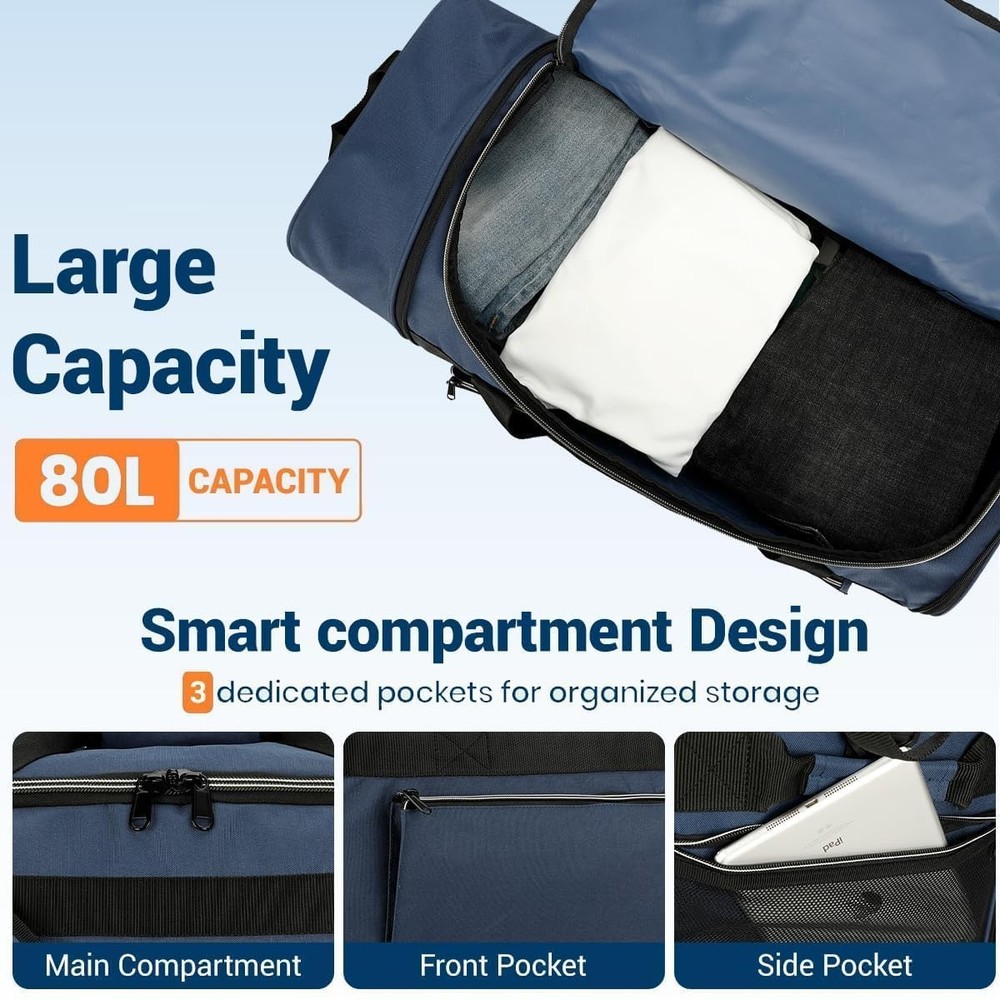 Foldable Rolling Duffle Bag with Wheels, 80L Large Duffle Bag for Travel, Carry On Duffel Bag for Men and Women Foldable Design – Measuring 28"(L) × 12"(W) × 13"(H) and weighing just 1.1 lbs, this rolling duffle bag with wheels can be quickly folded down to a compact 12"(L) × 4"(W) × 13"(H) flat size. It easily fits into your luggage as a “just-in-case” spare bag, perfect for storing souvenirs or unexpected necessities during your trip. 80L Large Capacity – Featuring a spacious U-shaped opening in the main compartment, this rolling duffle bag offers 80 liters of storage space, easily accommodating 3–4 days' worth of travel gear. It allows for quick access to your belongings without the need for rummaging. Additionally, a front zippered pocket and a side zippered mesh pocket help keep your essentials organized. Durable Material – Crafted from 600D water-resistant and tear-resistant polyester, this duffel bag with wheels is sturdy, abrasion-resistant, and easy to wipe clean. The interior is lined with PVC to protect your belongings from light rain, splashes, and everyday wear and tear. Heavy-Duty Wheels & Strenthened Bottom – The foldable travel bag is equipped with a foldable reinforced base panel to enhance durability and longevity. It also features two heavy-duty wheels housed within protective wheel casings, ensuring smooth mobility for effortless and comfortable travel. Comfortable Carrying Options – Customize how you carry this carry on duffel bag with its removable shoulder strap, padded top handle, and dual side handles. Designed for versatility, it is an ideal choice for travel, flights, checked luggage, or camping, making it easy to handle in various carrying scenarios.