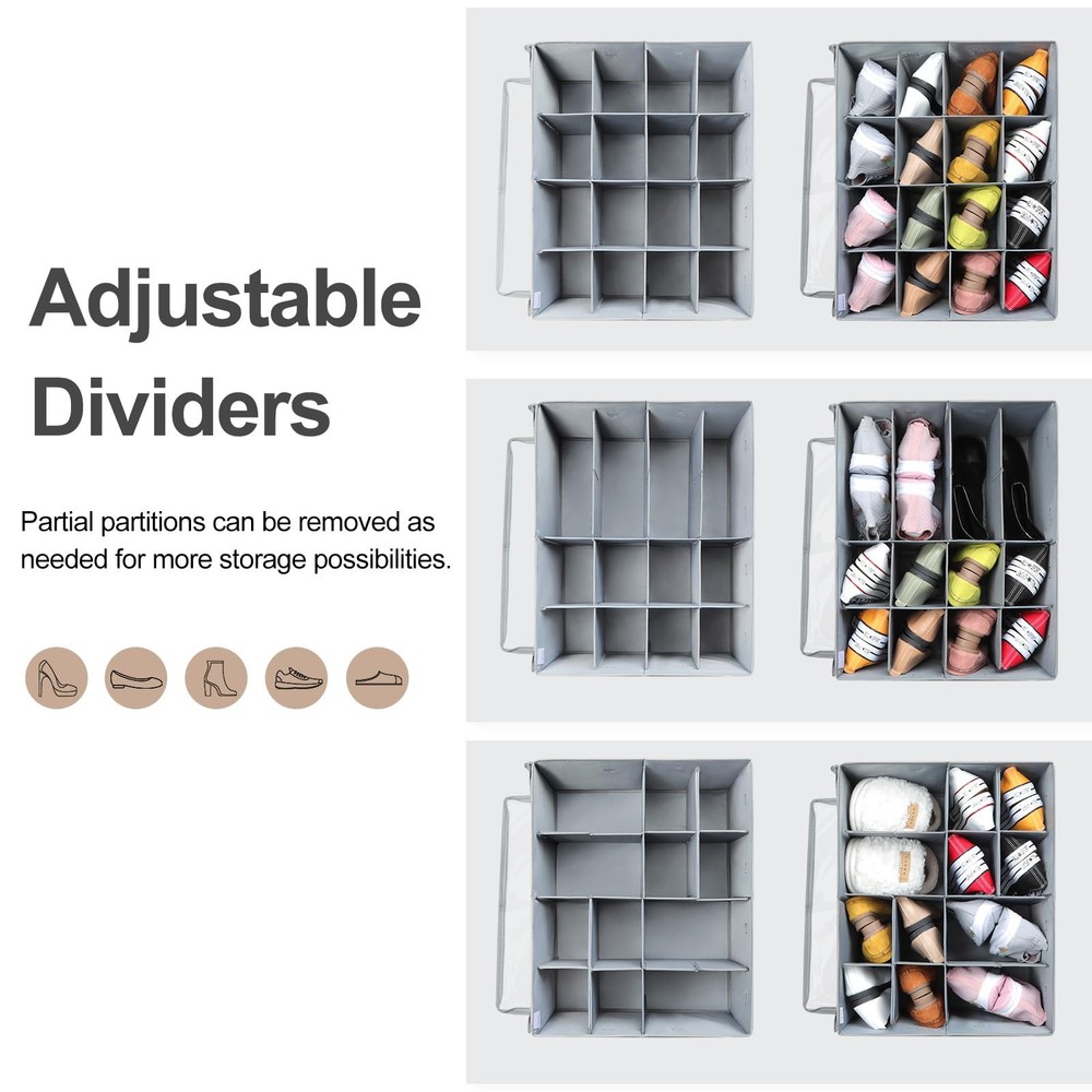 Shoe Organizer for Closet, Foldable Shoe Box with Adjustable Dividers and Clear Cover, Space Saving Shoe Storage Organizer Cabinet with Reinforced Handles, Fits 16 Pairs, Gray Large Capacity Shoe Storage: shoe organizer measures 20.87''L x 16.54''W x 13'H (53x42x33cm), and fits up to 16 pairs of shoes. When set to 16, the size of each compartment is 5.12 '' x 4.13 '' (13x10.5cm). When not in use, the shoe storage box can be folded up for storage to save space Adjustable Compartments: Connecting and adjusting each compartment of shoe box using card slots makes installation and use of closet shoe organizer very simple. The dividers can be adjusted according to the size of the shoes, such as sandals, high heels, sneakers, boots, slippers etc. Adjustable partition design of storage bin also helps you organize various items like clothes, handbags, books, blankets, towels, toys, shampoo, and more Space Saving Storage Solution: Compared to a shoe rack of the same size, shoe storage boxes are dustproof and can store more pairs of shoes, which is very space saving. Shoes storage organizer is also suitable for storing shoes when seasona changes. Shoe boxes can be placed in cabinets, closets, wardrobes, entryways, top shelves or just on the floor. Shoes organizer is available for walk in closet, living rooms, bedrooms, entrances, attics, garage, basements, RVs, dormitories and more Visual Design& Easy Access: The shoe basket has a transparent PVC lid that provides excellent visibility and allows for easy identification of the contents, making it easy for you to pick the shoes you need at any time. The lid also prevents dust. The durable zippers make the opening and closing of the shoe storage containers smooth and convenient, so you can store and take out the shoes without obstruction Durable Materials & High-Quality: High quality Oxford fabric is more durable and stylish compared to non-woven fabrics. The reinforced side boards and inserted bottom ensure that shoe box can maintain its shape even under pulling or other pressure, and will not collapse when empty or full. The reinforced handles allow you to easily remove shoe bin from closet, shelves ect. With no handles on the back to avoid occupying space when placed against the cabinet wall Not Just Shoe Storage: The high and rectangular partition design makes this storage box also suitable for storing water bottles, wine glasses, wine, champagne, and more. Adjustable partition design of storage bin also helps you organize various items like clothes, handbags, books, blankets, towels, toys, shampoo, and so on