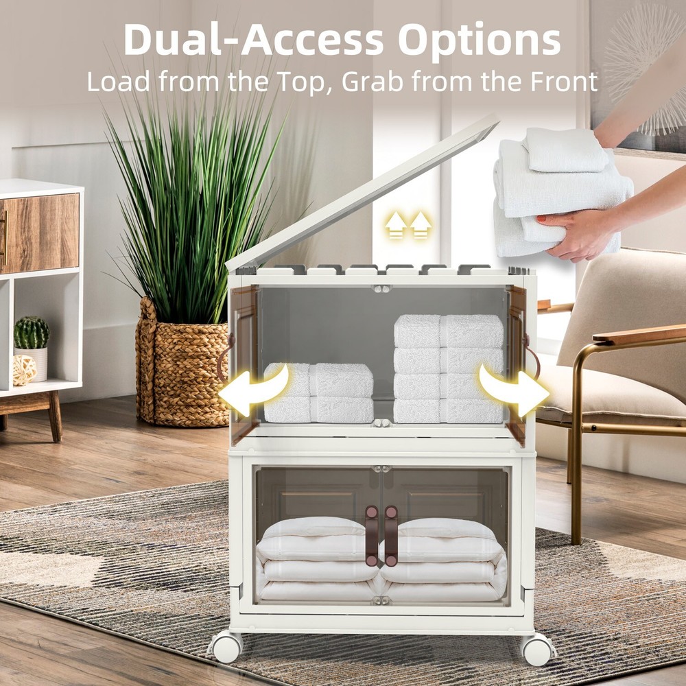 【CONVENIENT DUAL ACCESS】 These stackable storage bins with doors feature a top-opening lid and a front-access door, letting you effortlessly load a pile of clothes from the top and retrieve items one at a time from the front. This dual-access design is perfect for closet organizers and storage, streamlining organization and reducing the hassle of rummaging through belongings 【SPACE-SAVING DESIGN】 Foldable for ultimate convenience, these foldable storage bins collapse to a compact size of 19.68 * 11.81 * 2.75 inches. Opening and folding take just a few simple steps, allowing you to carry and store them with ease. As versatile folding storage solutions, they’re perfect for those on the move or for seasonal storage needs 【DURABILITY PREMIUM MATERIALS】 Crafted with upgraded TPR-infused materials, these foldable storage cabinets are tough, impact-resistant, and wear-resistant. Their sturdy construction ensures reliable performance as closet organizers and storage for long-term or daily organization 【MOBILITY AND STABILITY COMBINED】 Equipped with smooth-rolling, lockable wheels, these storage bins with wheels offer unmatched convenience for indoor movement. Whether you’re organizing a playroom or managing seasonal decorations, these bins combine the flexibility of mobility with the security of stable placement 【VERSATILE STACKABLE CONFIGURATION】 Designed as stackable storage bins with lids, these bins can be securely placed one on top of another without limits, making them suitable for various spaces. Use them as stackable storage drawers for clothes in closets, offices, or garages to create your own modular storage system that adapts to your needs On Jan 27, 2025 at 00:12:46 PST, seller added the following information: