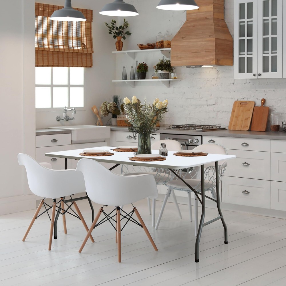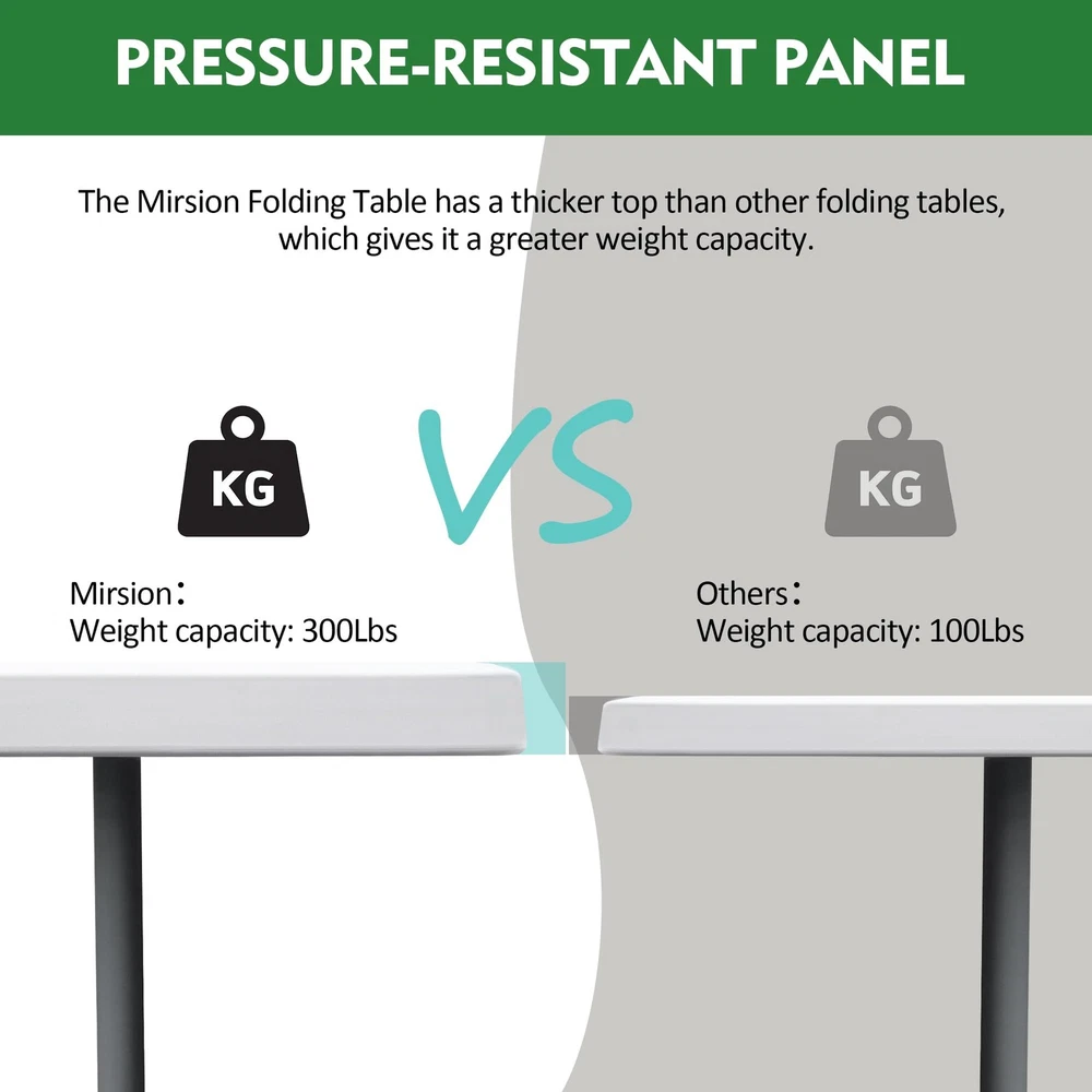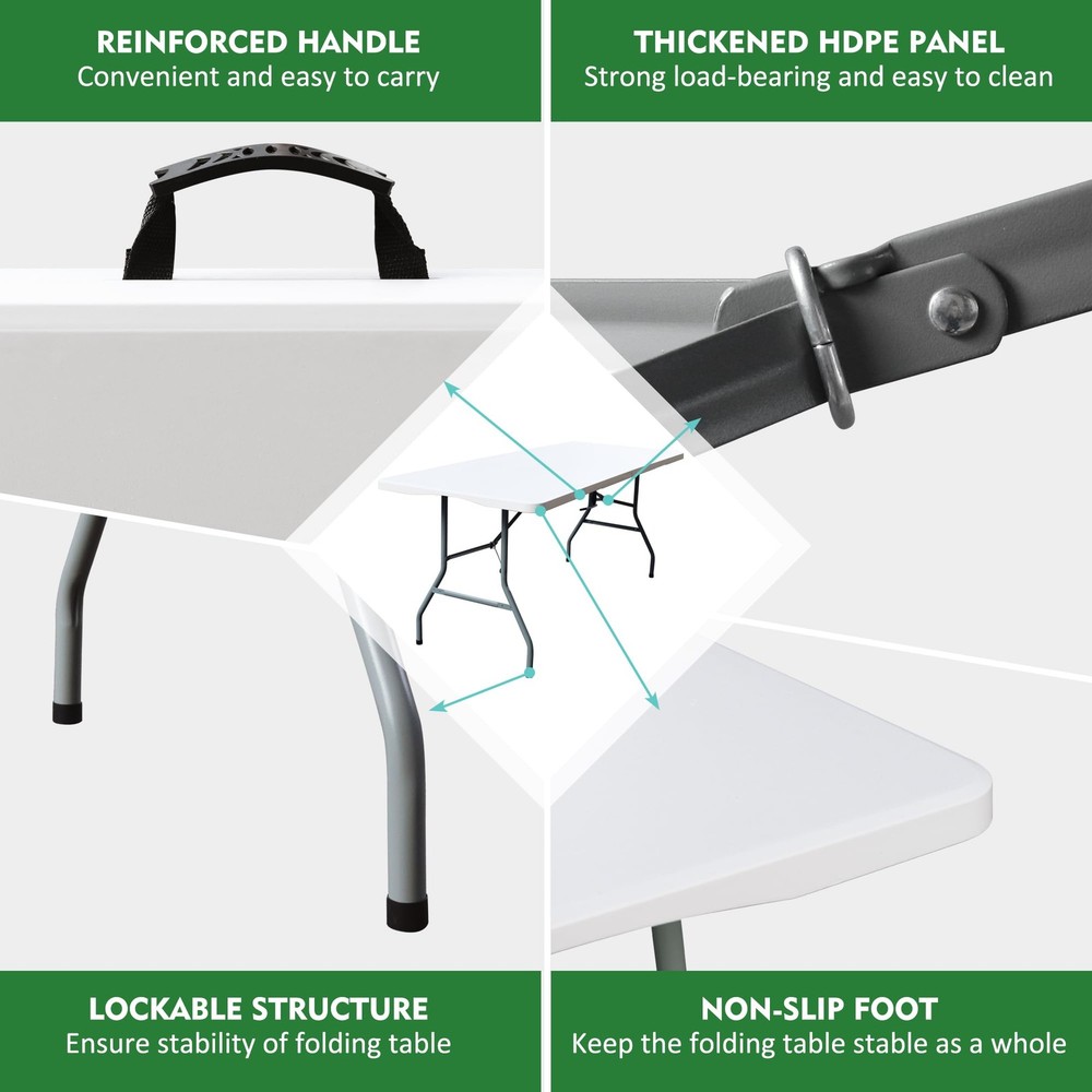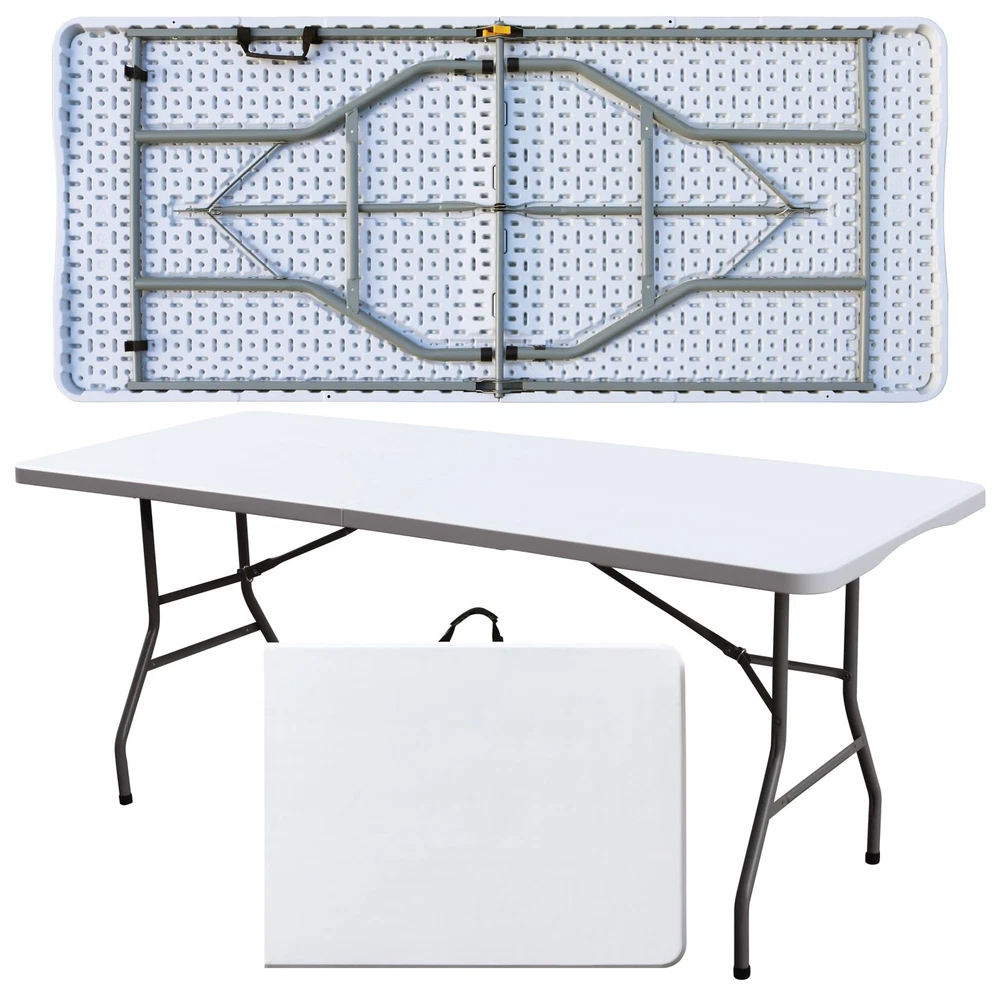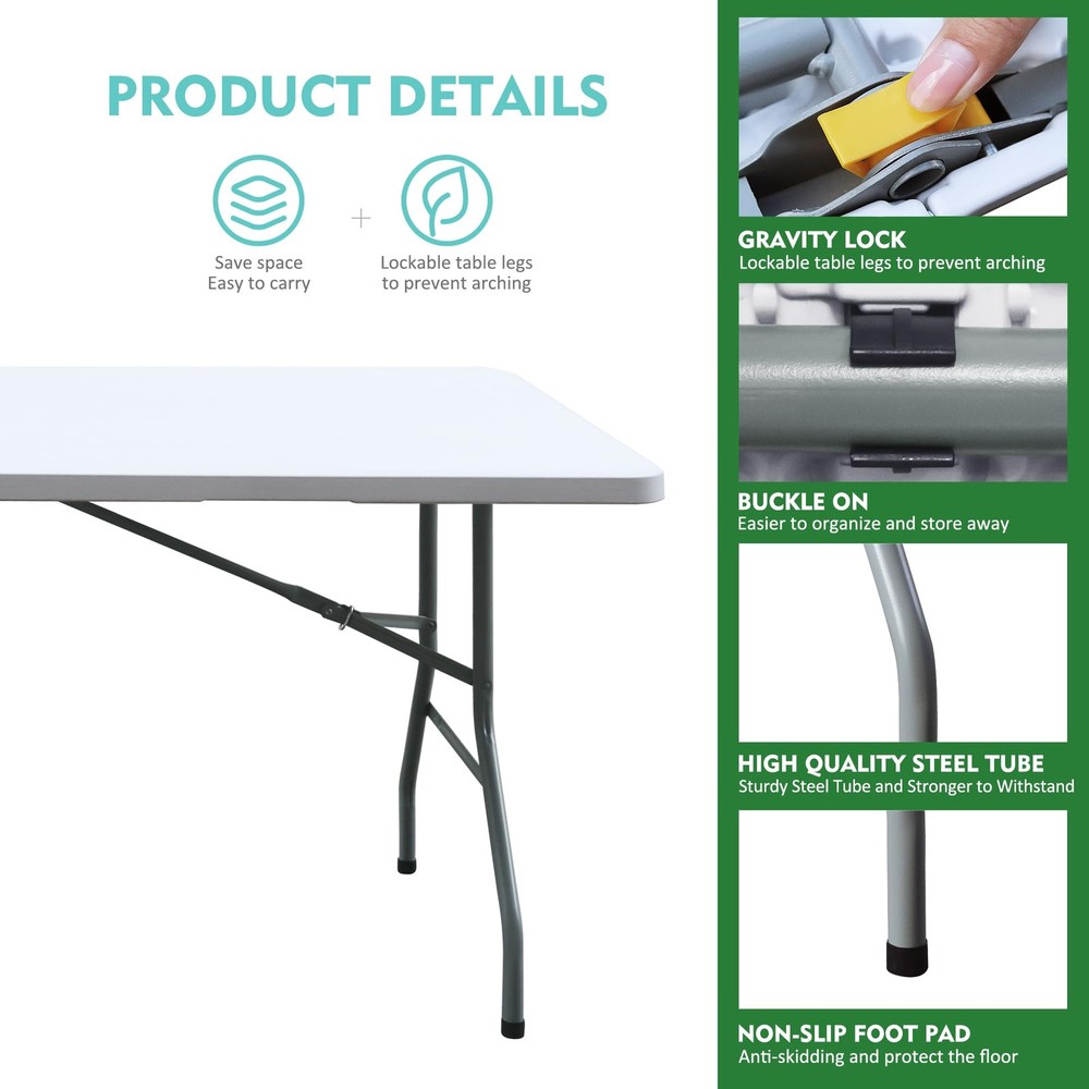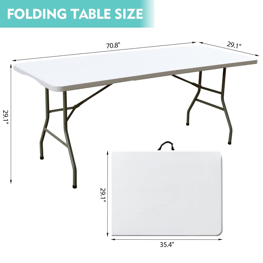 Introducing the plastic folding tables - the perfect outdoor companion for all your party and event needs! This foldable, 6-foot long table is designed with convenience and versatility in mind. Our folding table features a sturdy and durable construction, with a powder-coated steel frame that provides reliable support. The 6-foot length ensures ample space for all your guests, while its foldable design allows for easy transportation and storage. No assembly required, simply unfold and set up your table in seconds! With its compact size and comfortable handle, this folding table is perfect for outdoor gatherings, picnics, barbecues, and more. Its lightweight and portable nature make it a breeze to take it anywhere you go. The collapsible tables are built to last, with a moisture-proof and durable plastic material that can withstand various weather conditions. The non-slip rubber feet ensure stability and prevent any accidental slips or damage to your floors. Whether it's for a party, a camping trip, or simply as an additional table for your outdoor activities, this foldable table is a must-have. Its rectangular shape provides ample space for food, drinks, and other essentials. Don't miss out on this opportunity to enhance your outdoor experience with the Foldable Tables. Order yours today and enjoy hassle-free setup, portability, and durability all in one! EASY TO STORE AND CARRY: The Folding Table is the perfect solution for outdoor parties and events. The large folding table comes with convenient side-locking handles, allowing you to easily carry and transport it anywhere. STURDY AND DURABLE: Our folding table features a sturdy steel frame and non-slip rubber feet for strong support and a weight capacity of up to 300 lbs. Powder-coated legs ensure long-lasting durability, making the table perfect for any outdoor environment. SPACIOUS AND PRACTICAL: Measuring 70.87 "D x 29.13 "W x 29.13 "H, this folding table provides plenty of space for 6-7 adults. Its sleek, minimalist design adds a touch of elegance to any setting. EASY INSTALLATION: No assembly required! Simply unfold the table and lock the legs into place for a secure and stable tabletop. Rectangular design provides plenty of space for dining, playing games or displaying party decorations. WEATHER-PROOF AND EASY TO CLEAN: The surface of this outdoor folding table is made of durable plastic that is moisture-resistant, ensuring its longevity even in unpredictable weather conditions. Cleaning is also very easy, just wipe the surface with a damp cloth.