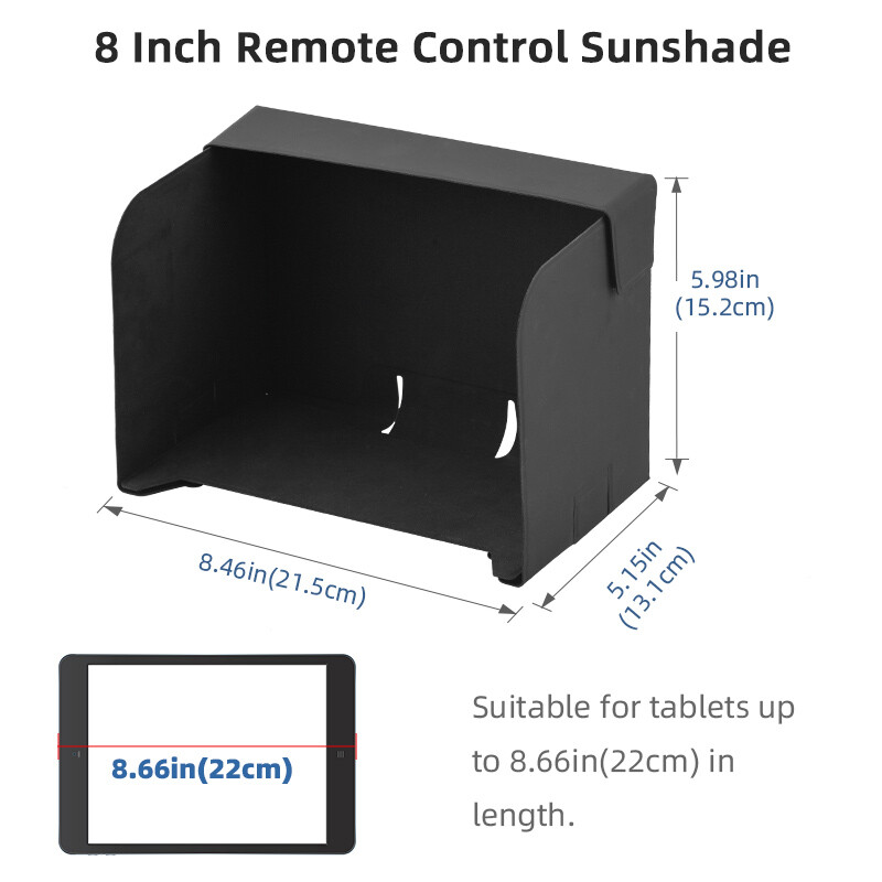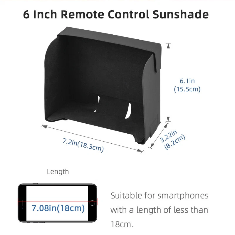 Product Description If you have any questions, please contact customer service first, do not open disputes easily, thank you! Feature: 1. The remote control hood protects the smartphone screen in strong lighting conditions, reduces glare, and provides a clear image, 2. The hood has a large space and does not affect the flight observation screen, 3. It will not affect the use of remote control buttons and data cables, nor will it increase the burden of flying, 4. The Magic stickers is installed by adsorption, which is firm and durable. Specifications: Material: Leather Applicable models: for Mavic 3/ Mini 2/Mini 2 SE /Mini 3/ Mini 3 Pro/Air 2S/Air 2 RC-N1 Remote Controller Color: Black 6" for mobile phones / 8" for tablets Net weight:3.01oz.(86g),(6 inch),4.35oz.(124.4g),(8 inch) Package weight:3.27oz.(93.6g),(6 inch),4.52oz.(129.4g),(8 inch) Packaging includes: 1pcs*Sunshade Note: 1.Does not include RRemote controls, mobile phones, data cables, tablet stands, tablets, 2.Transition: 1cm=10mm=0.39inch, 3.Since the size and weight are manually measured, due to different measurement methods, there may be certain errors in the weight and size of the product, but the error does not affect the normal use of the product, please confirm that you know and accept the error before purchasing; 4.Due to the difference between different monitors, the picture may not reflect the actual color of the item,please make sure you do not mind before ordering, Thank you! About Us We accept all payments authorized by eBay. powered by