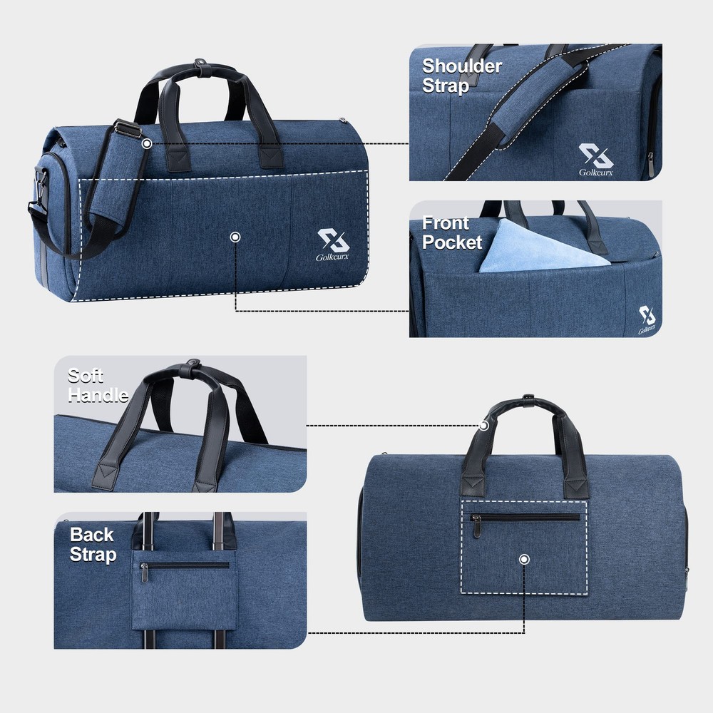 【2 in 1 GARMENT BAG】This garment travel bag combines the feature of a garment bag and travel duffle bag. There are 2 buckles inside to keep the garment flat and prevent it from moving during the trip, keep your dress or suit neat and wrinkle-free. It's a perfect choice for your business trip, formal party, vacation, end of the week out, gym, or touring performance 【CARRY ON & LIGHTWEIGHT】Unfolded flat size: 37.8”L x 21.3”W, 45L duffel bag folded dimension: 21.3”L x 13”W x 11”H. Light weight: 2.6 pounds. This convertible garment bag size is able to be compliant with aviation size standard, and is able to be carried on as a luggage item. Short ring handles allow you to easily carry the garment travel bag through the airport or pull out the detachable and adjustable shoulder strap for hands-free travel 【HARD-WEARING &WATER-PROOF】It is made of high quality, durable fabric that is resistant to scratches, tears, and water splashes. With sturdy zippers and bigger size zippers on the outside bag, make it easy for entry 【FUNCTIONALITY】There are multiple interior & exterior zipper pockets for storage. The big front pockets for speedy entry to anything. Two side pockets, one is a shoe compartment, and the other is a passport pocket. Garment pocket inside for storing your suits or dresses, dress watches, ties, cuff links, belts, or any other personal belongings 【SALES SERVICE】is committed to providing excellent customer service to its customers including pre-sales and after-sales service. Please feel free to contact us if you have any questions or concerns you may have