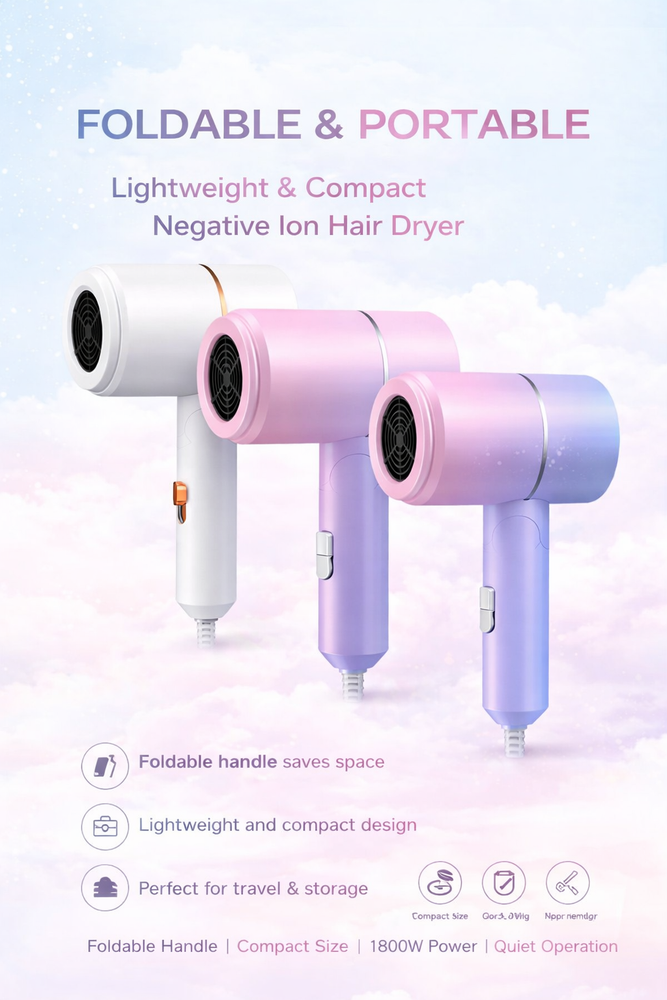 This compact foldable hair dryer is designed for travel, everyday use, and small spaces . Lightweight and easy to store, it delivers quick drying airflow while maintaining consistent heat for safer styling. Ideal for home, gym bags, dorm rooms, and travel luggage. SPECIFICATIONS • Power: 1000W • Motor Type: AC Motor • Voltage: 110V • Design: Foldable & Portable • Size: Travel Size • Color: White • Material: Plastic • Use: Household & Travel • Heat Control: Adjustable heat settings PACKAGE CONTENTS • 1 × Foldable Hair Dryer • 1 × Concentrator Nozzle • 1 × User Manual