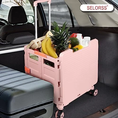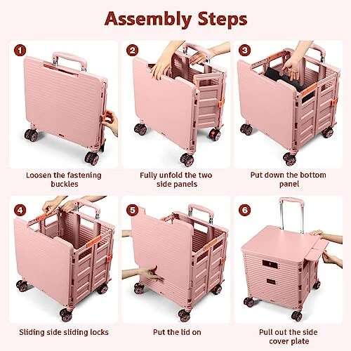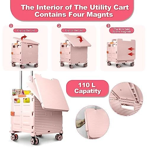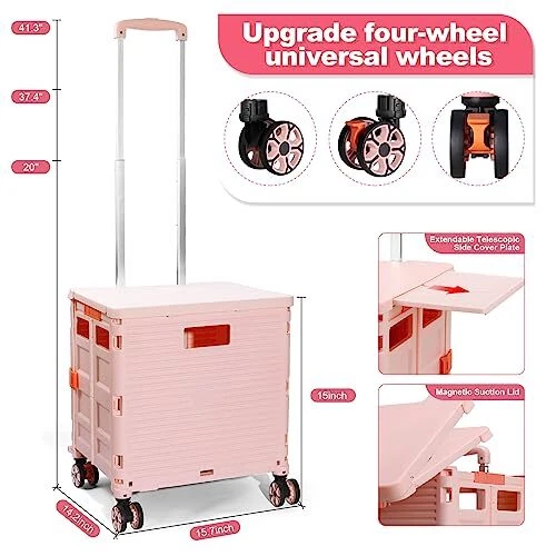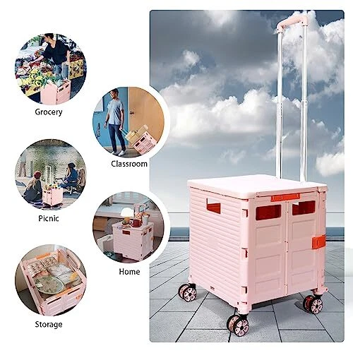 Return Policy Fast Delivery Trusted seller Foldable Utility Cart Collapsible Portable Tool Cart with Wheels Tote Basket,176LBS Load Capacity,Magnetic Lid Telescopic Cover with 360° Wheels Telescoping Handle for Grocery Laundry Luggage,Pink Product Description 【Smart Extended Lid】 The newly upgraded magnetic suction cover design,The cart comes with a lid to keep contents secure,it can be used safely in rainy days without getting wet.When you are tired,you can sit on the lid and have a rest.The lid can be extended as a table,suitable for outdoor field,family gatherings. 【High Quality Material】This collapsible rolling crate is made out of premier, sturdy, durable and environment friendly polypropylene, equipped with anti-rust aluminum alloy handle (stronger and lighter) and wear-resistant and pressure-resistant TPE rubber wheels to ensure smooth rolling when applicable. Besides, the material of the folding utility cart makes it easy to roll on any road and ensures longevity. 【Heavy Duty and Durable】 The drawbar is made of reinforced aluminum alloy material, light and durable. The box is made of thick impact-resistant engineering PP material, which is wear-resistant and scratch-resistant. The box has large space and strong bearing capacity, holding up to 80KG(176LBS) capacity. 【Extra Strong Loading & User’s Best Friend】This rolling storage cart can withstand the heavier loads better than other grocery cart, it offers 1.9 cubic feet of storage space and bears 50 kg/110lbs, the lid supports up to 265 lbs and you can sit on the lid and rest when you are tried. 【Multifunctional Use】This folding rolling bar box is more environmentally friendly than plastic bags, and can be used as a folding cart, rolling tool box, teacher rolling cart, wheeled laundry basket, wheeled rolling document cart. Essential in office organization and Product covered under one or more claims of Licensed U.S. Patent Nos. 11,565,735 and 11,338,835 Shipping Returns Payment Shipping Shipping is FREE to all addresses other than APO/PO boxes in the lower 48 states. All our stock ships from US-based warehouses. Shipped via USPS or UPS (depending on location and package weight) Unless stated otherwise, all orders will ship within 24-72 hours of your payment being processed. Check our feedback to see the great reviews of FAST shipping we offer. Returns Seller does not accept returns Payment We currently accept payment via eBay managed payments only. Once payment is cleared, we will dispatch your shipment within 1-3 business days. Please refer to the "Shipping" tab for more information regarding shipping speed to your destination.