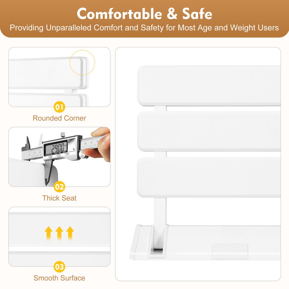 Specifications Material: Stainless Steel, Aluminum Alloy, Abs Color: White Style: Modern Surface Treatment: Injection Molding Installation Type: Wall-mounted Assembly Required: Yes Folding Degree: 90° Load Capacity: 130kg/286.6lbs Gross Weight: 1.85kg/4lbs Net Weight: 1.65kg/3.63lbs Bracket Size: 32*10cm/12.6*4in Gap Spacing: 1cm/0.4in Product Thickness: 29mm/1.14in Product Size: 32*34cm/12.6*13.38in Package Size: 33.5*37*6cm/13.2*14.56*2.36in Description Please Do Not Compromise on Comfort! the Elderly, Pregnant Women, and Those with Limited Mobility in Your Home Deserve a Better Experience. Bending over at the Doorstep Every Day to Change Shoes, Standing for a Long Time to Wash up, and Other Small Things Are Tiring for Them, and May Even Trigger High Blood Pressure. Our Folding Shower Seat Is a Wall-mounted Solution That Provides Stability, Comfort, and Safety. It Greatly Expands the Space at the Entrance or Bathroom, Ensuring Better Care for You and Your Family. Key Features Intimate Care: It Is a Necessity in Households with Limited Mobility, Providing a Safe and Supportive Seat! Standing, Bending down, Shaving or Taking a Shower for a Long Time Is No Longer a Difficult Task, for This Seat Greatly Enhancing Their Daily Shower Experience! Folding Design: This Shower Seat Is Compact in Size(12.6*13.38in) and Can Be Folded When Not in Use, Saving Valuable Bathroom Space. It Is an Ideal Solution for Those Seeking Supportive Shower Experience. Selected Materials: High Quality Aluminum Alloy Load-bearing Rods and Base, Abs Panel, and Stainless Steel Screws Provide a High Degree of Durability and Stability (Maximum Load-bearing Capacity of 286.6 Pounds). You Can Confidently Install It in Damp Environments like Bathrooms. Comfortable & Safe: Our Folding Shower Seat Features Ergonomic Dimensions, Smooth Surface, and Rounded Edges, Providing Unparalleled Comfort and Safety for Most Age and Weight Users. Exquisite Appearance: Its Elegant and Minimalist Design Makes It a Unique and Practical Shoe Changing Stool or Seat, Ideally Blending with Various Interior Decoration Styles and Adding a Touch of Refinement to the Overall Space. Waterproof Function: with Excellent Waterproof Function, It Ensures Easy Maintenance and Prevents Damage Even in Humid Environments, Allowing You to Use It for a Long Time with Peace of Mind. Simple Cleaning: the Smooth Surface and Overall Minimalist Structure Make Water and Stains Impossible to Escape! You Just Need to Gently Wipe It with a Neutral Cleaning Agent and a Towel to Make It Look Brand New Again. Easy to Install: with a Simple Structure and Clear Components, You Can Easily Install It in a Short Time, Enjoying a Sense of Achievement from Components to the Finished Product! Details Anti-pinch Gap: This Gap Between the Seat and the Wall(0.4in) Is Thoughtful and Ensures That Your Hands Are Not Pinched When Folding the Chair. Hollow Seat: the Hollow Seat Not Only Helps with Ventilation, but Also Filters Water Faster, Making It More Suitable for Bathroom Use Scenarios. Application It Can Be Used on the Walls of Bathrooms, Shower Rooms, Porches, Corridors, Living Rooms, Balconies, Changing Rooms, Daycare Centers, Saunas (Load-bearing Walls Such As Concrete, Solid Bricks, Dense Natural Stones, Steel Reinforcement, Etc.) for Adults, Pregnant Women, Children, the Elderly, and People with Disabilities. How to Install After Determining the Installation Height, Mark the Location of the Holes to Be Punched. Connect the Installation Holes to the Marked Positions. Insert the Bracket into the Body. The Support Panel Assembly Insert Inside the Tank Body. After Installation, Install the Decorative Cover. Specifications Material: Stainless Steel, Aluminum Alloy, Abs Color: White Style: Modern Surface Treatment: Injection Molding Installation Type: Wall-mounted Assembly Required: Yes Folding Degree: 90° Load Capacity: 130kg/286.6lbs Gross Weight: 1.85kg/4lbs Net Weight: 1.65kg/3.63lbs Bracket Size: 32*10cm/12.6*4in Gap Spacing: 1cm/0.4in Product Thickness: 29mm/1.14in Product Size: 32*34cm/12.6*13.38in Package Size: 33.5*37*6cm/13.2*14.56*2.36in Package Included 1*Folding Shower Seat 1*English Installation Manual All Accessories for Assembly Notes Please Carefully Read the Manual and Strictly Follow the Precautions to Have a Better Experience. Before Placing an Order, Please Ensure Accurate Measurement of Your Space and Compare It with the Specifications of This Product. Please Ensure That Your Walls Have Sufficient Support, and Low Load-bearing Walls Such As Porous Bricks, Gray Sandstone, Thin Hollow Walls, Simple Board Walls, and Gypsum Walls Cannot Be Installed. When Drilling into a Solid Wall, If It Is Found That the Wall Is Loose, the Load-bearing Capacity Is Not High, or the Screws Are Not Tight Enough, Please Install Them in Other Places or Reinforce the Wall Before Drilling and Assembling. Please Allow the Slight Color Difference Caused by the Shooting Light and 1-3cm Error Due to Manual Measurement, and Make Sure You Do Not Mind Before You Order.