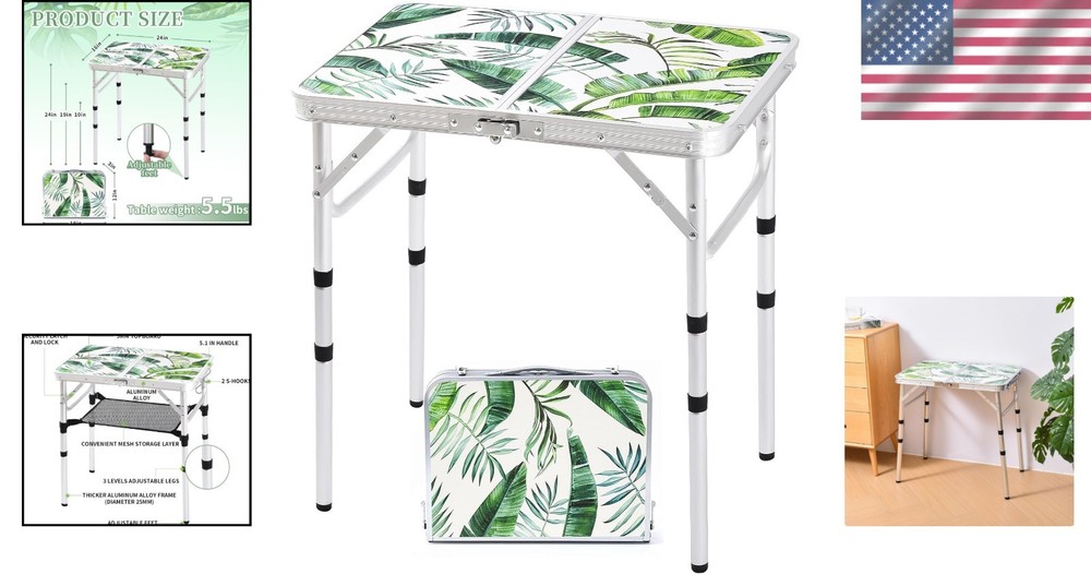 Folding Camping Table Lightweight Aluminum 2ft Portable Adjustable Outdoor Indoor ‹ › ‹ › ‹ › ‹ › ‹ › ‹ › ‹ › ‹ › Folding Camping Table Lightweight Aluminum 2ft Portable Adjustable Outdoor Indoor Features: Compact dimensions: Open size is 24" x 16"; folds to 16" x 12" x 3". Adjustable legs with three height settings: 10", 19", and 24" for customized use. Durable 5 mm MDF tabletop supported by a robust thick aluminum alloy frame and U-shaped side supports. Secure locks ensure stability during use. Lightweight at just 5.5 lbs / 2.5 kg while supporting up to 70 lbs / 32 kg. Features mesh storage and S hooks for holding tools, snacks, and more. Benefits: Adaptable heights provide flexibility for various activities and needs. Sturdy design guarantees reliability in outdoor environments. Easy to transport and store due to its lightweight and compact nature. Multi-functional use for both outdoor activities and indoor settings. Extra storage solutions keep your essentials organized and within . Why choose our Folding Camping Table? Seeking the ideal companion for your outdoor escapades? Look no further. Our Folding Camping Table combines elegance with exceptional utility, boasting a lightweight aluminum design paired with adjustable heights to cater to your specific needs. Whether you're enjoying a picnic, camping under the stars, or hosting a BBQ, this versatile table adapts effortlessly. This sturdy tabletop is designed to withstand the demands of any adventure while offering the convenience of easy assembly and disassembly. At just 5.5 lbs, it's portable, yet robust enough to hold up to 70 lbs. With additional mesh storage for all your essentials, this table doesn't just meet your needs—it exceeds them. Embrace the freedom of outdoors without compromising on comfort and style. Order your Folding Camping Table today and elevate your outdoor experience! Shipping Free & Fast Shipping - We offer free shipping to most of the USA with a normal delivery time of 3-7 days. However, due to the current situation, additional delivery time (up to 3 weeks) may be required for some items. Alternative Carriers - We may use alternative carriers (e.g. USPS, FedEx, UPS, etc.) to ensure your package arrives safely and on time. Due to the use of multiple carriers, we are unable to provide a tracking number automatically. Handling Time - Orders are processed and shipped within 1-2 business days of receiving cleared payment. Shipping Restrictions - Shipping to Alaska, Hawaii, Puerto Rico, Guam, and other US territories may incur shipping charges or delivery restrictions. Please contact us before ordering, or your order can be refunded/cancelled. State Restrictions - There may be restrictions based on your state of purchase. For example, certain items may not be shipped to California due to state regulations. Contact for Tracking Updates - If you require tracking updates or have any concerns about the delivery of your order, please feel free to contact us, and we will be happy to assist you. Return 30-Day Hassle-Free Returns - We want you to be completely satisfied with your purchase. If you are not, you can return the item within 30 days of receiving it for a full refund or exchange. Easy Return Process - To start a return, simply contact us and we will provide you with a prepaid return shipping label and detailed instructions. Restocking Fee - There are no restocking fees for returns. However, the buyer is responsible for return shipping costs if the return is not due to a seller's error. Refund Processing Time - Refunds will be processed within 5 business days of receiving the returned item in its condition. Payment We accept all major credit cards, PayPal, and Apple Pay for your convenience. Your payment information is secure and encrypted to ensure a safe and seamless transaction. Please complete your payment within 3 days of purchase to avoid any delays in shipping. Feedback Your feedback is extremely important to us. We strive to provide the best products and customer service possible. If you are satisfied with your purchase, please take a moment to leave us a positive review. If you have any concerns or issues with your order, please contact us before leaving negative feedback. We are committed to resolving any problems and ensuring your satisfaction. Contact Us If you have any questions or concerns, please feel free to out to our customer support team. You can contact us through the eBay messaging system. We are available Monday to Friday, 9:00 am to 5:00 pm EST, and we will do our best to respond to your inquiry within 24 hours. Buy it now and enjoy a pleasant shopping experience! Folded Dimensions: 16x12x3 Item Height: 24 Inches Item Weight: 6 pounds Unit Quantity: 1 Frame Material: Aluminum,Metal Tabletop Material: Aluminum,MDF Set Includes: Table Suitable For: Backpacking,Camping,Hiking,Indoor,Indoor/Outdoor Features: Foldable,Lightweight,Portable,Adjustable Height,Sturdy,Compact,Easy Assembly,Extra Storage Type: Camping Table Color: Monstera Palm Leaves Weight Capacity: 70 lbs