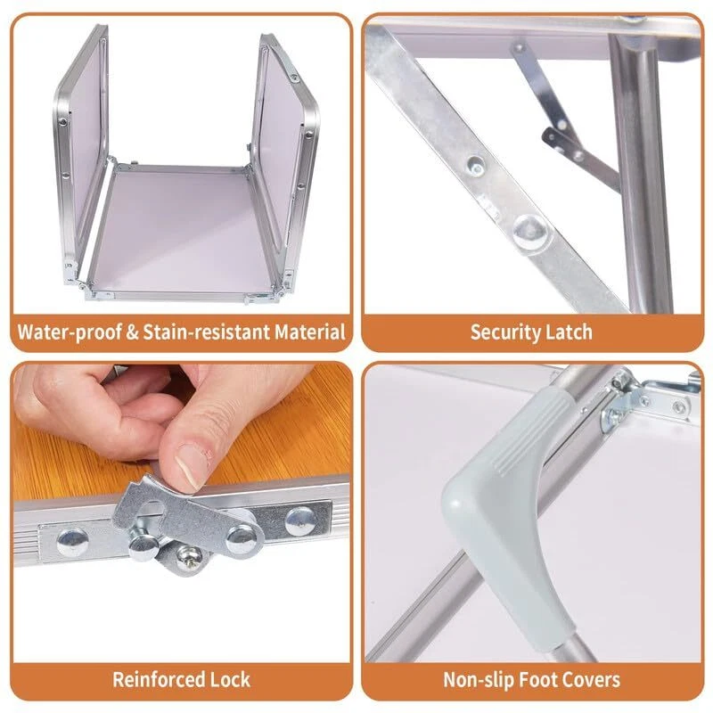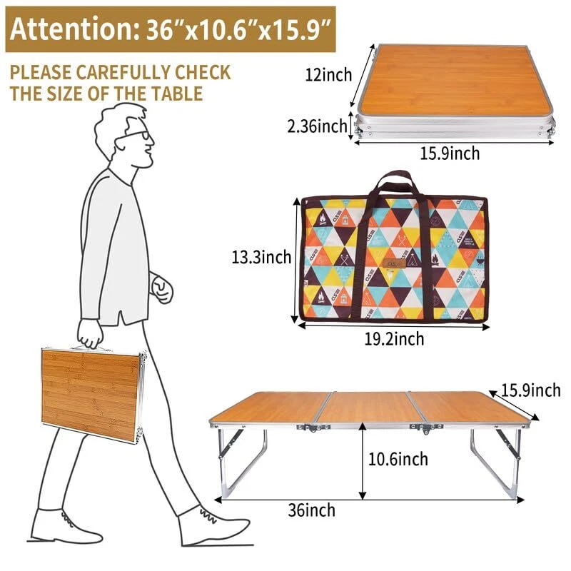 Situated in the location of your choosing, whether it be by the water, in a beautiful park, overlooking country vistas or enjoying mountain views. With camping table you will be treated to a luxury picnic decorated with quality rugs, cushions, picnic table, boho decor, dried flowers, crystal glassware, rose gold cutlery, linen napkins and stoneware crockery. FOLDING CAMPING TABLE WITH CARRYING BAG We’ve all eaten far too many camping dinners off paper plates precariously balanced between our legs. A proper table is an essential piece of any car camping kit, and investing in a quality piece of equipment will turn your new table into a more versatile product that can be used for picnics, backyard gatherings, tailgates, and more. Rugged, functional, and compact, the Table is right at home on the beach or around the campfire. The legs fold flat, so it is easy to transport and takes very little room to store. Legs lock securely, both open and closed, with a simple locking pin. This is a low table that pairs very well with all of our low chairs, or even by itself on a picnic blanket. Weighing in at less than 5 pounds, this table can be taken anywhere without a second thought. No matter where you are or where you intend on going, our folding camping table is great for any outdoor activities, such as backyard BBQ, sporting event, hiking, tailgating, picnic, etc. Aluminum Folding Table: Unlike wooden or nylon-top portable tables, the aluminum table top is waterproof and stain-resistant. Simply wipe with a damp cloth or wash it with soap and water without affecting its appearance and functionality. Easy to clean without rusting, can be used on sunny or rainy days. 【Portable Folding Camping Table】- (Please confirm the size before buying)The travel table weights only 4.5 lbs, pack size is 17.6''x11.8''x2.3''when folded in half, open size 35.4'' x16''x9.8'.Suitable height for sitting on the ground.Portable folding tables no assembly required and can be unfold within seconds. With its carry handle, light weight and compact 3-fold folded size, you can carry this foldable table to anywhere you want easily. 【Lightweight Yet Incredibly Stable】- Gone are the days that you have to bring heavy and big tables when you go camping.This dinner table is finished with thicker MDF table top and sturdy aluminum alloy frame. It's also designed with additional non-slip U-shaped side supports and strong latches, which ensures the folding picnic table stable in use. Tested to hold 40 lbs (evenly distributed). 【Read & Work without Getting Out of Bed】- Whether you're just an avid lover of your comfy bed, or you're recovering from a past injury, this bed table is just the thing you need! It leaving enough spare space to comfortably use your mouse and enjoy breakfast, while the 33.5" distance between its legs offers ample space for stretching your feet under it. 【Camping Gear Must Haves】- 35" x 16" spacious tabletop suitable for up to 4 people for eating, drinking, or playing on. This portable table folding is perfect for camping, hiking, traveling, fishing, picnic, beach, trip since it is foldable and light, scratch resistant and easy to clean. It can be used as small outdoor table, camp table, side table for BBQ and RV, etc. 【Want to Surprise Someone?】This small tables for small spaces comes with a nice gift carry bag where you can store it with.It is a ideal camping gifts for camper, fishing and travel lovers. Also a useful bed table tray, laptop table desk and a space saving floor table that must have at home.