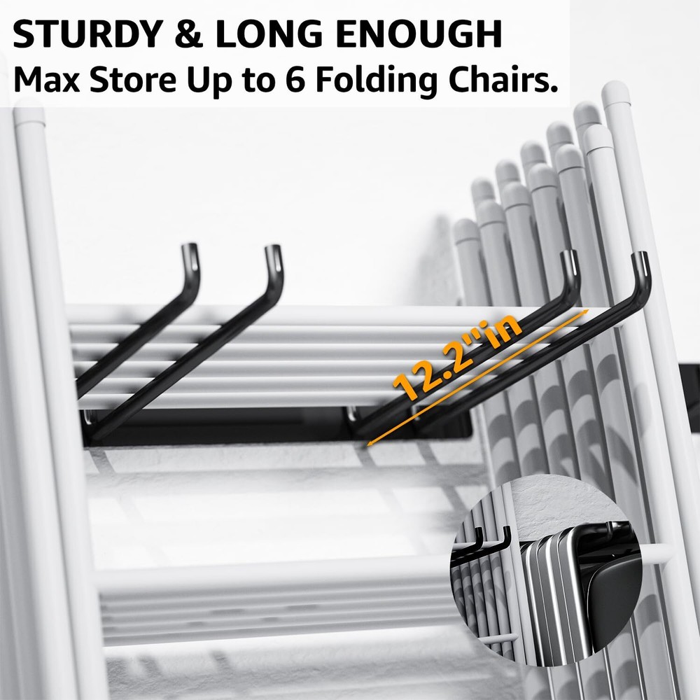 Folding Chair Storage Rack, Garden Tool & Foldable Chairs Organizer Hangers for Garage Organization, Lawn, Beach, Camping, Yard Chairs Hooks Wall Mount, Soild Metal Max Load 240 LBS - 2 Pack 【SPACE SAVING】The 12.2 inch long utility storage hooks can store up to 6 folding chairs each. Ideal for storing lawn chairs, beach chairs, camping chairs, yard chairs and patio chairs etc. 【WIDELY USED】garage hanger is also great for storing your yard tools such as shovels, rakes, power tools, ladders and more. 【NO ASSEMBLY REQUIRED】: Solid, welded storage rack is ready to go out of the box. Simply mount it to the wall and load up your chairs. 【EASY INSTALL】Folding chair rack wall mount simply mounts to the wall with the included quality screws. Designed to secure to standard wall studs spaced 16" apart. 【HEAVY DUTY】garage hooks is made of industrial solid steel. Each pair of hooks can hold 120 lbs, for a total of 240 lbs, enough to hold all your folding chairs or tools. Folding Chair Storage Rack, Garden Tool & Organizer Hangers for Garage Organization, Lawn, Beach, Camping, Yard Chairs Hooks Wall Mount, Soild Metal Max Load 240 LBS - 2 Pack Shipping We offer FREE shipping on all orders! We ship within Three business days of payment, usually sooner. We use a selection of shipping services such as UPS, FedEx, USPS etc. We only ship to the lower 48 states, no APO/FPO addresses or PO Boxes allowed. Local pickups and combined shipping options are not provided at this time. Return You can return a product for up to 30 days from the date you purchased it. Any product you return must be in the same condition you received it and in the original packaging. Please keep the receipt. Payment We accept payment by any of the following methods: PayPal Please pay as soon as possible after winning an auction, as that will allow us to post your item to you sooner! Feedback Customer satisfaction is very important to us. If you have any problem with your order, please contact us and we will do our best to make you satisfied. Contact Us If you have any queries, please contact us via ebay. We usually respond within 24 hours on weekdays. Please visit our eBay store to check out other items for sale! Thank you for shopping at our store.