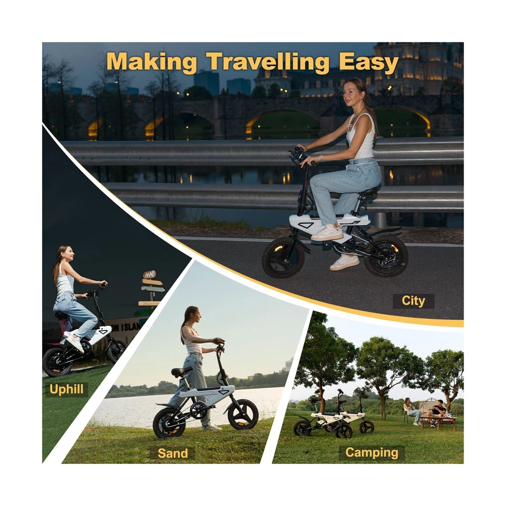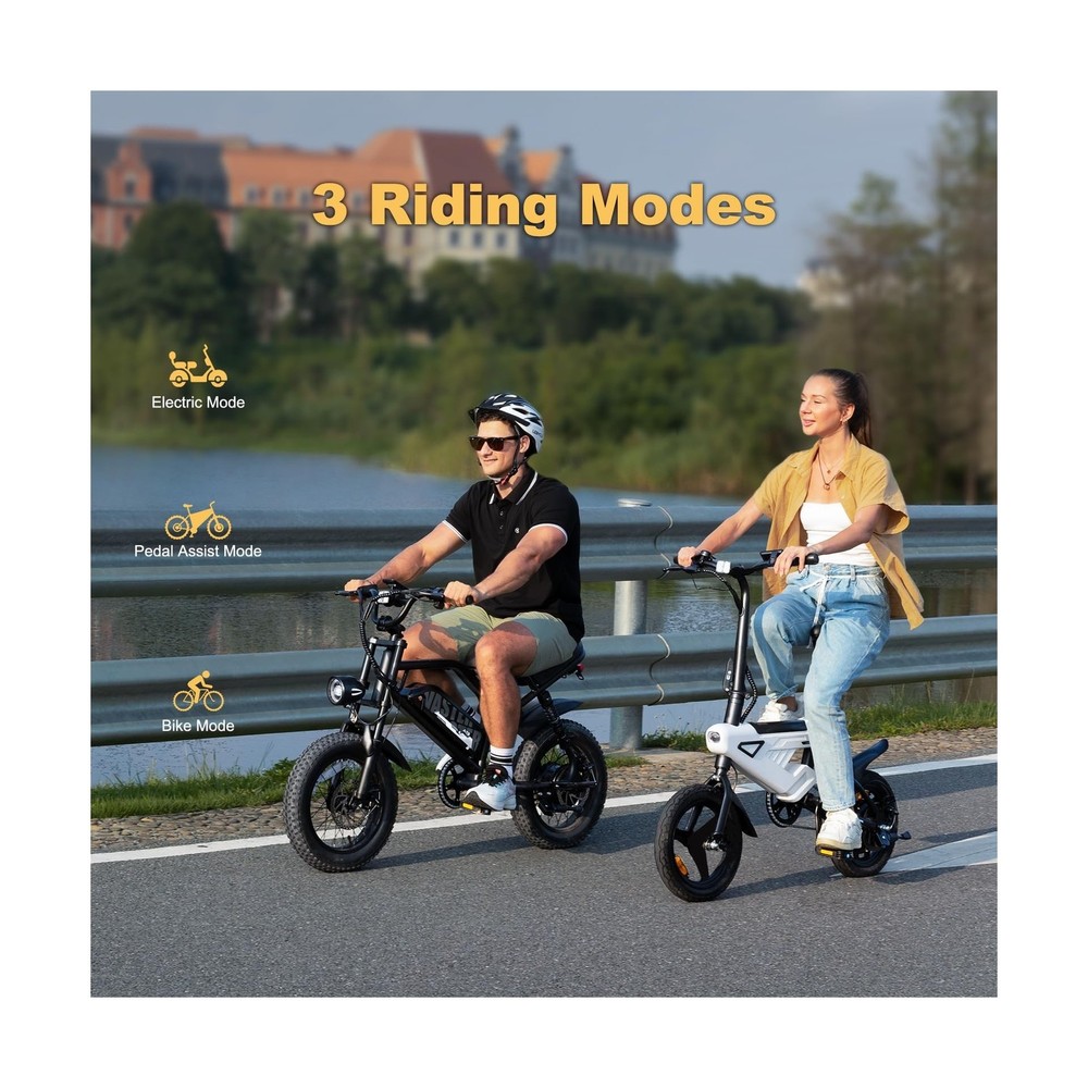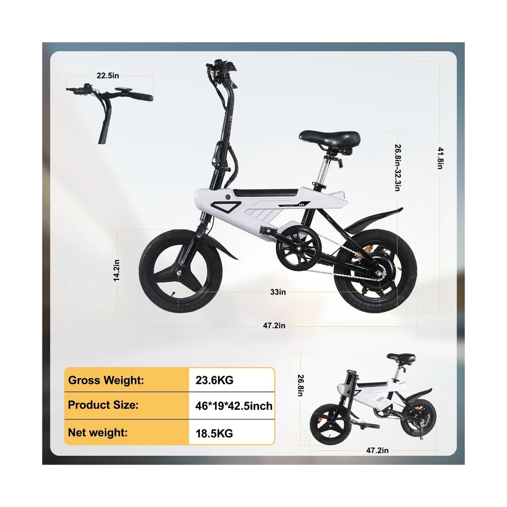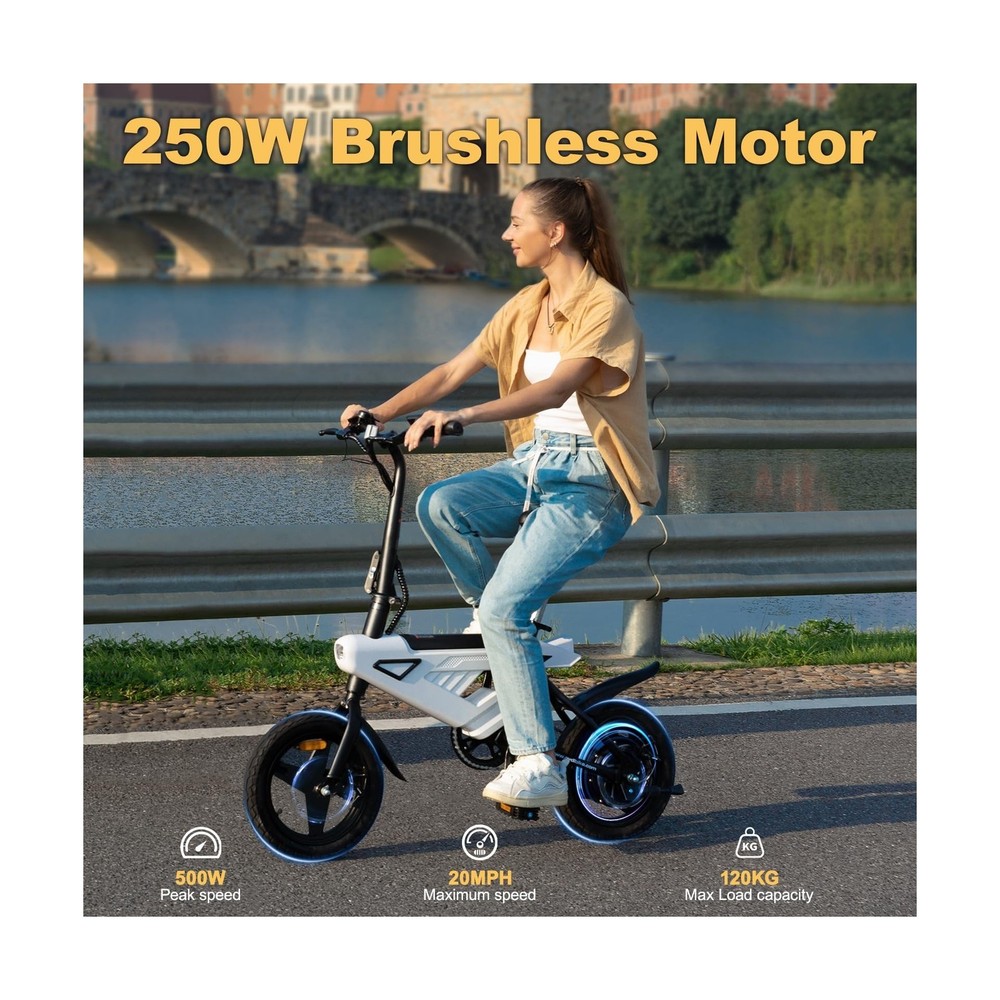 Folding Electric Bike for Adults,Max Speed 20Mph, 500W Peak Motor & Portable,14" Electric Bicycles with 36V & 6.4 Ah Lithium Removable Battery,20 Miles PAS Range Description Features: Energy-saving Battery36V 6.4 Ah Removable Battery design is easy to charge at home or office. Charging time only takes 3-4 hours, and the maximum driving distance can reach 20 miles in pedal assist mode.This electric bike has UL2849 certified. Foldable & Light-wightThe handlebars, footrests and height-adjustable seat of the 14-inch electric scooter are all foldable, and the humanized design saves space (<0.12m3). Whether it is placed in the trunk of a car or lifted into an elevator, it can be easily and quickly folded and stored. 3 Riding Modes Easy SwitchingThis small electric bike has three modes: electric mode / pedal-assisted mode / bike mode, which can be freely switched as needed during travelling, making your travelling life easier, more convenient and fun. A New City Commuting This small folding e-bike is equipped with a powerful brushless motor, 250W brushless motor (peak 500W), 3 gears speed: 0-10-20-32, maximum speed 32Km/h, This electric bike will allow you to effortlessly navigate crowded roads during rush hour and get to your destination faster!The electric mini bike is a new practical and flexible transportation in the town. Safe & Night RidingThis folding e-bike is equipped with high-brightness front and rear lights, LED lights save electricity and reduce power consumption, while the integrated taillight with brake signal ensures safe driving during the day and at night. Product Details: Bike Type: Electric Bike Age Range (Description): Teens And Adult Brand: ESEPOWER Number of Speeds: 3 Color: Black Wheel Size: 14 Inches Frame Material: Iron Suspension Type: Dual Special Feature: 250w Motor Included Components: A02 14'' Electric vehicle (including key)*1 Bike Type: ‎Electric Bike Age Range (Description): ‎Teens And Adult Brand: ‎ESEPOWER Number of Speeds: ‎3 Color: ‎Black Wheel Size: ‎14 Inches Frame Material: ‎Iron Suspension Type: ‎Dual Special Feature: ‎250w Motor Included Components: ‎A02 14'' Electric vehicle (including key)*1 Size: ‎14" Brake Style: ‎Disc Wheel Width: ‎3 Inches Specific Uses For Product: ‎Commuting Item Weight: ‎52 Pounds Theme: ‎Retro Style: ‎City Bike Model Name: ‎A02 Power Source: ‎Battery Powered Wattage: ‎250 watts Wheel Material: ‎Aluminum Lithium Battery Energy Content: ‎230.4 Watt Hours Seat Material Type: ‎Faux Leather Warranty Type: ‎Limited Manufacturer Assembly Required: ‎Yes Bicycle Gear Shifter Type: ‎Twist Grip Is Autographed: ‎No Skill Level: ‎Beginner Minimum User Height: ‎45 Inches Fender Material: ‎Plastic Bicycle Drivetrain Type: ‎Derailleur Electric Assist Type: ‎pedal-assist and throttle Manufacturer: ‎Shenzhen Hanying New Energy Technology Co., Ltd Item Package Dimensions L x W x H: ‎48.5 x 30 x 9.5 inches Brand Name: ‎ESEPOWER Warranty Description: ‎ESEPOWER provides 2 year warranty for A02 Adult electric bike. Contact us via Whatsapp or service number to get bike accessories! Material: ‎Iron Date First Available: April 27, 2025 Delivery We Do Not Ship Outside of the Continental US. Return Policy All items qualify for returns within 30 days of receipt. Buyer is responsible for return shipping on any item that is not damaged. Feedback We take our reputation seriously, we buy and sell online, so we understand the value of trust. If you are unsatisfied with your order, please contact us and we will work with you to resolve it to your satisfaction.