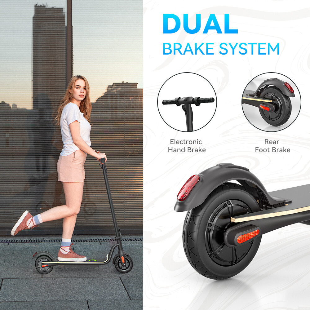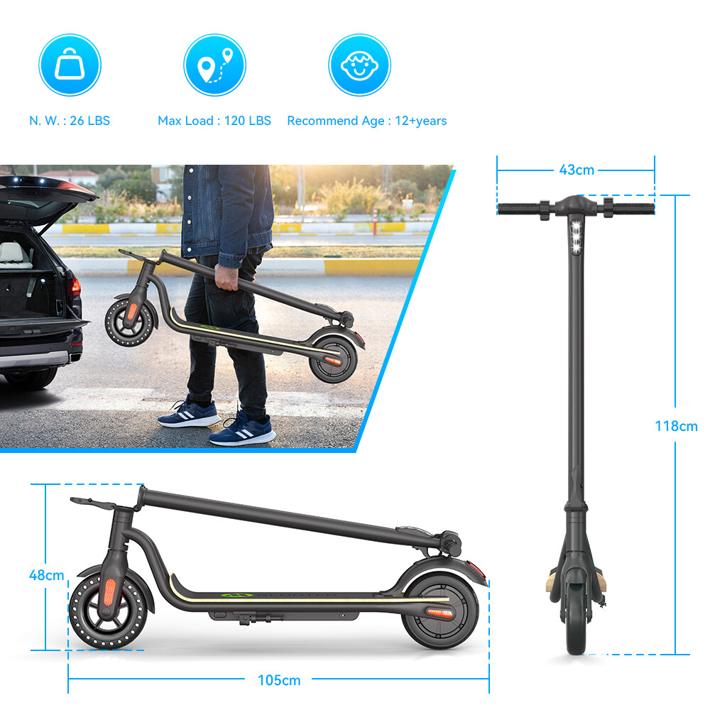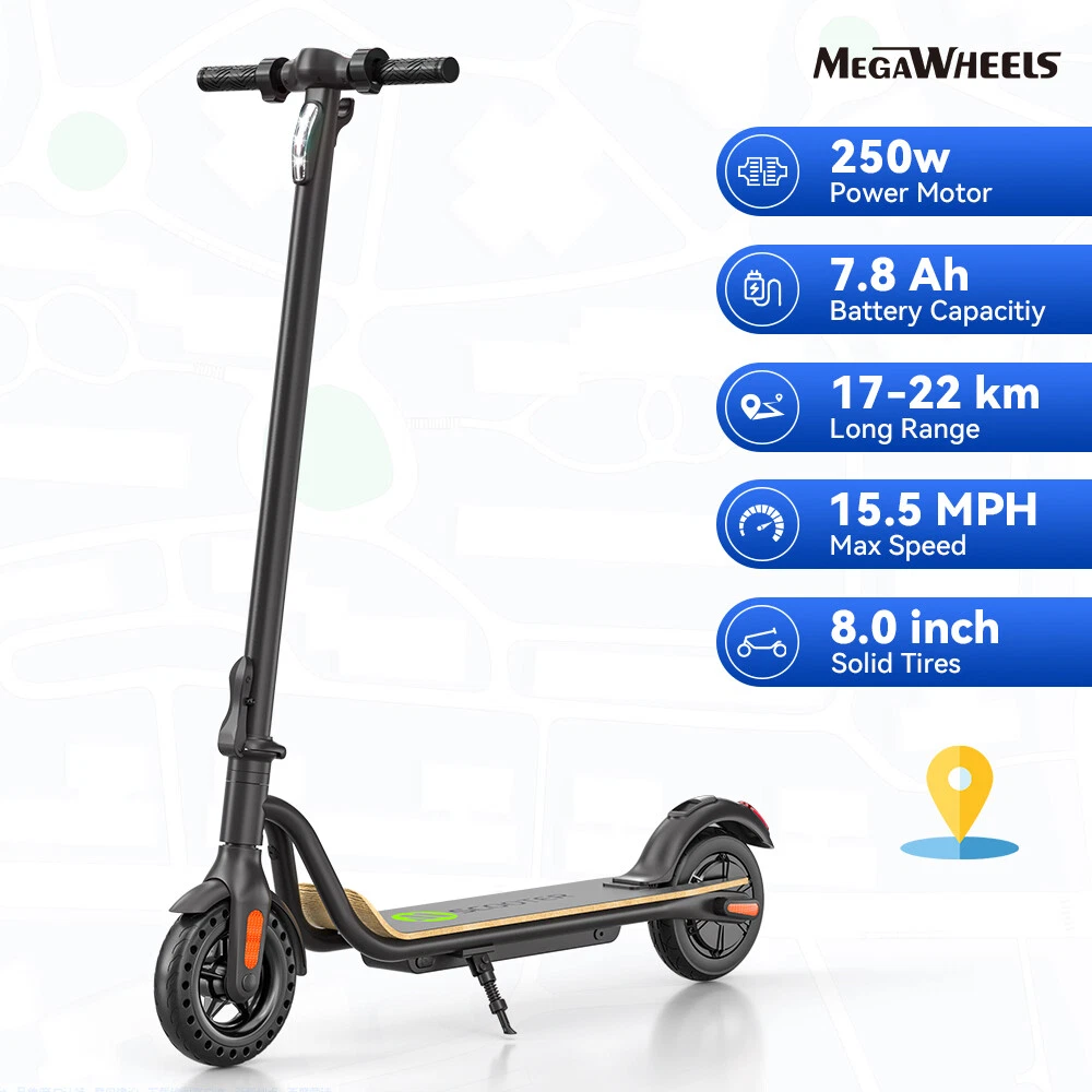 NOTE:The appearance of the product you receive may vary slightly from the image shown due to differing production batches! Main features: LONG RANGE BATTERY LIFE - Powerful 250W motor and 7.8 Ah/36V lithium battery pack that supports a speed of up to 15.5 Mph with a range up to 14 Miles. Updated large-capacity battery life, designed for commuters and longer distances. 8.0" HONEYCOMB & SOLID TIRES - Shock-absorbing rubber tires offer a smooth ride even over bumpy surfaces. PORTABLE FOLDING DESIGN - Electric scooter can be folded easily in 3 seconds with quick folding latch for easy carrying and storage. BATTERY INDICATOR AND LIGHTS - Battery indicator keeps to track battery life. Ultra bright LED headlight and taillight. Fast recharging about 5 hours. GEAR SHIFT SETTING - 1st gear for a 7.5 Mph comfortable ride or 3rd gear to get the 15.5 Mph fast experience. Extremely fun to ride and end boring commutes. Specification: Brand: Megawheels Model: S10 Dimension: Unfolding 105 x 43 x 118 cm; Folding: 105 x 43 x 48 cm Net Weight: 11.9kg Color: Black Frame Material: Aluminium Tires: 8.0" Honeycomb Front Tire & Solid Rear Tire Max Load: 100kg Max speed: 25KM/h Speed level: Gear 1--Max 10km/h ; Gear 2--Max 20km/h; Gear 3--Max 25km/h Mileage: 17-22km Grade Ability: 20 degree slope Working Temperature: -15°C-50°C Storage Temperature: -20°C-25°C Mode Type of Motor: Brushless hub motor Battery Type: High quality lithium battery Battery Capacitiy: 7.8 Ah Battery Voltage: 36V Charger Input Voltage: 100V-240V Charger Frequent: 50Hz/60Hz Charging time: 5 hours Package Contents: 1 * Folding Electric Scooter 1 * Battery Charger 1 * User's Manual Before use, please kindly read the schematic diagrams and assembly steps of manual to assemble the front wheel: 1. Step on the base, lift the fork firmly to remove the base. 2. Remove the rubber plugs on both sides of the front fork, and unscrew the front axle with the two 6mm hexagon wrenches in the package. 3. When installing the front wheel (please pay attention to the direction of the tread of the tire, as shown in the lower right or the inflation port to the right), and tighten the front wheel axle. 4. Plug back the rubber plugs on both sides of the front fork. Riding Skills: -Put your foot in the front of the scooter and the other foot on the floor before riding. -Make sure that the riding route is smooth. -Slide forward with the food standing on the floor before starting (like riding the scooter without power). -Immediately press the acceleration button and lean forward to avoid falling over backward due to inertia, so that the electric scooter will enter the working status. -Avoid pressing the handle with your body in the acceleration and deceleration process. Put one foot ahead and the other behind (like on the sliding plate/surfboard, put one foot ahead and the other behind by 70-90 for better comfort). -Turning – The turning principle of the electric scooter is the same with that of surfboard/sliding plate/skis. The handle shall be balanced with the body. Observe and make sure that turning is safe before turning. Tips: Before riding the scooter, please put one foot on the scooter deck and the other foot on floor and push the scooter forward by kicking the floor for some distance, in this way, the scooter will get some impulse to run forward. Note: This products have been certified under UL2272 safety standards.