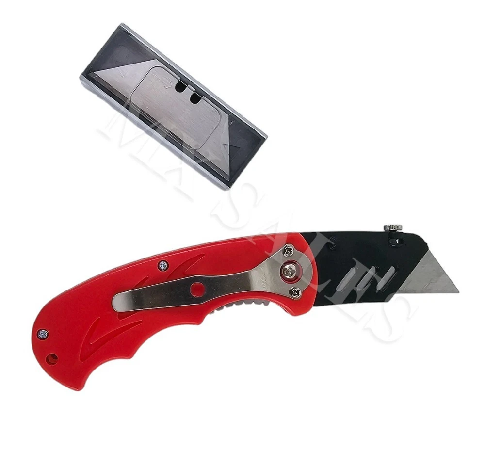 Maxsales_2009 FOLDING UTILITY KNIFE W/ EXTRA BLADES Lightweight PLASTIC handle with belt clip on back Folding control on side of handle Fixed blade for stronger cutting power Includes 10-pc. SK-5 spring steel blades COLOR MAY VARY BLACK OR RED Shipping Information: All package will be inspected before shipping. Protective packing material will be added in your package if we believe item can be damaged easily in transit. Please allow 1-2 business days handling time for payment processing and shipping. Tracking numbers will be available in 24 hours except weekends and holidays. For faster service, please update your correct shipping address before sending payment. Please contact us if you have any questions on shipping. Terms of Sale: 100% Satisfaction Guaranteed or your money back. All exchange items must be in 100% brand new condition. Buyers are responsible for return shipping. Items must be returned by the same method use for delivery. All returns will subject to a 10% restocking fee based on there invoice price