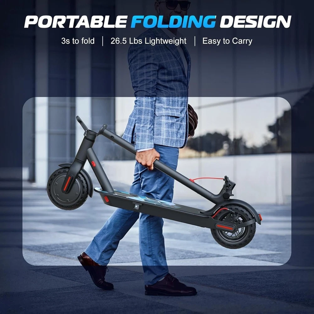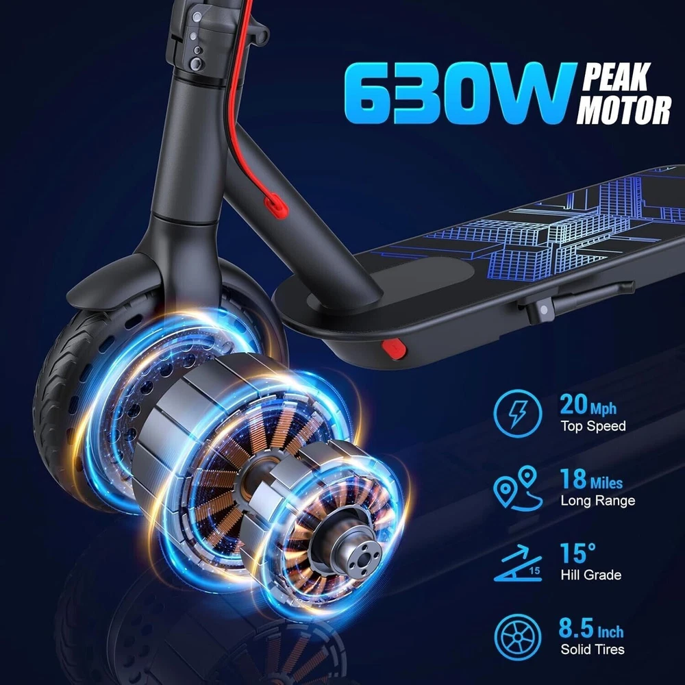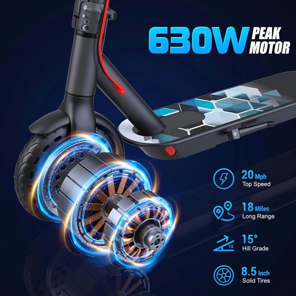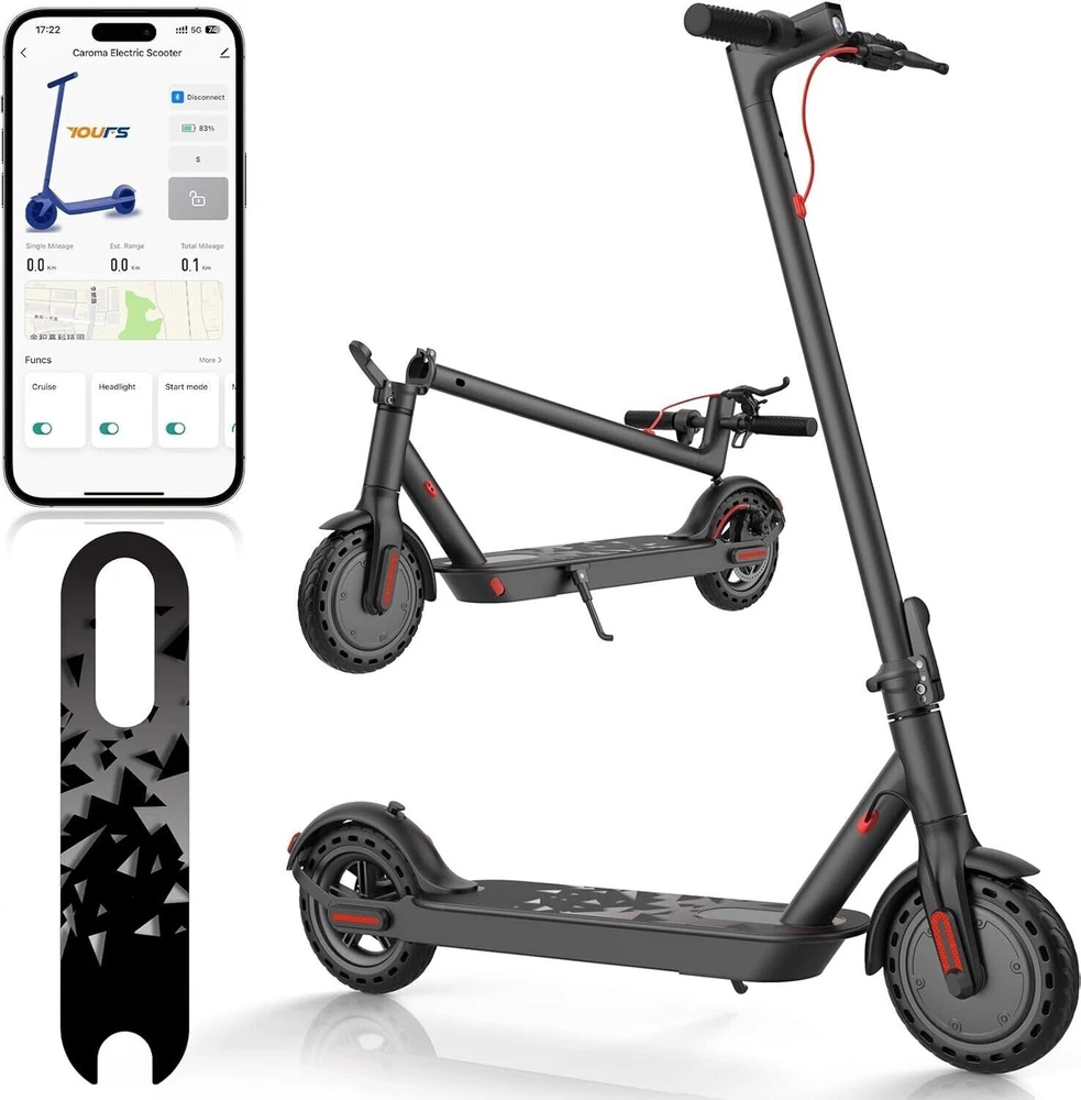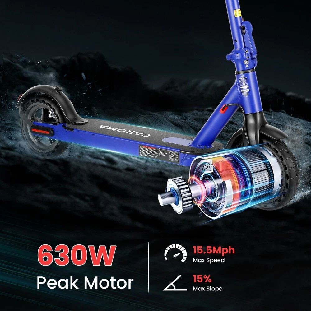 Product Description About this item Powerful Motor: CAROMA electric scooter for adults features a peak 630W front-wheel motor, delivering strong and efficient performance. It can reach speeds up to 20 MPH, making it perfect for both quick commutes and leisurely rides Long-Range Battery: Equipped with a 36.5V battery, this e scooter for adults offers a maximum range of 18 miles on a single charge. This ensures you can travel longer distances without worrying about running out of power, ideal for daily use Adjustable Speed Modes: Caroma electric scooter adults comes with three speed modes: 6 MPH, 10 MPH, and 20 MPH. This allows you to easily adjust your speed to match different riding conditions and preferences, offering flexibility and control Durable Tires and Brakes: Featuring 8.5-inch solid, puncture-proof tires, you can ride Caroma adult scooter confidently on various terrains without the fear of flats. The rear-wheel disc brake provides high stability and excellent braking performance for added safety Lightweight and Portable: Weighing only 27.5 lbs and featuring a foldable design, this motorized scooter for adults is easy to carry and store. Despite its lightweight frame, it supports up to 265 lbs, making it suitable for a wide range of riders. The LED display shows speed, mode, and battery life for added convenience Bright Lights: Caroma electric scooter comes with a headlight and taillight to keep you visible at night, which ensures your safe while riding in the dark Connected to APP: Caroma e scooter can be connected to the APP in your phone by bluetooth, and you can view battery level, mileage, riding record and control buletooth, digital lock, cruise system, speed mode and light on your phone about the scooter