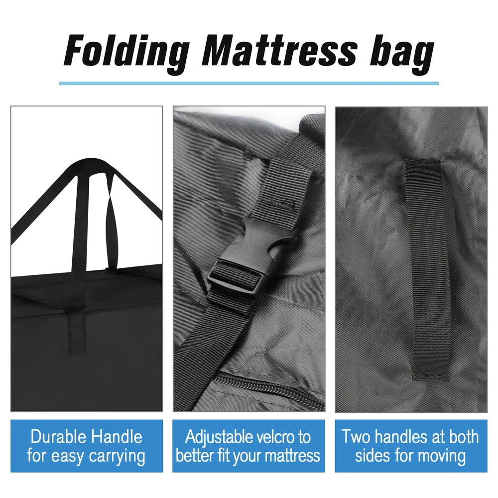 Size:39 x 26 x 13 inch(Not included mattress); It is with open mattress measures 75 x 38 x 4 inch,folded mattress measures 38 x 25 x 12 inch tri-folding twin memory foam topper.Note: The bag does not fit 6 inch Thickness of the mattress Material: The twin tri foldable mattress cover is made of lightweight oxford material, which is tear-resistant and can protect and your folding mattress well Portable Design: The carry bag of trifold mattress is designed with a premium quality 3-side metal zipper, which makes it easy to put your folding mattress in, and the handles on both sides can be easily moved.note:The package may have an unpleasant odor when first opened. You can take the product out and let it sit for a while until the odor dissipates before using it Multiple protection: The bags can be dustproof, waterproof, sunscreen, and can also prevent pets from damaging the mattress. The zipper is not waterproof, please do not place it for a long time in rainy days. Service: hopes to bring you a pleasant shopping experience. If you have any questions in the process of purchasing and using,you can us in time