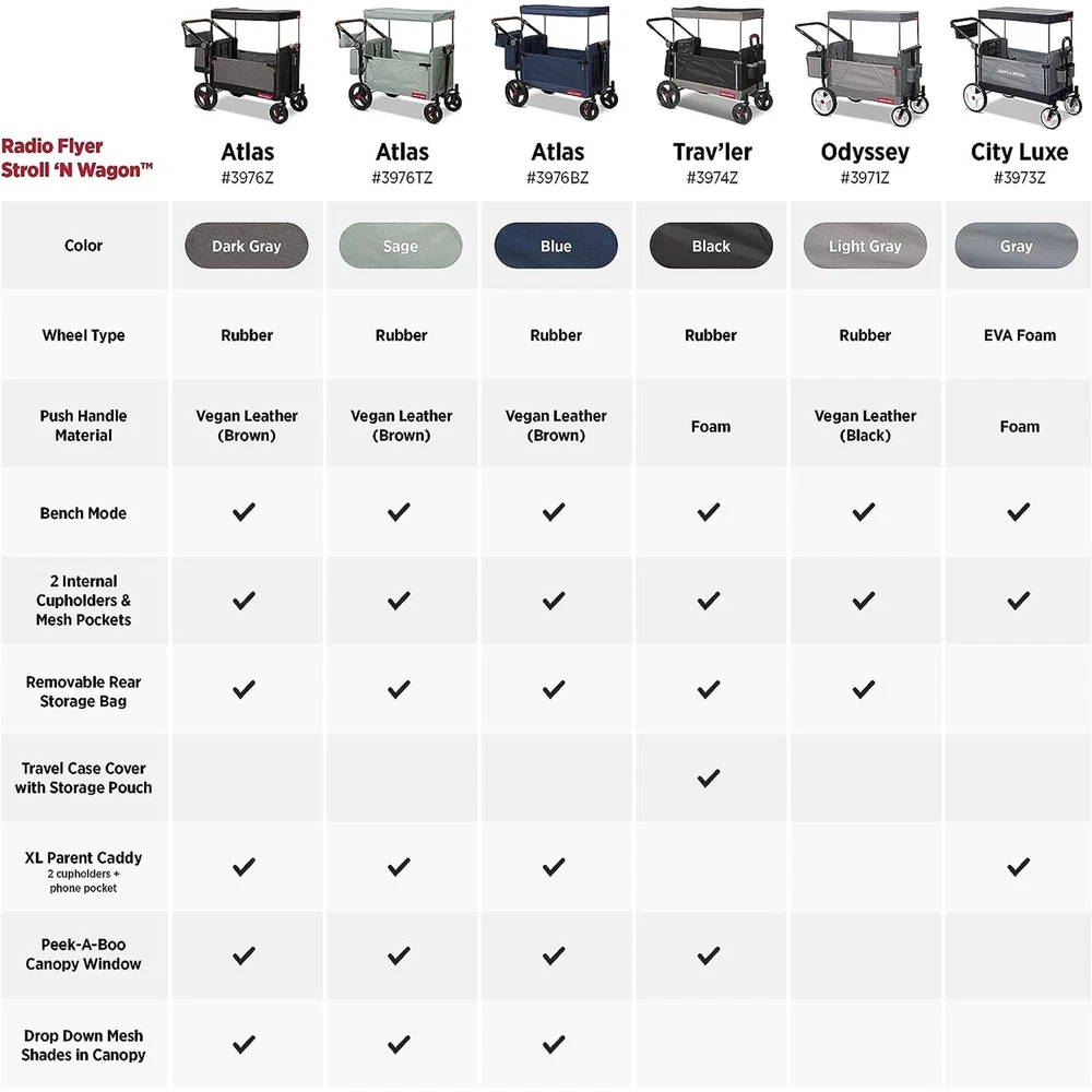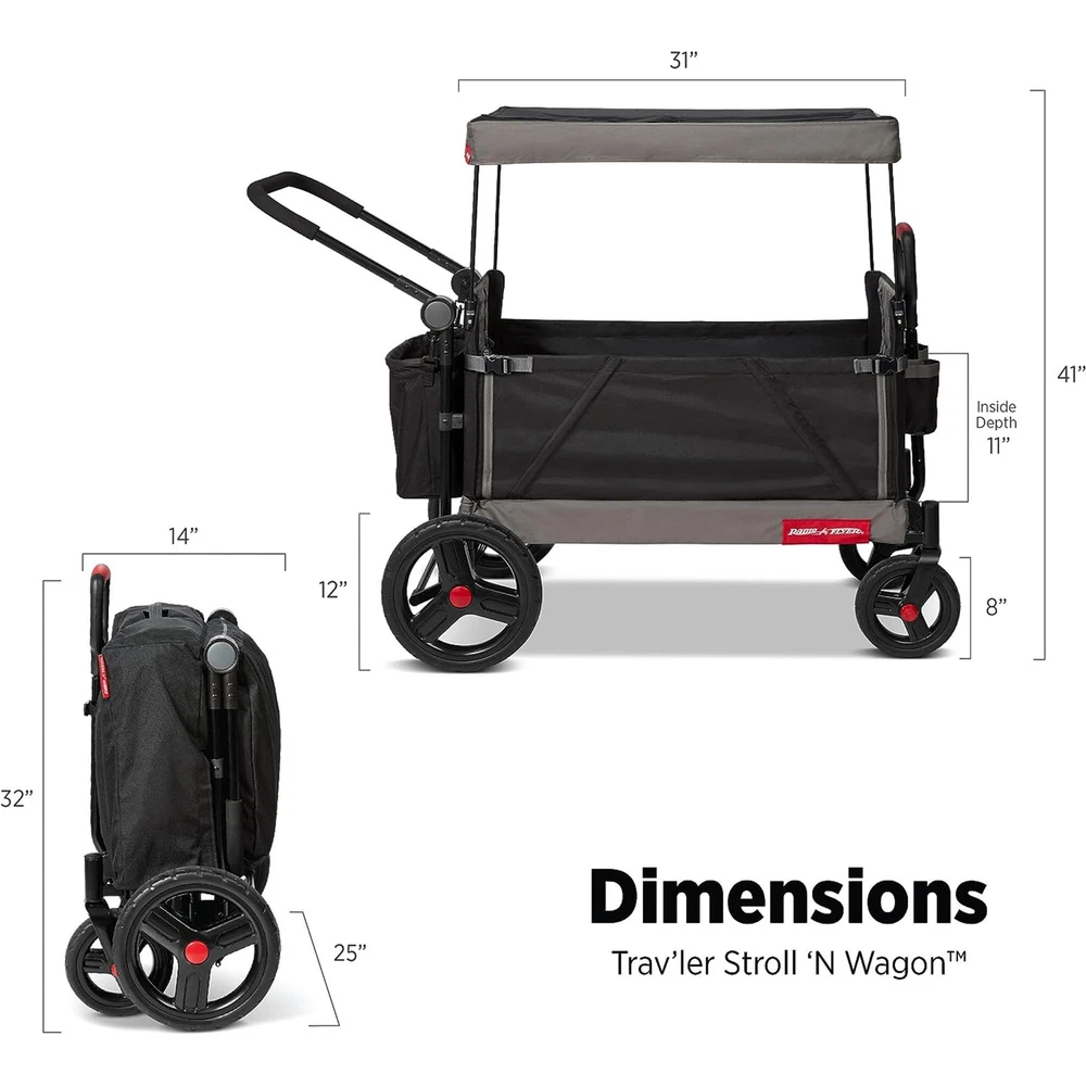 Baby Wagon Smooth Ride: Toddler wagon keeps kids comfortable on the trail, beach, or wherever life takes them; Suitable for ages 1 year and up and accommodates up to 120 pounds Push Pull Wagon Features: Separate handles in front and back are adjustable and collapsible, making it ideal as a pull toy or as a push wagon for kids Toy Wagon Compact Design: Easily foldable Radio Flyer wagon with a convenient travel case for easy storage and access to toddler outdoor toys during family journeys Toddler Push Cart Convenience: Includes travel wagon cup holders, interior mesh pockets, and enough space for up to 2 kids; Baby wagon toy converts to bench mode for seating Kid Wagon Safety Features: Rear foot brake, 5-point safety harness, and Ultra-Violet protective canopy with peek-a-boo mesh keep your children secure while riding the all terrain stroller wagon Product Dimensions 47.24"D x 24.41"W x 41.34"H Material Fabric Color Black Special Feature Portable Product Dimensions 47.24"D x 24.41"W x 41.34"H Material Fabric Color Black Special Feature Portable Number of Shelves 1 Target Audience Unisex Adult Handle Material Aluminum Item Weight 37 Pounds Number of Wheels 4 Weight Limit 120 Pounds Assembly Required Yes Caster Type Pneumatic Frame Material Metal Item Weight 37 pounds