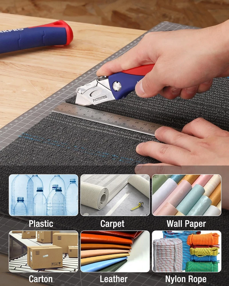 Safe to use. This knife cutter features a quality steel handle and an anti-slip ABS grip, providing more security. The ergonomic curve of the handle fits your hands. No need to worry about the blade slipping from your hand while working. Also, our razor knife is built with a back lock that safely keeps the blades in place, allowing one-hand easy opening and close Quick-change mechanism. Your brand-new work knife comes with an easy blade release mechanism that allows you to safely change the blades and helps prevent injury. Just push the head cover of the blade and drop down the cover of the blade. Our utility knife is compatible with most standard-sized utility knife blades for extra convenience Portable & lightweight design. Our box cutter knife is lightweight and compact, making it easy to take anywhere. It comes with a belt clip, so you can quickly clip it on and off. Carry it with you on your belt, pocket, or bag so you’ll always have it when needed. You can store up to 5 extra blades in the handle Use for various applications. WORKPRO utility knife is built to last. It can be used for various jobs that you may need to get done. It cuts through paper, carpet, plastic, cartons, cloth, bags, leather, PVC, drywall, and more. Get more work done with our sturdy cutter knife Long-lasting utility blades. WORKPRO folding utility knife is made from quality steel which makes it sturdy and long-lasting Product Description WORKPRO Utility Knife & Blades Add to Cart Add to Cart Add to Cart Add to Cart Add to Cart Add to Cart Add to Cart Customer Reviews 4.6 out of 5 stars 10,403 4.7 out of 5 stars 1,820 4.7 out of 5 stars 3,551 4.7 out of 5 stars 1,465 4.7 out of 5 stars 3,551 4.7 out of 5 stars 17,605 4.8 out of 5 stars 1,232 Price $9.99 $ 9 . 99 $15.99 $ 15 . 99 $14.99 $ 14 . 99 $15.99 $ 15 . 99 $14.99 $ 14 . 99 $9.99 $ 9 . 99 $14.99 $ 14 . 99 Foldable ✔ ✔ ✔ ✔ ✔ ✘ ✘ Retractable ✘ ✘ ✘ ✘ ✘ ✘ ✘ Quick Blade Change ✔ ✔ ✔ ✔ ✔ ✔ ✔ Blades Storage ✔ ✔ ✘ ✘ ✘ ✔ ✔ Extra Blades 5 15 10 — — 100 100 1 5 Extra Blades in Handle 2 Thumb Rest 3 Sharpe Blade 4 Belt Clip Blade Storage in the Handle Push the button to open the storage compartment Back-Lock Release Push here to close the utility knife Belt Clip Design Stainless steel belt clip for easy access Long-lasting Use Heavy duty construction for contractor use