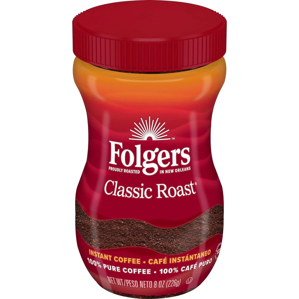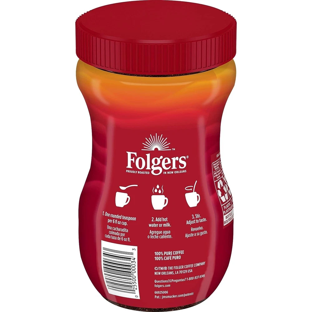 Product Description Product Description It’s the taste you love with a flip-top jar that’s easy to open! Just one rounded teaspoon yields a cup full of classic Folgers flavor and aroma. Easy to open, easy to use and easy enjoyment with every sip. Manufacturer Contact Information Orrville, OH 44667 USA. From the manufacturer Brand Folgers Item Form Instant Flavor Classic Roast Caffeine Content Description Caffeinated Roast Level Medium Roast Contains one (1) 8-ounce jar of Folgers instant coffee The classic Folgers taste you love in instant coffee form Just add water or milk and stir Enjoy hot or iced Proudly roasted in New Orleans