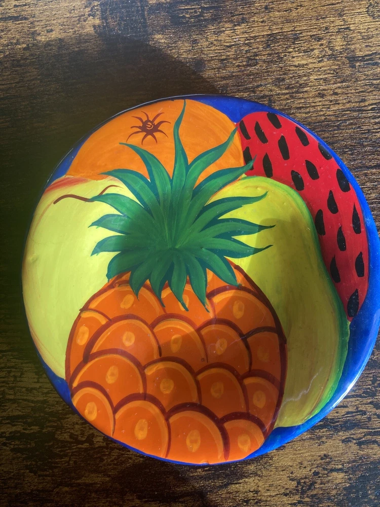 This Folkart terracotta plate is handmade and features a vibrant fruit theme design that is hand painted. With a diameter of 6 inches, Made from terracotta, this plate exudes a rustic charm and is ideal for display on your walls. It is not marked, but probably from Mexico. Very vibrant colors. Photos do not do justice to depict colors.