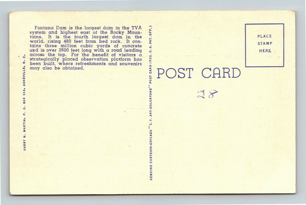 Type: Printed (Lithograph) Unit of Sale: Single Unit Era: Linen City: Fontana Dam Original/Licensed Reprint: Original Region: North Carolina Theme: Cities & Towns Country/Region of Manufacture: United States Subject: Cities & Towns Postage Condition: Unposted Country: USA