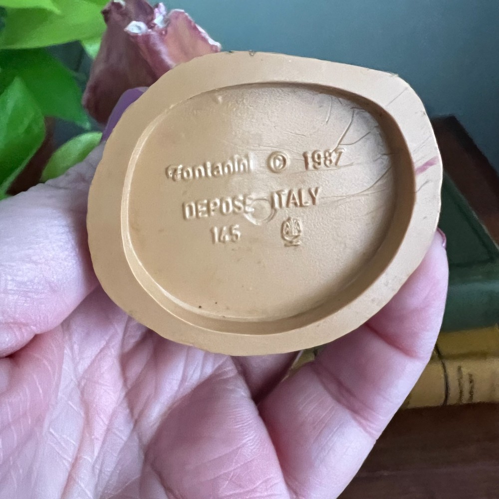 Fontanini “Simeone” nativity village figurine. Marked © Fontanini 1987, Depose Italy, and mold number 145 on the base. Made in Italy. This 5 inch scale figure depicts Simeone carrying a basket of fruit and is part of the Fontanini nativity village collection. Details: • Simeone • © Fontanini 1987 • Depose Italy • Mold number 145 • Made in Italy • 5 inch scale Condition: Preowned condition. No cracks or structural damage observed. Paint appears intact. Please review all photos carefully for complete condition details. A nice addition to a Fontanini nativity or harvest village scene.