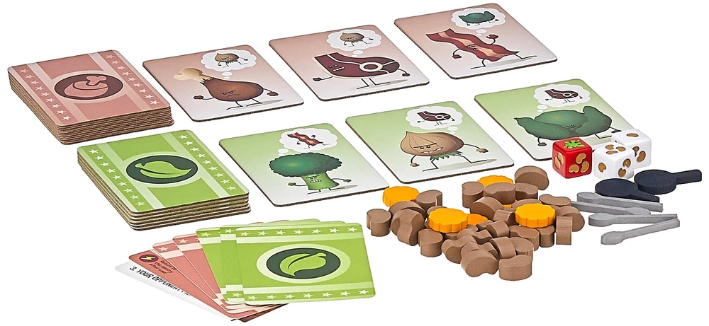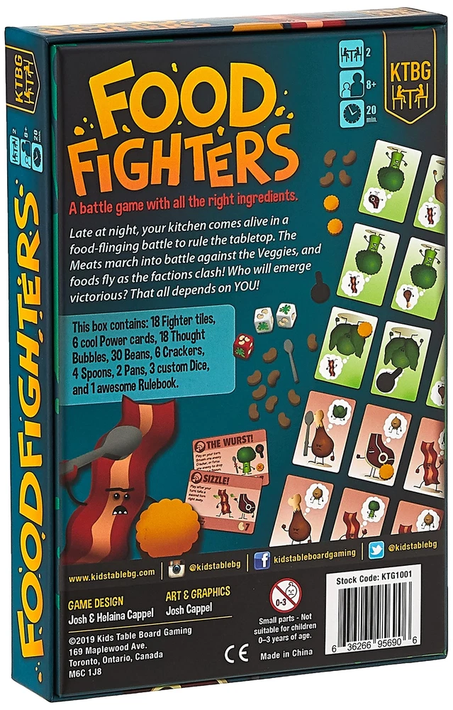 Firefighter is a fun and light -player battle game - each player controls a team of foods trying to win a food fight against the opposing team. First player to knock out three matching foods from the other team wins! you and your opponent each control a faction of fighting foods. On your turn, you can move a food fighter, or roll dice to attack an opponent (that your food fighter is thinking about and that is in reach), or roll for beans (cash). after that you can spend your beans to buy awesome gear from the or power cards that are unique to your team. Then it's the other guy's turn. Keep going until you've knocked out three of a kind on your opponent's team, and you've won! For 2 players 20-30 minute playing time Fun and light -player battle game