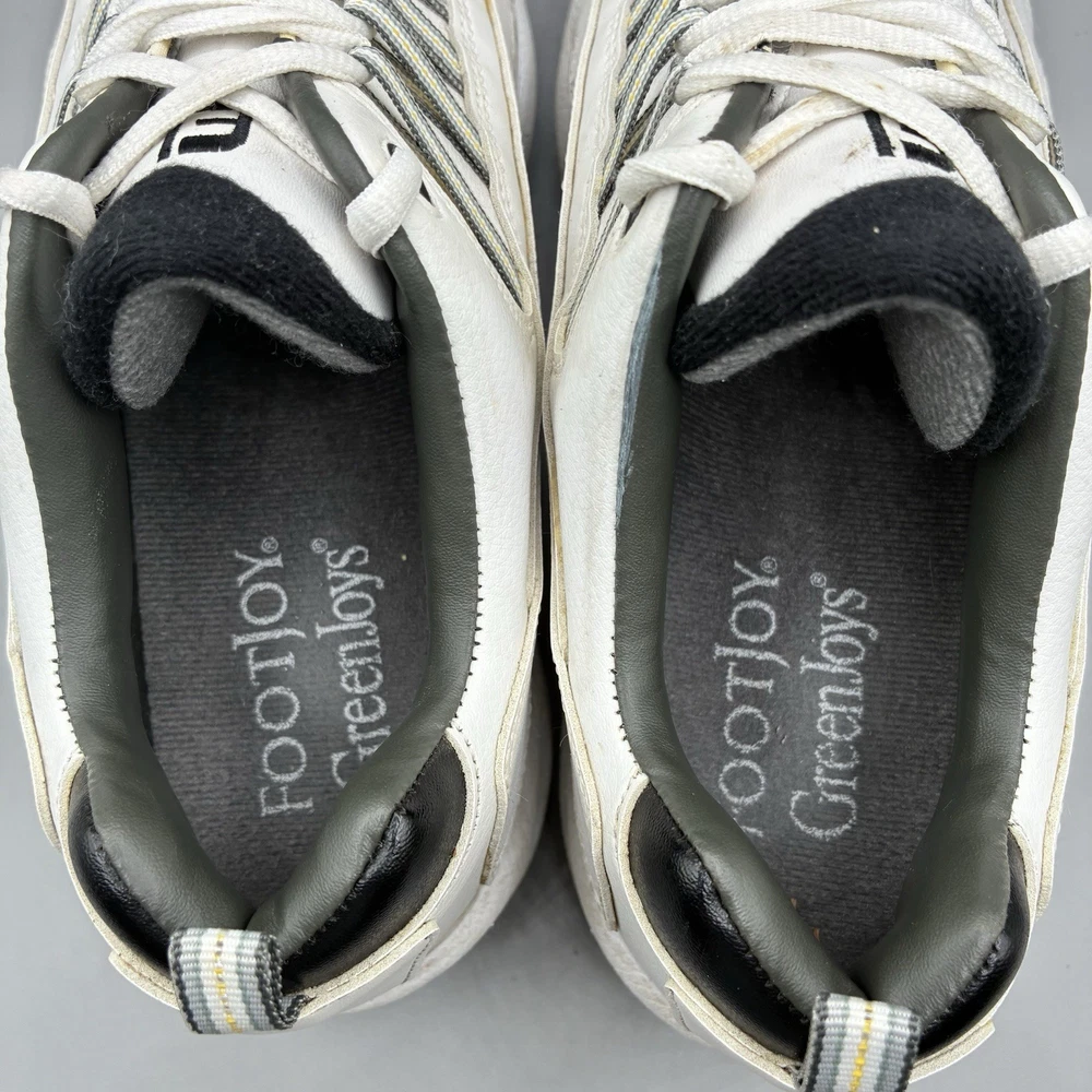 FootJoy GreenJoy Spike Golf Shoes Men’s 8.5 M White Leather Lace Up Sneakers Shoes are in good pre-owned condition. Has minor yellowing from wear. Smoke free and pet free home. We list new stuff everyday! Feel free to send offers anytime! Please review all pictures and ask any questions you’d like before purchasing! Shipping next business day! The FootJoy GreenJoy Spike Golf Shoes Men’s 8.5 M in White Leather are stylish lace-up sneakers designed specifically for golfing activities. They feature a rubber outsole with spikes for added traction, making them perfect for summer, fall, and spring seasons. The shoes are crafted from high-quality leather with a comfortable synthetic insole, ensuring durability and performance on the golf course.