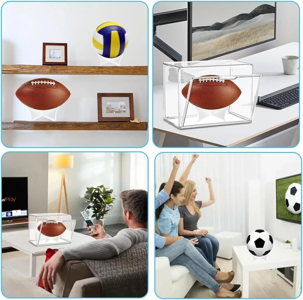 Acrylic 【High Quality Material】Our football display case is made of clear acrylic, it is waterproof and dirtproof, with a UV protection function, you can place your balls in the display box, keep out ash and dust, which protects your item from fading and always offer ultra-clear viewing. Great for protecting your cherished keepsakes or collectibles 【Stackable Design】Our stackable clear football display case is designed with an interlocking system that makes sure they won’t topple easily. You can stack it to decorate your house as well without worrying that it will break. The magnetic switch makes it easy to open and close. 【Suitable for Official Size Football 】The size of the football display box is 14.17"x8.66"x10.62" (36cmx22cmx27cm),and is perfect for displaying any Official size football. NOTE: The football is NOT included in the package. 【Easy Assembly】The handbag box is disassembled into 7 parts, you need to assemble after receiving the product. Don't worry, it is very simple, no tools required, each box can be installed in minutes. There are instructions in our package and you can assemble the box either by following the instructions. 【Multi-functional Display Case】The inside football stand can be movable when you display others. Display boxes can not only be used to store handbags, books, shoes, toys, cameras but also for the storage and display of luxury goods and collectibles such as artworks, footballs, cameras, etc.