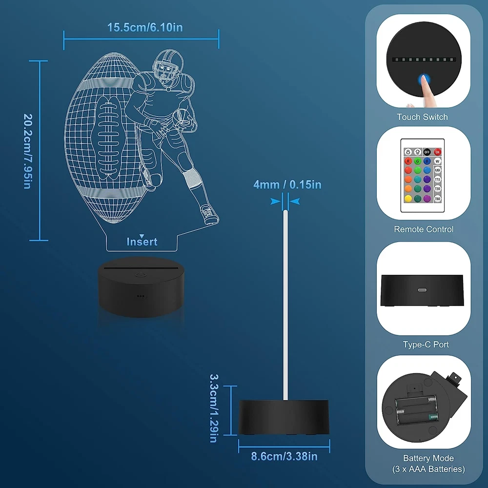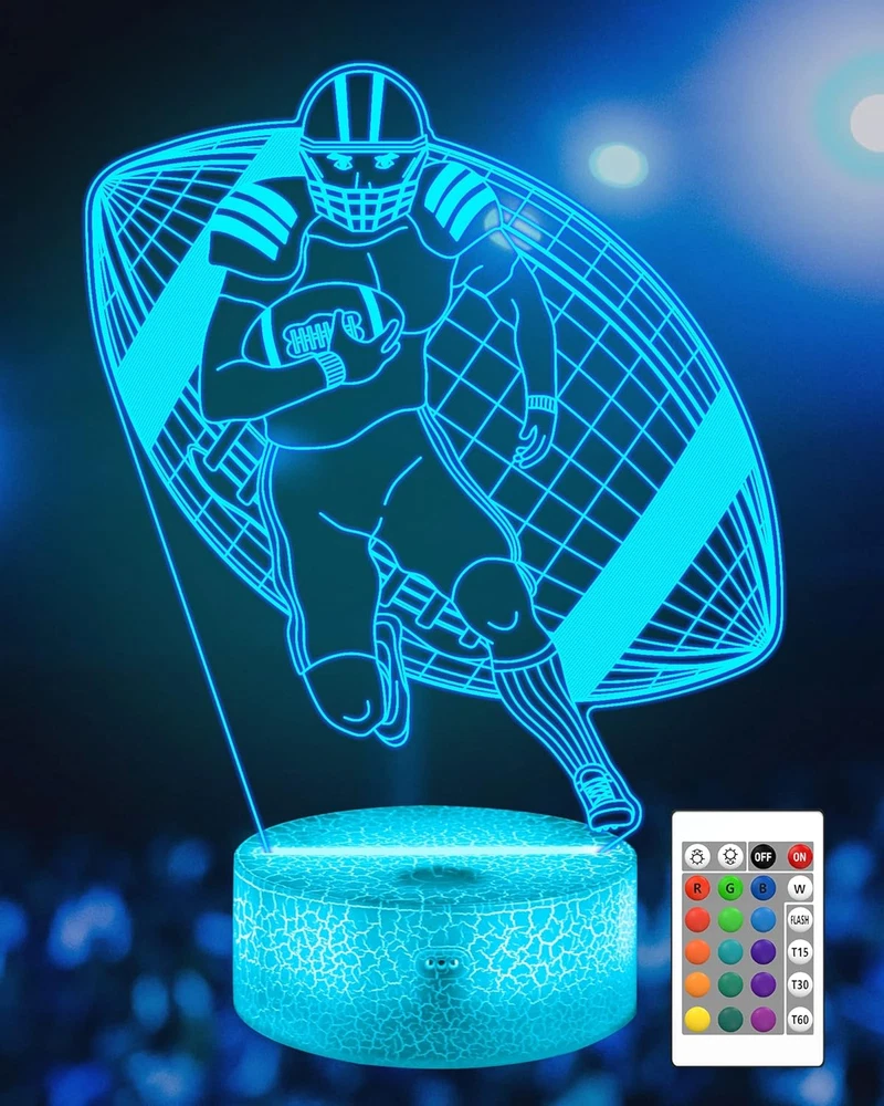 Football Player 3D Nightlight, Rugby Illusion LED Lamp with Remote & Touch Control, 16 Colors Changing Dimmable, Great Bedside Decor Birthday Gift for Outsports Lover Children Kids Boys Upgrade your daily routine with Football Player 3D Nightlight, Rugby Illusion LED Lamp with Remote & Touch Control, 16 Colors Changing Dimmable, Great Bedside Decor Birthday Gift for Outsports Lover Children Kids Boys — premium build for reliable performance and long-lasting value. Enjoy fast handling, friendly support, and a risk-free purchase backed by easy returns. Trusted seller with excellent feedback Popular item — often sells out quickly 30-day returns, no questions asked Key Benefits Feel the quality: durable materials and clean finish Save time: quick setup and easy everyday use Peace of mind: hassle-free support via eBay Messages Smart value: excellent price–performance for home, office, hobby, or professional use Item Specifics Item model number FS-2810-9999 Light Source Type LED Style Art Deco Number of Items 1 Power Source Battery Powered Number of Light Sources 1 Control Method Remote Theme Children,Novelty Batteries Included? No Lighting Method LED Lamp Type Night Light Number of Pieces 1 Room Type Bedroom Efficiency Highly Efficient Product Dimensions 6.5"D x 8.8"W x 1.6"H Material Acrylic Installation Type Decor Light Output Maximum 10 Lumens Model Name 3d lamp Finish Type Polished Specific Uses For Product Indoor use only Indoor/Outdoor Usage Indoor Bulb Base E26 Light Color Multicolor Water Resistance Level Not Water Resistant Batteries Required? No Item Weight 281 Grams Base Material Acrylic Special Features Corded, Dimmable, Timer Special Feature Corded, Dimmable, Timer Shade Height 15 Centimeters Part Number KF-2115 Shade Color Multicolor Mounting Type Tabletop Color Football Sensor Technology Capacitive Touch Is Cordless? Yes Product Benefits creates a unique 3d illusion effect for a warm and unique room ambiance, safe for kids, versatile with 16 colors and remote control, great gift option Is Waterproof False Shape rectangular prism Voltage 5 Volts Recommended Uses For Product Decoration Shade Material Acrylic, Acrylonitrile Butadiene Styrene Finish types Polished Included Components Bulb Switch Type Touch Description 【Creative 3D Illusion Effect】 The Visual night lights are made with 3d software to create a actual optical gorgeous 3d illusion with Football image, which is novelty and charming. Illusion effect makes your room more unique and warm, helping you to sleep better 【16 Colors Remote Control & Timing function】 The 3d illusion Football night light comes with remote control and touch control to adjust the 7 or 16 different colors as you want. With the remote control, the Football night light can be fixed in static or gradient color and can adjust brightness to decorate Kids' room, bedroom, living room, etc 【Dual Power Mode】This Football night light for chirldren can be Compatible with all USB interface, such as Laptop, Computer, USB Power Bank, USB Power 5V Adaptor (Not included), and any other with USB Connector. And also can use 3xAAA Batteries. (Not included) which is very easy and convenient 【Safety for Kids】The 3d Football lamp for kids is made from Safe approved material, safe and harmless to the human body. The night lamp comes with soft, uniform, non-flicker light, making it safe to your kids and family. It is a very human and practical kids lamp for room 【Great present 】It's a great present for christmas, Father's Day Mother's Day, birthday, advertising promotional, holiday, tourist attractions, Anniversary, Housewarming, Graduation, Engagements, Valentines, and Romantic time. As decorative light, and as best gift for your friends or children Product description Attivolife Football Player Night Light 16 Colors Changing/Remote Control/Touch Control/Timing/Dimmable The video showcases the product in use. The video guides you through product setup. The video compares multiple products. The video shows the product being unpacked. 16 Colors Changing with 4 Modes Flashing Auto-off Timer Design Press twice to activate the timing setting. T15/T30/T60: auto shutdown in 15/30/60 mins. Press twice again to double the time. Auto shutdown up to 12 hours. Dimmable & Remote Control Attivolife night light with a dimmable function, you can adjust the brightness on the remote control, so that children can protect their eyes while playing and sleeping. Greative Gift Idea Birthday Gifts/Christmas Gifts/New Year's Gifts/Anniversary Gifts/Valentine's Day Gifts/Graduation Gifts/Halloween Gifts/Easter Gifts More Night Lamp Available Add to Cart Add to Cart Add to Cart Add to Cart Add to Cart Add to Cart Add to Cart Customer Reviews 4.6 out of 5 stars 379 4.6 out of 5 stars 1,920 4.6 out of 5 stars 1,921 4.3 out of 5 stars 97 4.6 out of 5 stars 379 4.8 out of 5 stars 249 4.5 out of 5 stars 766 Price $21.99 $ 21 . 99 $16.55 $ 16 . 55 $20.99 $ 20 . 99 $14.71 $ 14 . 71 $20.99 $ 20 . 99 $19.99 $ 19 . 99 $18.99 $ 18 . 99 Switch Mode Touch & Remote Touch & Remote Touch & Remote Touch & Remote Touch & Remote Touch & Remote Touch & Remote Color 16 16 16 16 16 16 16 Power Source Battery or USB Cable Battery or USB Cable Battery or USB Cable Battery or USB Cable Battery or USB Cable Battery or USB Cable Battery or USB Cable Timing Function Yes Yes Yes Yes Yes Yes Yes Battery Included NO NO NO NO NO NO NO 8.8 "h x 6.5 "h x 1.6 "h. Weight: 281.0 grams Package Includes 1× Football Player 3D Nightlight, Rugby Illusion LED Lamp with Remote & Touch Control, 16 Colors Changing Dimmable, Great Bedside Decor Birthday Gift for Outsports Lover Children Kids Boys User manual (if included) Invoice by email (VAT shown on request) Shipping & Returns Fast handling and dispatch from our warehouse Tracking provided for parcel shipments 30-day returns according to eBay listing settings Why Buy From Us? Top-rated customer experience Secure checkout through eBay Reliable packaging — arrives r