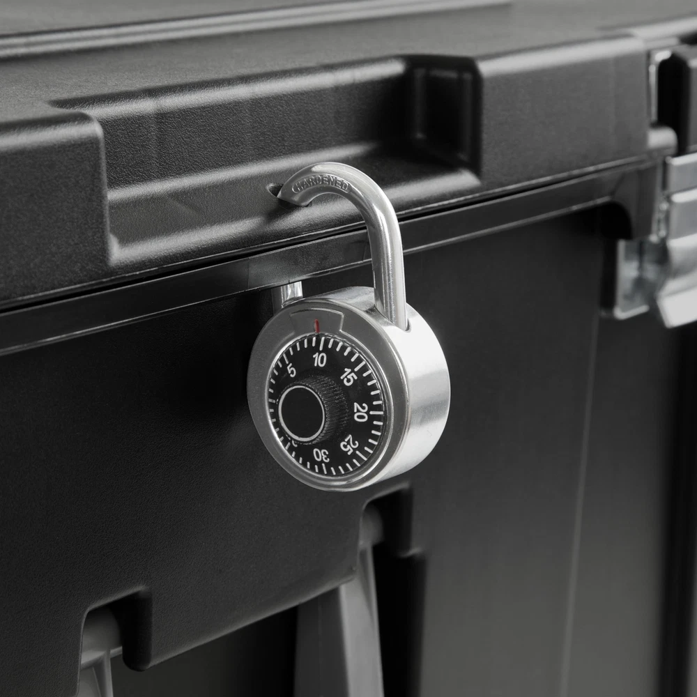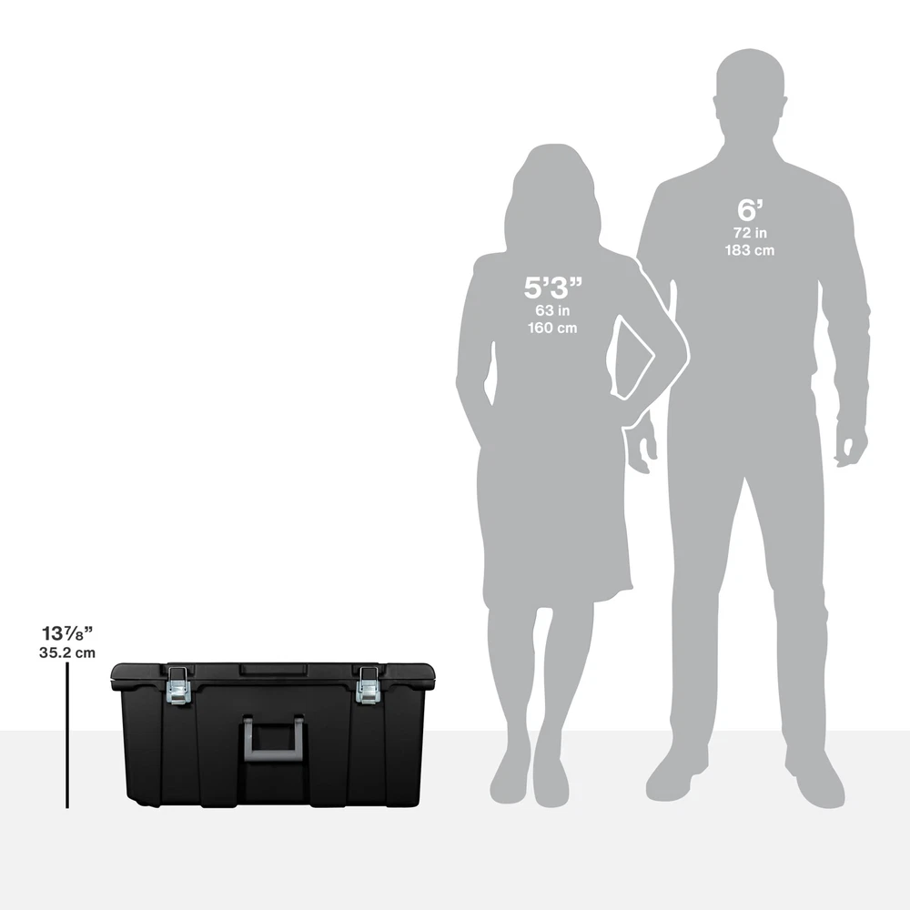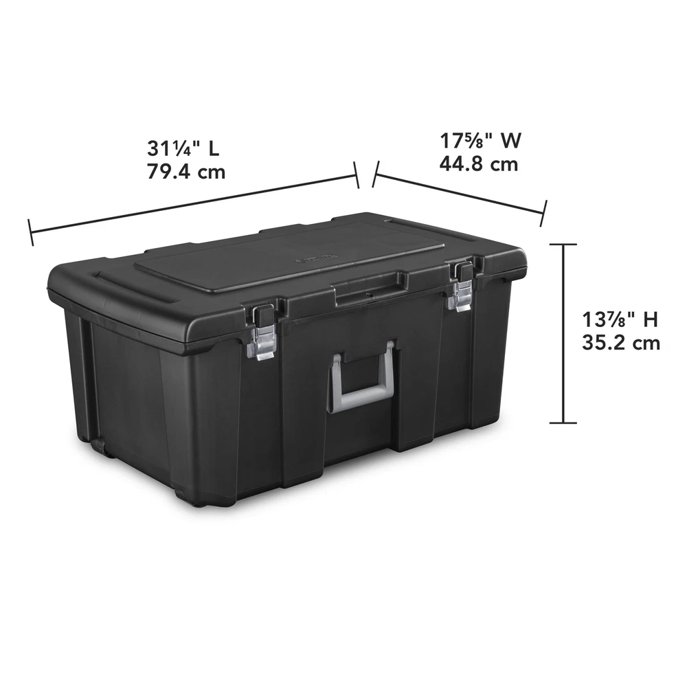Need a durable and portable storage solution for camping or moving? The Footlocker is the ideal multi-purpose solution! It offers ample storage capacity and quality construction that is ideal for storing camping gear, sporting equipment, and more. Pack it up and use it to move into a dorm room, and keep your items concealed in your living space for easy access. Smooth rolling wheels and ergonomic handles allow for easier transporting of heavy loads. Use the integrated side handles or the full grip bail style handle when carrying lighter loads. The footlocker utilizes metal hinges and latches and accepts a standard-size padlock for added security. The overall assembled dimensions of this item are 31 1/4" L x 17 5/8" W x 13 7/8" H. Plastic Footlocker Adult Black Outside Dimensions: 31 1/4" x 17 5/8" x 13 7/8" Interior Dimensions at bottom: 26 1/2" x 13 3/4" x 12 3/8" Durable construction makes it the ideal solution for storing items in the garage, attic or basement or for transporting to camp or college Choose between the integrated handles on the sides of the Footlocker or the full grip bail handle when transporting Wheels allow Footlocker to be easily moved without having to carry it Features metal hinges and latches and accepts a standard size padlock for added security BPA-free and phthalate-free