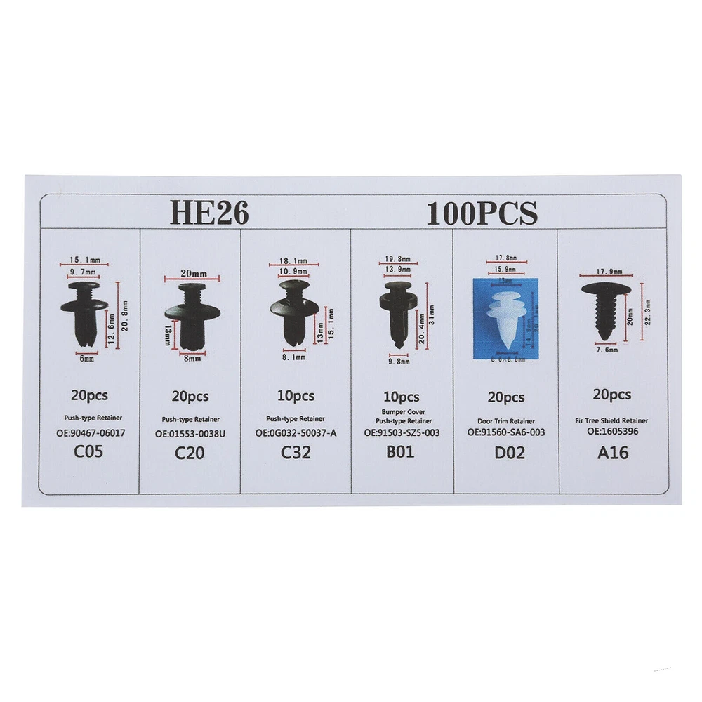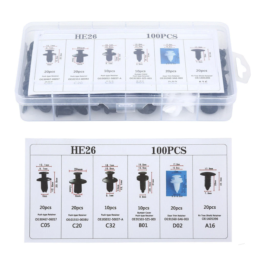 100Pcs Clip Trim Car Push Pin Rivet Bumper Door Panel Retainer Fastener Kit Description: Features: Various fasteners to meet the needs of different parts of the car. Used widely for car fender, bumper, door or other car surface. High quality plastic material, durable and long service life. Note: All vehicles have a range of different clips used on them. Different models have different sizes and there are no universal clips. Please check as much as possible before buying. Package including 100pcs Clips + 1 Plastic Box Clip of C05 Screw Type Clip Retainer Rivet Condition: Brand New Material: Black Nylon Size Approx: Head Diameter: 15mm Stem Length: 12mm Fits Into 6mm Hole For GM Replace 20426301 For Mazda Replace 9926-50-625 For Toyota Replace 90467-06017 For Toyota Replace 90467-06017-20 For Toyota Replace 90467-06017-41 For Auveco A14260 Clip of C20 Fender Liner Clip Splash Shield Blind Rivet Fits For Mazda Replace FB01-56-964 Fits For Honda Replace 90675-SB3-003 Fits For Nissan Replace 63876-95596 Fits For B16 B18 B18C B20 H22A EK9 EG6 Fits For Accord Civic Prelude CR-V Del Sol CRX Fits For INTEGRA GSR S2000 AP1 MUGEN Fits For TYPE R Si Condition: Brand New Material: Black Nylon Size Approx: Head Diameter: 20.6mm (0.81") Stem Length: 9.5mm (0.37") Fits Into 8mm (0.32") Hole For Auveco A16000 Clip of C32 Push-Type Retainer Black Nylon Head Diameter: 20mm Stem Length: 13mm Fits Into 8mm Hole Fits For Mazda 6 2002-2006 Fits For Mazda 323 1998-2003 Fits For Ford Aspire Fits For Mazda Replace B092-51-833 Fits For Ford Replace MB-455-56143 Fits For Kia Replace MB455-56-143 Fits For Nissan Replace 09409-09302 Fits For Hyundai Replace 86590-28000 For Auveco A17632 Clip of B01 Front & Rear Bumper Retainer Push Type Clip Condition: Brand New Material: Black Nylon Head Diameter: 20mm Stem Length: 18mm Fits Hole Size: 10mm For Honda Replace 91503-SZ5-003 (1996-On) For Acura Replace 91503-SZ5-003 For Auveco A20564 For PAS9282, PAS938 Clip of D02 Interior Trim Board Retainer Clip White Nylon Top Head Diameter: 13mm Middle Head Diameter: 16mm Bottom Head Diameter: 18mm Stem Length: 15mm Stem Diameter: 8.5mm x 8.5mm Overall Length: 20mm Fits For GM Replaces 94858299 Fits For Geo Prizm 1998-On Fits For Toyota Replaces 90467-10161 Fits For Sienna, Solara & Tercel 1990-On Fits For Previa 2007-On, Corolla 2003-On Fits For Lexus LS460, LS460L 1990-On For Auveco A18876 Clip of A16 Radiator Yoke, Fender & Bumper Shield Retainer Christmas Tree Type Clip Black Nylon Head Diameter: 17.8mm Stem Length: 20mm Stem Diameter: 7.6mm For GM Replaces 1595864, 1605396 For Ford Replaces 388577S For Ford Replaces W705589-S300 For Auveco A11146, A15414 Shipping: All items will be checked before packing. All items are new and of high quality. 1. Can you tell me when my order will be shipped? Actually we will ship the item within 1 business day after receiving orders, excluding weekends and public holidays. But USPS need to take longer time to update tracking info and arrange delivery during the challenging time for now. If your order was not shipped more than 3 business days, please contact us with your order number to get quick support. 2. My item has not arrived, what's taking so long? Sometimes items take longer than expected, especially if it's going far or to rural area. Check with your post office to see if your item has been held up. Sometimes USPS will not update a tracking number until it has arrived at its destination. If your item still has not arrived after a few days, let us know so we can double check for you and help solve it asap. Payment: 1. Instant PayPal payment is the preferred method of payment. We also accept payment via PayPal, DebitCard, Visa, MasterCard, Discover. 2. Items will be shipped to your eBay address. Please make sure it is correct. 3. If you want to ship to other address, please change your PayPal shipping address before you make payment. 4. Payment must be received 4 days after auction ended. Returns: 1. Customer satisfaction is our top goal. We believe our items are so outstanding. All products are quality checked. They are new and in good condition when shipped to our customers. We are convinced you will be happy with your Purchase. 2. We offer free return & money back guarantee. If you are not satisfied with your purchase for any reasons, you can return the item for refund or replacement/exchange. All returns must include the original packaging. 3. Please contact us first if you have any problems/questions/concerns. We will be happy to resolve any issues you may have in a cordial and friendly manner. Any items damaged because of incorrect installation will not be refunded. Please contact us for return or troubleshooting help prior to returning any products. 4. We appreciate your Postive Feedback, and will do the same in return. DO NOT leave negative feedback without first communication with us. Please allow max 2 business days for us to response. About Feedback: 1. When you satisfied with our product and services please leave us positive feedback. 2. If you have ANY questions with shipping, product or service, please Contact Us first before leaving feedback/write a review or filing a return case. We will solve the problem! If you have ANY questions with shipping, product or service, please Contact Us first before leaving feedback/write a review or filing a return case. We will solve the problem! We always put our customers first and your satisfaction is guaranteed. We offer free returns with any orders within 30 days from the date of delivery. No restocking fees, no administrative fees, no return shipping fee, and no hassle! We will email you when a prepaid return label is ready to download from your ebay account. You just have to print it out and drop the package off at a USPS facility. When we get it back, you will be notified and credited for the full price of the items/products that are returned. Since the shipping fees go directly to the delivery service, we are not able to refund 
