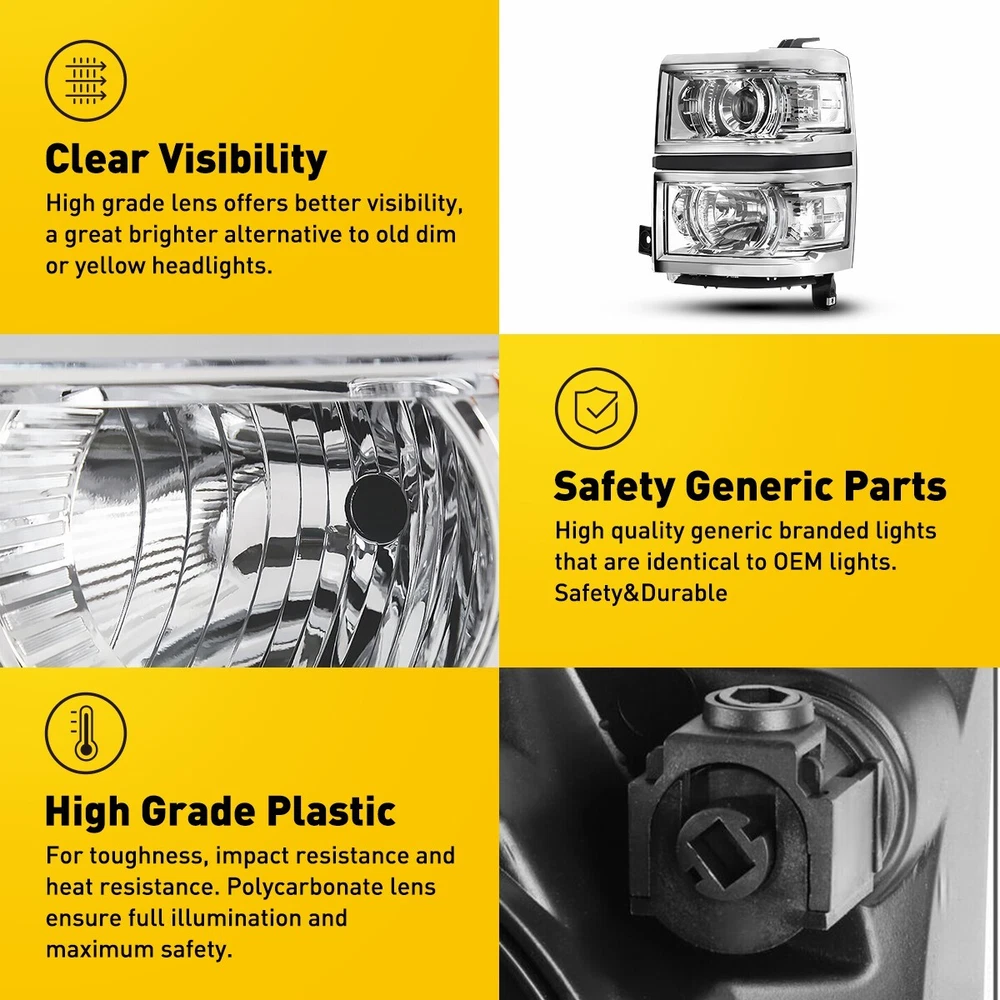 Fit for: 2014-2015 Chevy Silverado 1500 models only (Fit 2014 New Body style models only; Does NOT fit HD models) Specifications: OE number: 20933724, 20933725, 20933722, 20933723, 23172782, 23172783 GM2502389, GM2503389, GM2502395, GM2503395, GM2502410 Material: ABS+PC (ABS Plastic Housing/Polycarbonate lens) Appearance color: 1.Housing Color: Chrome 2.Lens Color: Clear 3.Reflector Color: White Note: Projector √ (include) DRL × (Not include) Bulb × (Not include) Features: *Easy to install: For 14-15 Chevy Silverado 1500 Projector White Chrome Housing Corner Headlights Fit for: 2014-2015 Chevy Silverado 1500 models only (Fit 2014 New Body style models only; Does NOT fit HD models) Specifications: OE number: 20933724, 20933725, 20933722, 20933723, 23172782, 23172783 GM2502389, GM2503389, GM2502395, GM2503395, GM2502410 Material: ABS+PC (ABS Plastic Housing/Polycarbonate lens) Appearance color: 1.Housing Color: Chrome 2.Lens Color: Clear 3.Reflector Color: White Note: Projector √ (include) DRL × (Not include) Bulb × (Not include) Features: *Easy to install: Direct replacement, drilling and cutting are not required. *Superior quality: Made of ABS and PC materials with toughness and heat resistance functions to ensure its long service life and durability. *Angle adjustment: Equipped with a headlamp Angle adjustment knob, you can adjust the best Angle of view through the knob. *Suggestion: 1.Please confirm the OE number before purchasing!!! 2.Professional installation is required!!! Package Included: Headlights *2 (Left+Right) Item Specifics Brand AUXITO Type Headlight Assembly Placement on Vehicle Front,Left,Right OE/OEM Part Number 20933724, 20933725, 20933722, 20933723, 23172782, 23172783 Fitment for 2014-2015 Chevy Silverado 1500 models only Specifics Fit 2014 New Body style models only; Does NOT fit HD models Manufacturer Warranty 1 Year Universal Fitment No Interchange Part Number GM2502389, GM2503389, GM2502395, GM2503395, GM2502410 Fitment Type Direct Replacement Number of Pieces 2 Fit for 2014-2015 Chevy Silverado 1500 models only Fit for 1 2014 New Body style models only; Does NOT fit HD models Manufacturer Part Number 20933724, 20933725, 20933722, 20933723, 23172782, 23172783 Material ABS PC (ABS Plastic Housing/Polycarbonate lens) Housing Color Chrome Lens Color Clear Reflector Color White Note Projector √ (include) DRL (Not include) Bulb (Not include) Features *Easy to install *Superior quality *Angle adjustment Package Included Headlights *2 (Left Right) KEYWORD CHROME HOUSING Clear CORNER HEADLIGHT HEAD LAMPS KEYWORD 1 LH RH headlights Chrome White Projector KEYWORD 2 Chrome Housing Headlights Lamps Left Right Pairs 14-15 KEYWORD 2 Chrome Housing Headlights Lamps Left Right Pairs 14-15 Warranty 2 year Payment Returns DESCRIPTION PAYMENT SHIPPING RETURN POLICY CONTACT US Shop Category Store Home LED Headlight ◈ H4 ◈ H13 LED Reverse Light ◈ T15/921/W16W LED License Plate Light LED Side Marker Light Car Parts & Accessories Tail Light assemblies Other Hot Item REPLACEMENT Radio Touch-screen GLASS Digitizer LCD For Chevy GMC 15-18 MYLINK USD 32.99 New Fits 2013-20 Nissan Pathfinder Front Left & Right Outer Bumper Cover Bracket USD 17.99 10ft Seal Strip Trim For Car Front Rear Windshield Sunroof Weatherstrip Rubber USD 12.99 Fuel Gas Door Lock Cylinder & Keys For Toyota 1995-2004 Tacoma 2000-2003 Tundra USD 13.29 Ignition Control Module 4 Pin HEI Distributor for GM Chevy 1974-1988 Replacement USD 11.39 Picture New List Item Projector Headlights Fits 2010-2014 Subaru Legacy Outback Replacement Left+Right USD 145.99 Sun Visor Strip Windshield Vinyl Banner Long Lasting Red Decal 60x10'' USD 12.99 For 2012-15 Honda Civic Sedan 12-13 Coupe Black Clear Headlights Assembly USD 109.99 For 2003-2023 Chevy Express GMC Savana Headlights with Bumper Signal Lamps L+R USD 104.99 For 2001-2004 Toyota Tacoma Chrome Aamber Headlights Built In Corner Lamps 01-04 USD 75.99 Help & Info Payment Policy Shipping Policy Return Policy FAQ About Us For 14-15 Chevy Silverado 1500 Projector White Chrome Housing Corner Headlights Fit for: 2014-2015 Chevy Silverado 1500 models only (Fit 2014 New Body style models only; Does NOT fit HD models) Specifications: OE number: 20933724, 20933725, 20933722, 20933723, 23172782, 23172783 GM2502389, GM2503389, GM2502395, GM2503395, GM2502410 Material: ABS+PC (ABS Plastic Housing/Polycarbonate lens) Appearance color: 1.Housing Color: Chrome 2.Lens Color: Clear 3.Reflector Color: White Note: Projector √ (include) DRL × (Not include) Bulb × (Not include) Features: *Easy to install: Direct replacement, drilling and cutting are not required. *Superior quality: Made of ABS and PC materials with toughness and heat resistance functions to ensure its long service life and durability. *Angle adjustment: Equipped with a headlamp Angle adjustment knob, you can adjust the best Angle of view through the knob. *Suggestion: 1.Please confirm the OE number before purchasing!!! 2.Professional installation is required!!! Package Included: Headlights *2 (Left+Right) Payment Returns All rights reserved. On Dec 13, 2024 at 18:08:33 PST, seller added the following information: