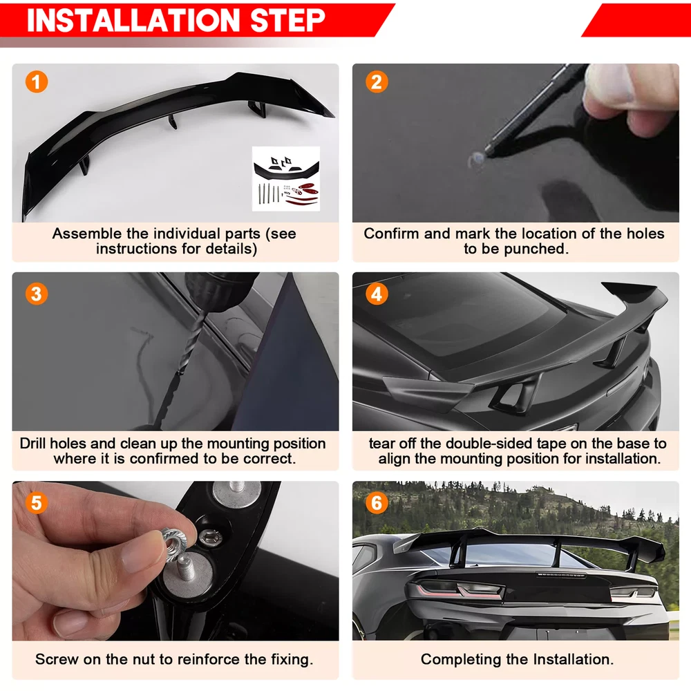 Home Payment Shipping About us Contact us Details Chevy Camaro 2016 - 2024 Rear Spoiler Features 【Compatible Vehicle Models】 Our rear spoiler is specifically tailored for Chevy Camaro 2016 - 2024 all models, including LS, LT1, LT, SS, and RS. Please ensure that your vehicle model is correct before placing an order. 【 Aerodynamic Excellence 】 Reduces 23% air resistance at 60+ mph for enhanced stability and fuel efficiency 【Durable & Lightweight】 Made of high - quality ABS material, this rear spoiler is durable, lightweight, and scratch - resistant. It provides your Camaro with a longer lifespan. 【Sporty Appearance】 The sleek black appearance endows your vehicle with a sporty and aggressive look. Its smooth design enhances the overall style of the vehicle, making it visually appealing and distinctive on the road. 【High Performance】 It can effectively reduce air resistance when driving at high speeds. This, in turn, improves driving stability and enhances the overall presence of the vehicle. Specifications Color: Glossy Black Material: ABS Compatible Models: Chevy Camaro 2016 - 2024 all models (LS, LT1, LT, SS, RS) Package includes 1× rear spoiler 1× accessories bag Note: Professional installation is highly recommended. If you need any help, please contact us. Shipping Policy Payment Method Returns Policy Shipping Policy All orders will be shipped within handling time ( Business Days ) after the payment is cleared. We use Standard / Expedited Shipping Service: all shipments will be with valid tracking number. If you didn't received your shipment within estimated shipping time , please contact us. We will check and offer a good solution to you . Our goal is customer satisfaction! Payment Method We accept multiple payment methods which ebay allowed . For faster service, please update your correct address before sending payment. We do not accept any transaction methods other than ebay. Returns Policy We offer 30 days exchange or return and money back policy If you feel unsatisfied with our product for any reason , please contact our professional customer team within 30 days ,you can choose exchange , return or refund , we will take care of your issue . If the product is defective or damage upon arrival, please contact us immediately don't open dispute , we will spare no effort to offer the best solution . As most of our products are aftermarket car parts, which DO NOT come with instructions.PROFESSIONAL INSTALLATION is highly recommended. Before install your item, please refer to internet or your local Auto parts store for some tips. Buyer assumes all risks for any improper installation and usage. NOTE : Any item that is approved for exchange or return, item will need to be in brand new condition, which means the item is never installed and needs to be kept in original packaging. Fees will be applied for missing parts or damages. We don't accept return if item got used , modification painting or damaged for improper installation. Whatever happens, please contact us. Our goal is 100% customer satisfaction. We will reply you within 24 hours on working days.
