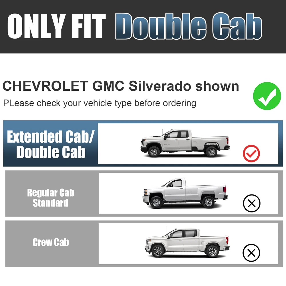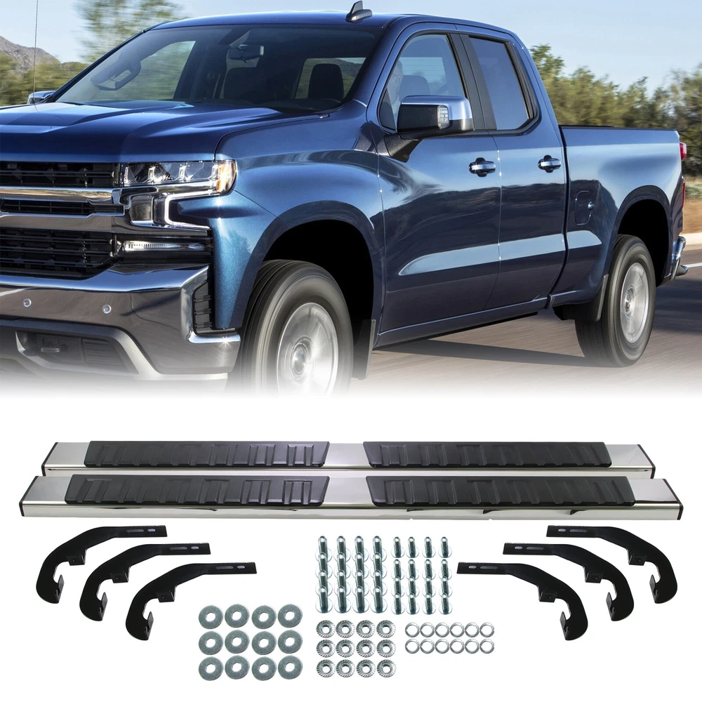 Specification Package Dimensions(LengthxWidthxHeight:inch): 78*8.19*8.97 Item Weight(lbs): 2.71 Item Size(LengthxWidthxHeight:inch): 77.21*7.41*8.19 Fitment Type: Direct Replacement Installation Instruction: Not Included Manufacturer Warranty: 1 Year Sealing End Cover: Yes Package Include: 1x Pair of Running Boards (Left + Right) 4 Brackets on Each Side Mounting Hardware Style: OE Style Only Fit: Double Cab Placement on Vehicle: Left+Right Material: ABS, Stainless Steel Finish: polished Color: Silver Package Weight(lbs): 7.11 Condition: New Manufacturer Warranty: 1 Year Fitment 2020-2024 GMC Sierra 3500 HD 2019-2024 GMC Sierra 1500 2022-2022 Chevrolet Silverado 1500 LTD 2020-2024 Chevrolet Silverado 3500 HD 2020-2024 Chevrolet Silverado 2500 HD 2019-2024 Chevrolet Silverado 1500 2020-2024 GMC Sierra 2500 HD 2022-2022 GMC Sierra 1500 Limited Features & Benefits 1. Made with durable, heavy-duty high light stainless steel and ABS plastic. Seamless joined ABS plastic tread with powder coated body surface to achieve great UV rays, rust, and slippery resistance. 2. Our running boards are made from the finest aluminum alloy, which is sturdy, durable, wear-resistant and rust-resistant. After repeated tests, they can resist the corrosion of salt spray, and withstand UV radiation without discoloration. 3. To a certain extent, they also help protect the paint on the side of the car from being scratched. At the same time, you can easily reach the top of your car when you need it, such as accessing the luggage rack or cleaning the rooftop. 4. Slider Design, Able to adjust position on vehicle forward & backwards for better customization. the whole closed end design make your running board inside clean. 5. Whatever finish you choose, the result is a smooth, finished look that complements your factory chrome and trim perfectly. 6. Running Boards & Side Steps make your life safe and simple for taking your coworkers to the job place, take your pets go out or carpooling the kids to school both. You have a very solid under foot feeling thanks to the Anti-slip tread surface and rugged construction. 7. Easy bolt-on installation: No cutting or drilling. On Nov 18, 2024 at 02:13:59 PST, seller added the following information: On Nov 22, 2024 at 02:46:47 PST, seller added the following information: